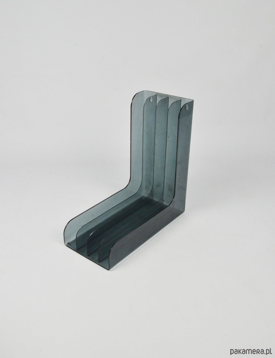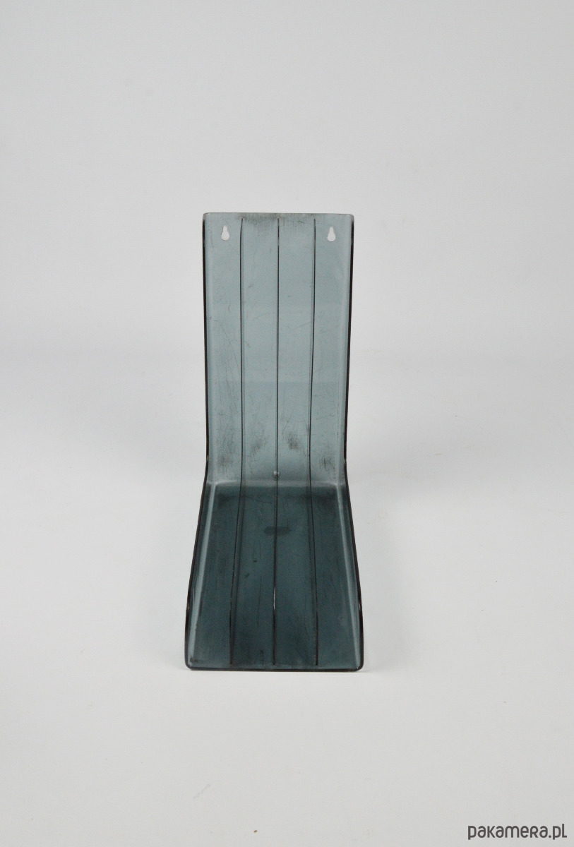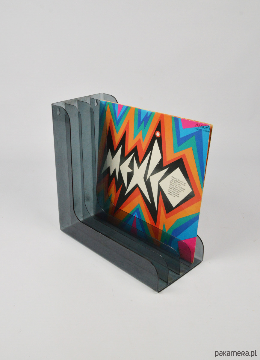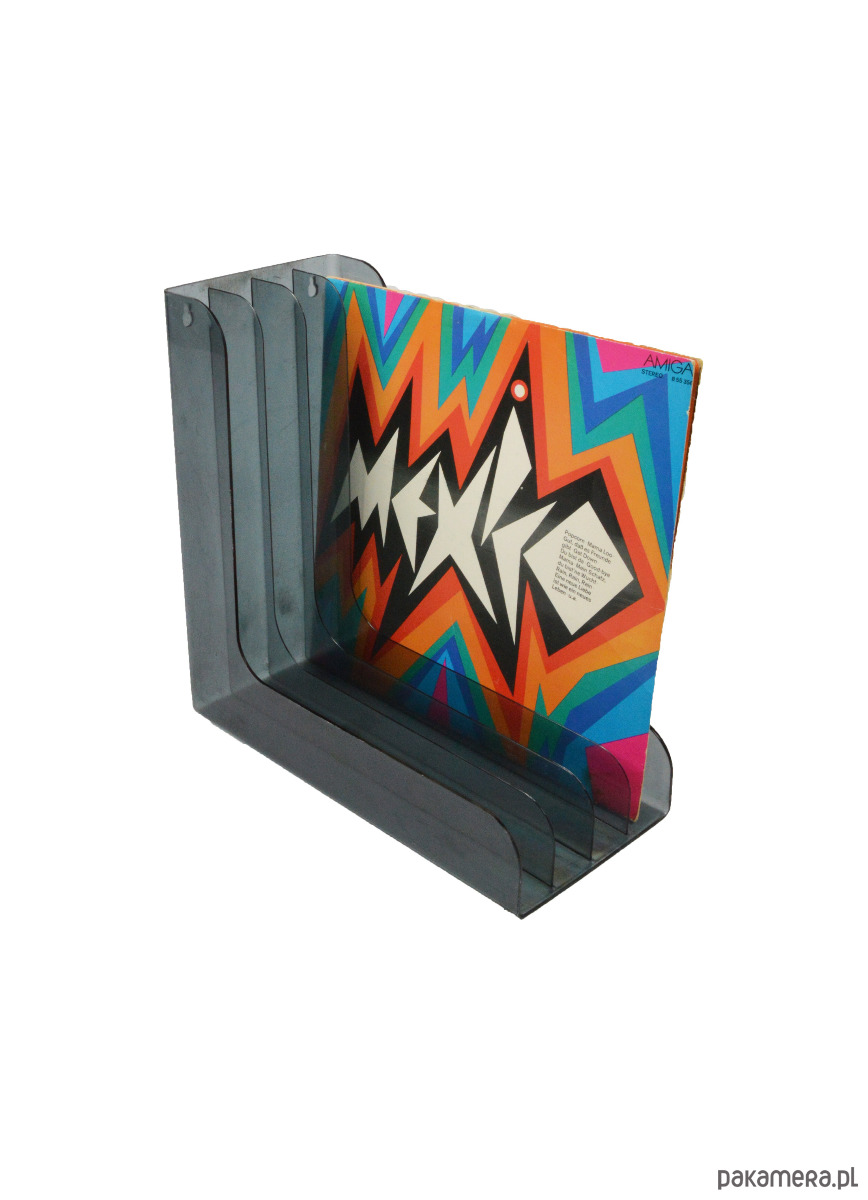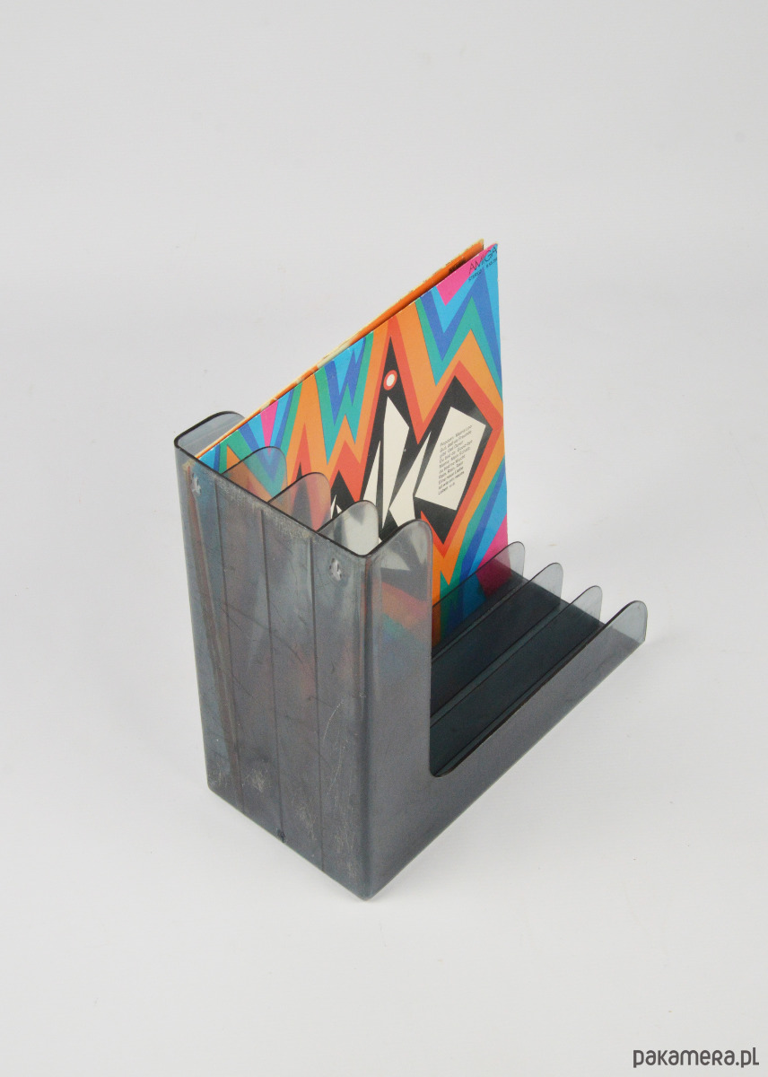 Stojak na płyty winylowe z lat 70, wykonany z tworzywa sztucznego. Posiada otwory, pozwalające na powieszenie go na ścianie. Stan zachowania dobry, widoczne rysy i przetarcia.