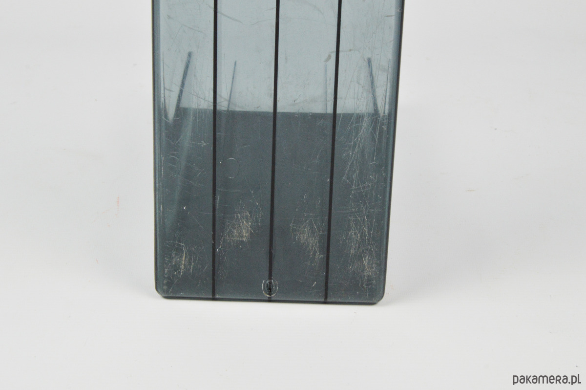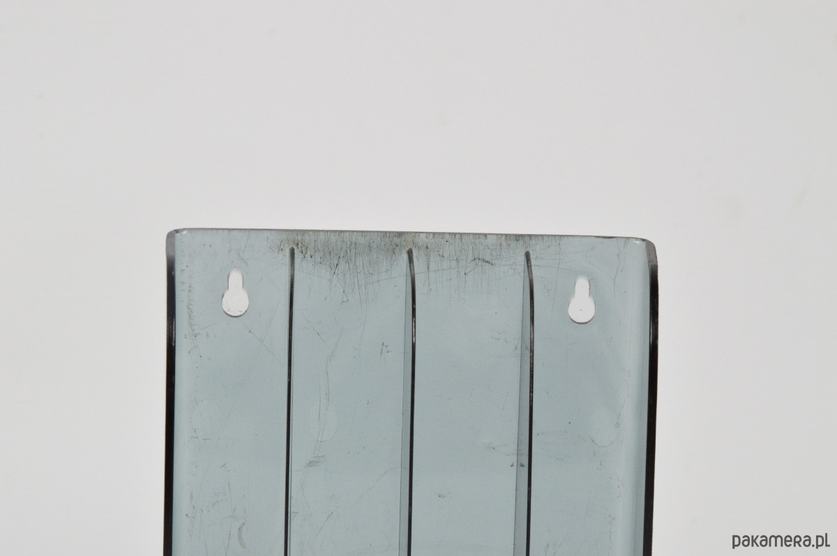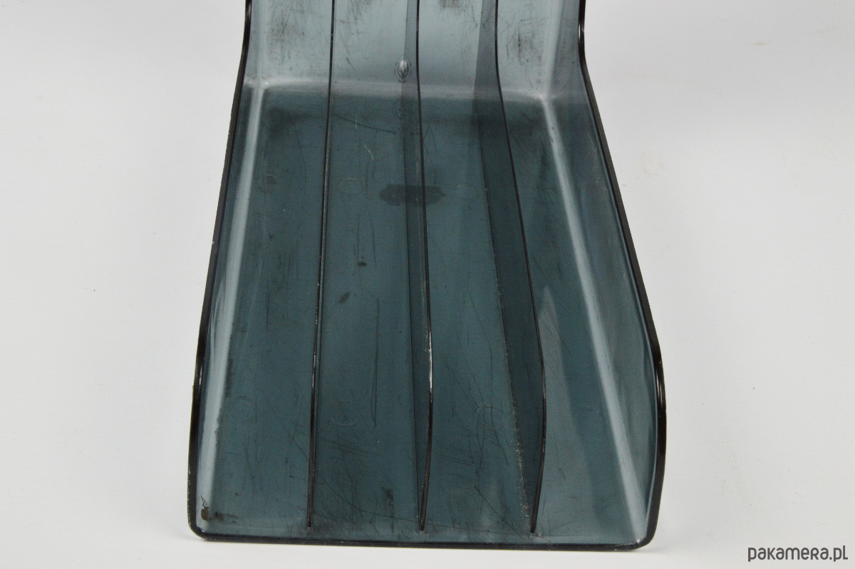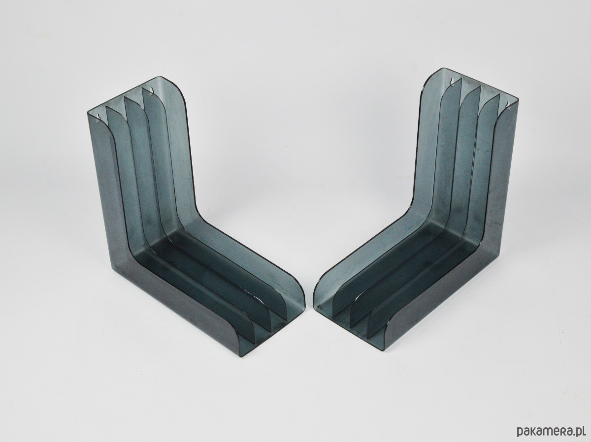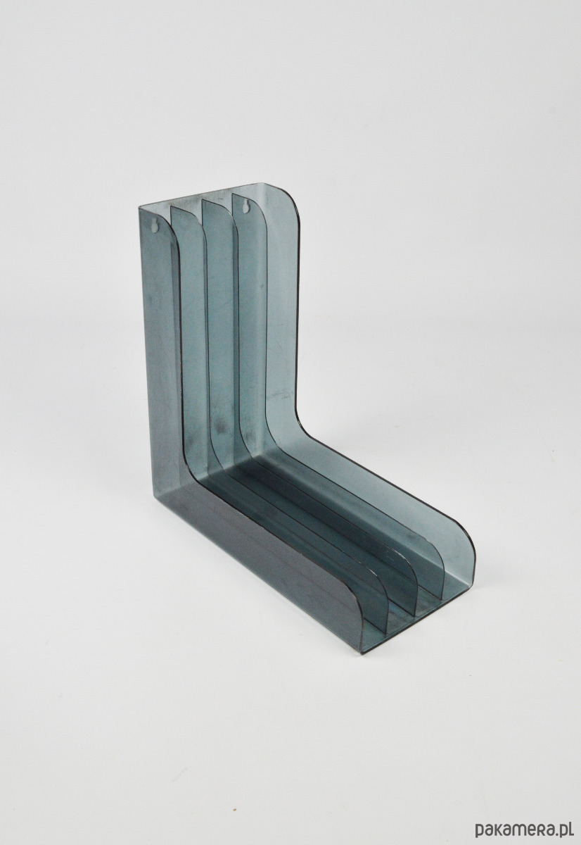 Stojak na płyty winylowe z lat 70, wykonany z tworzywa sztucznego. Posiada otwory, pozwalające na powieszenie go na ścianie. Stan zachowania dobry, widoczne rysy i przetarcia.