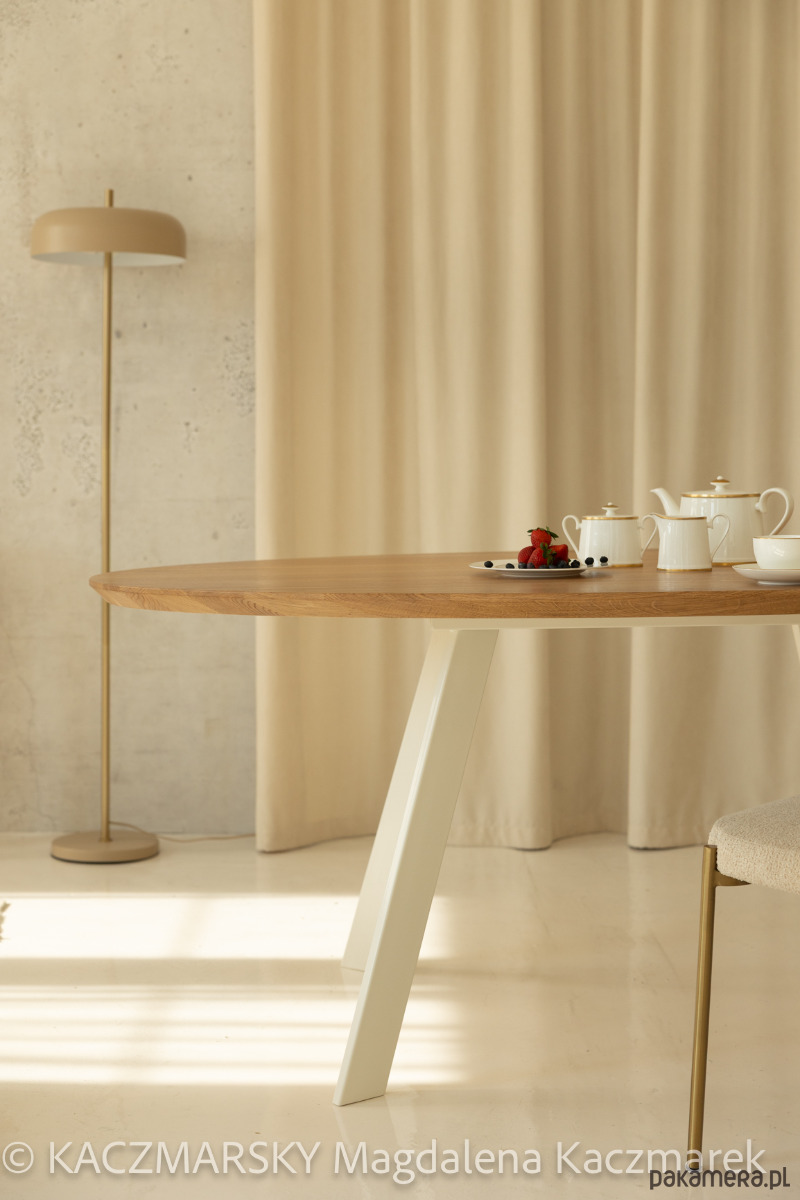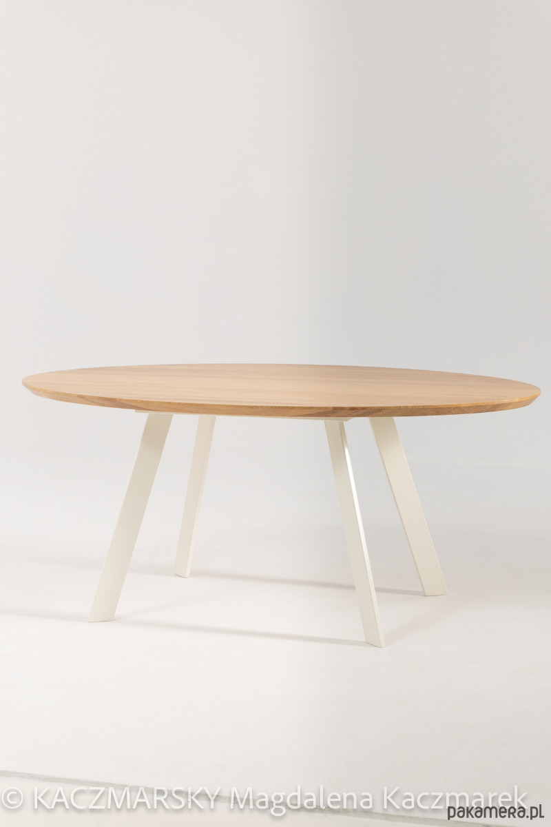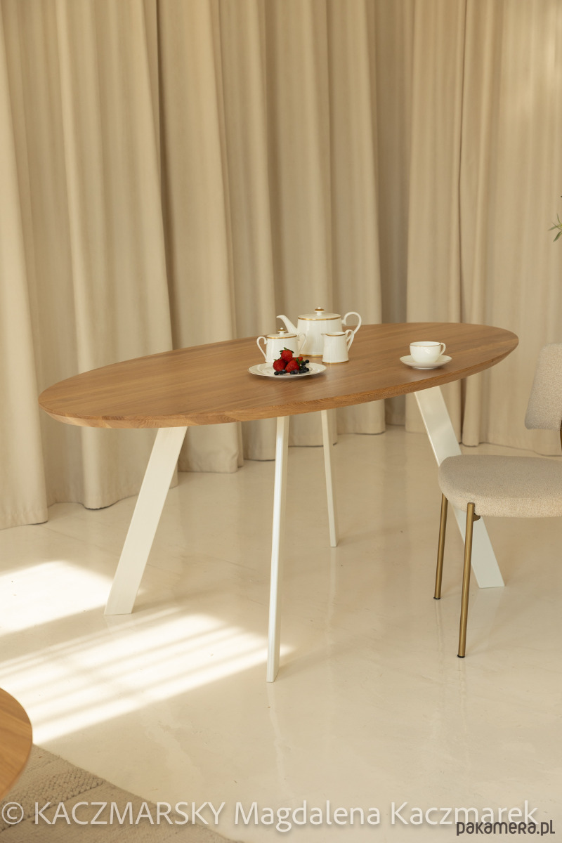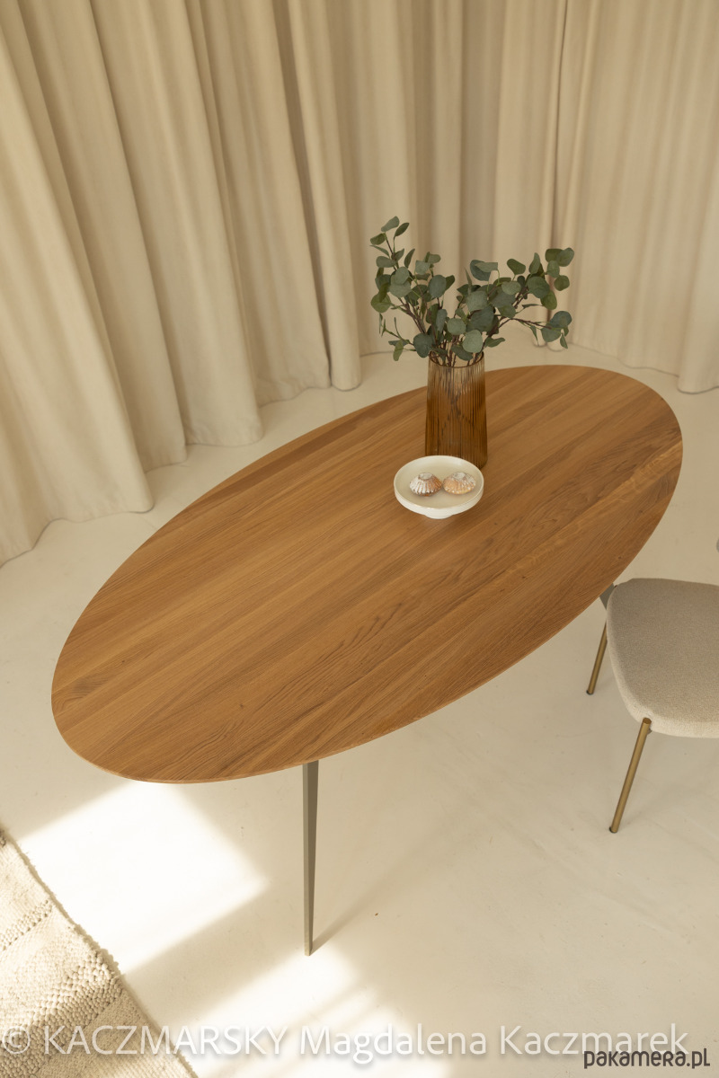 Nowoczesny stół z dębowym blatem w kształcie elipsy idealne uzupełnienie eleganckiego, nowoczesnego wnętrza. Wykonany z Polskiego dębu najwyższej jakości, grubość 4 cm . Blat jest podcięty, co nadaje mu optycznej lekkości. Stół na solidnej ramie stalowej z dospawanymi nogami.