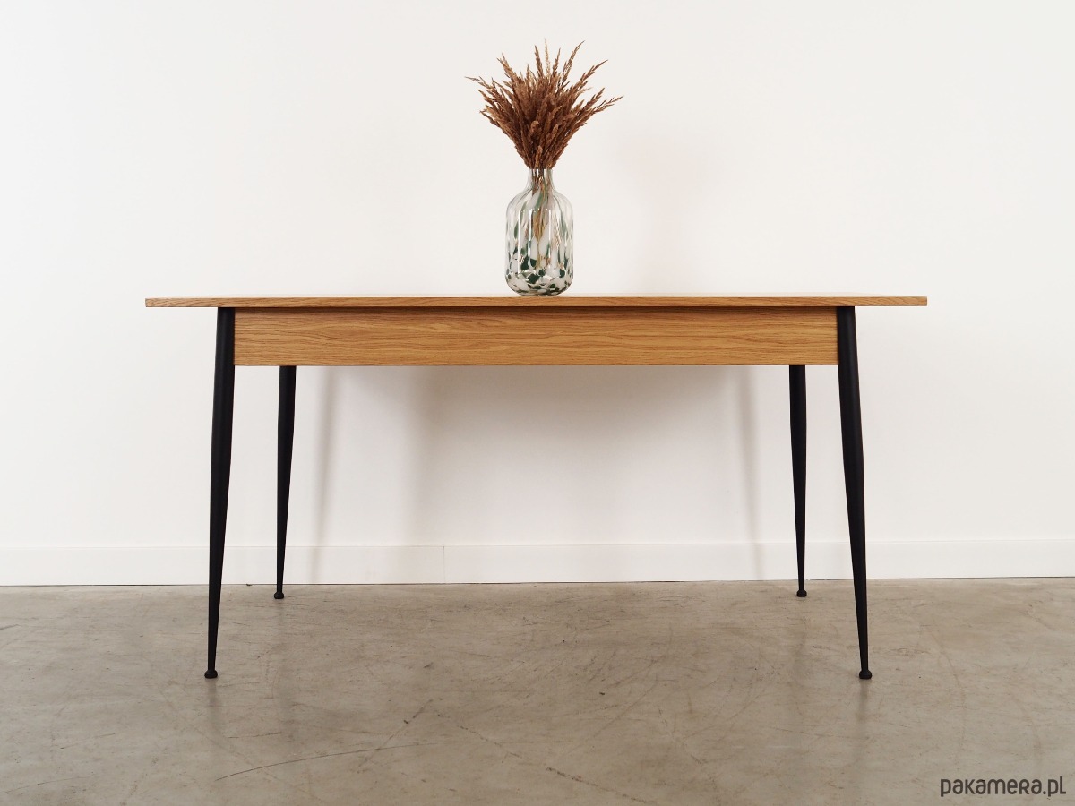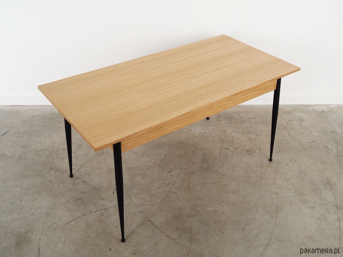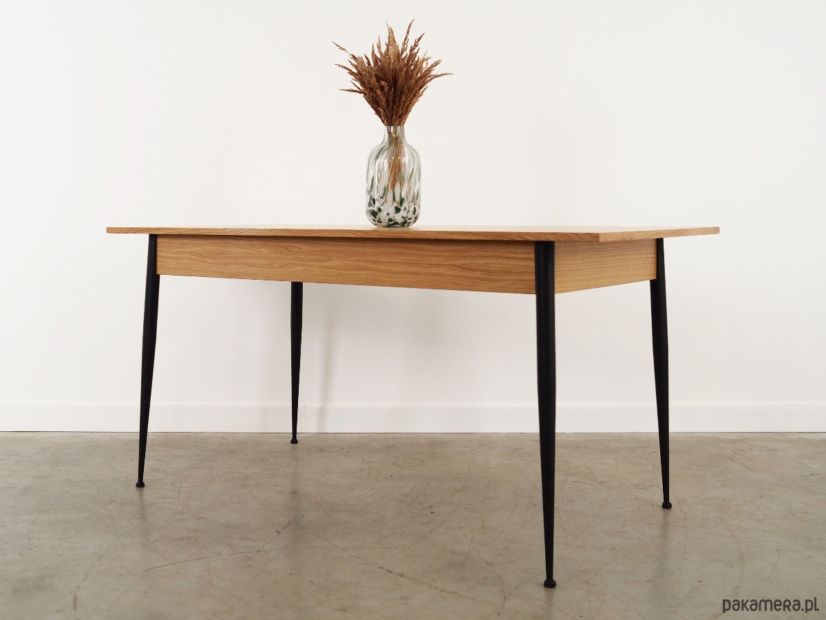 Konstrukcja oraz blat stołu pokryte są fornirem dębowym. Nogi zostały wykonane z metalu. Powierzchnia po odświeżeniu.