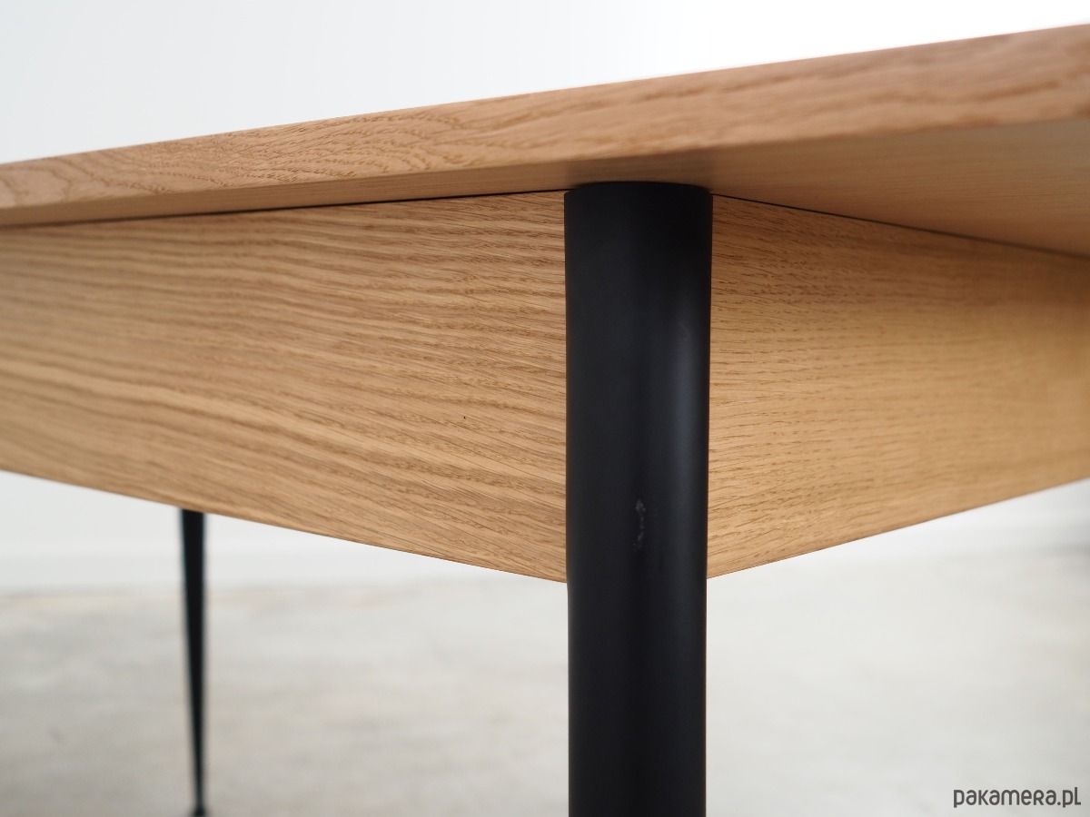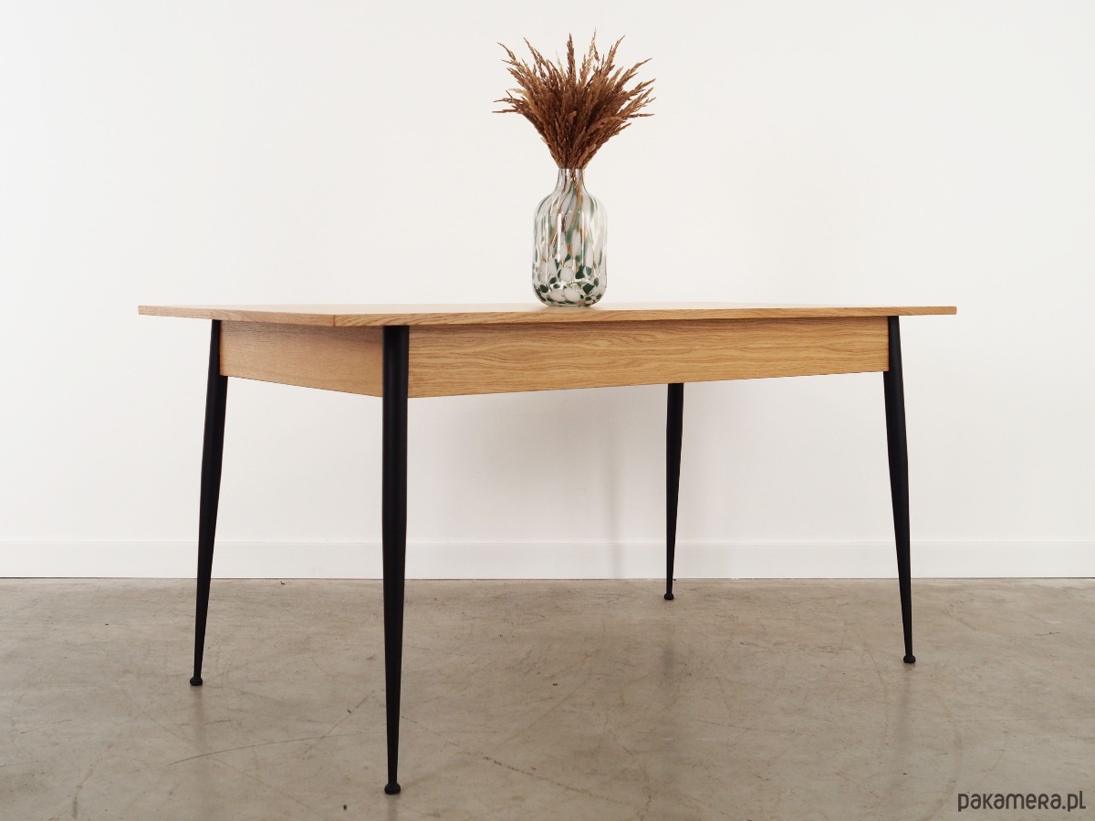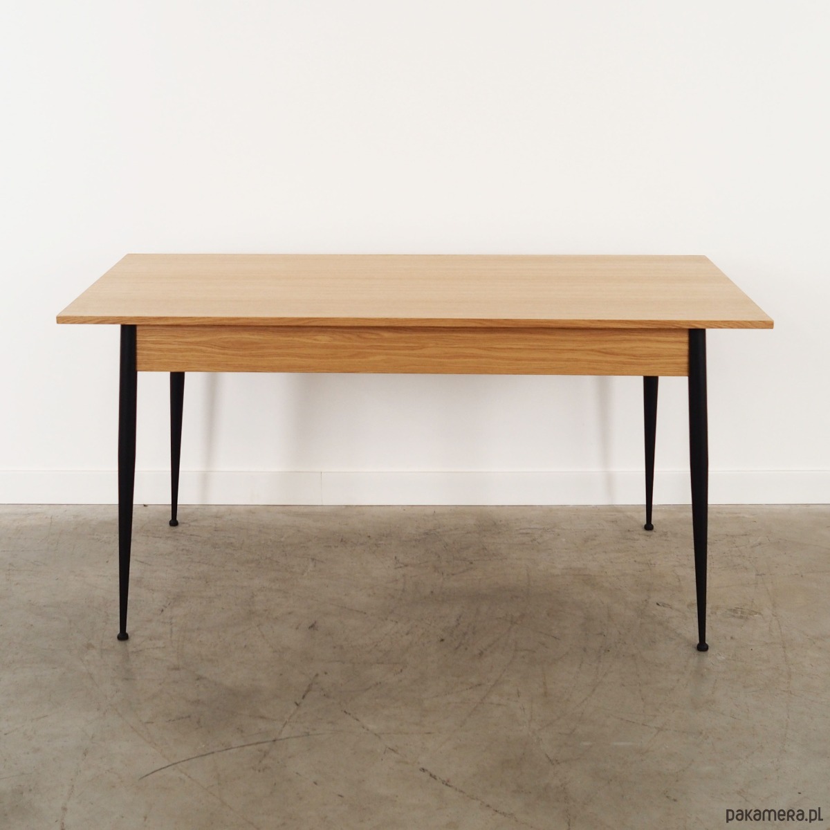 Konstrukcja oraz blat stołu pokryte są fornirem dębowym. Nogi zostały wykonane z metalu. Powierzchnia po odświeżeniu.