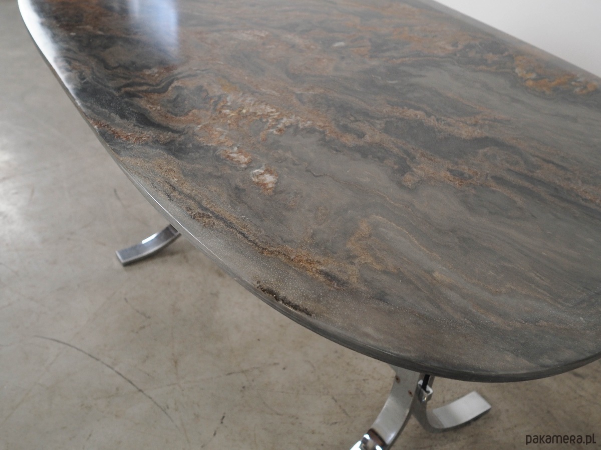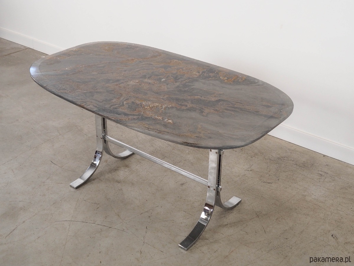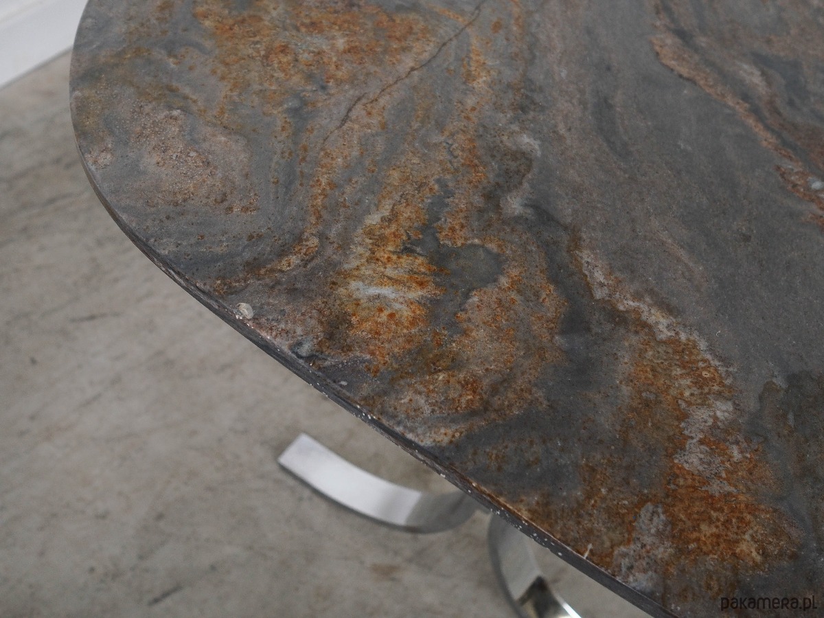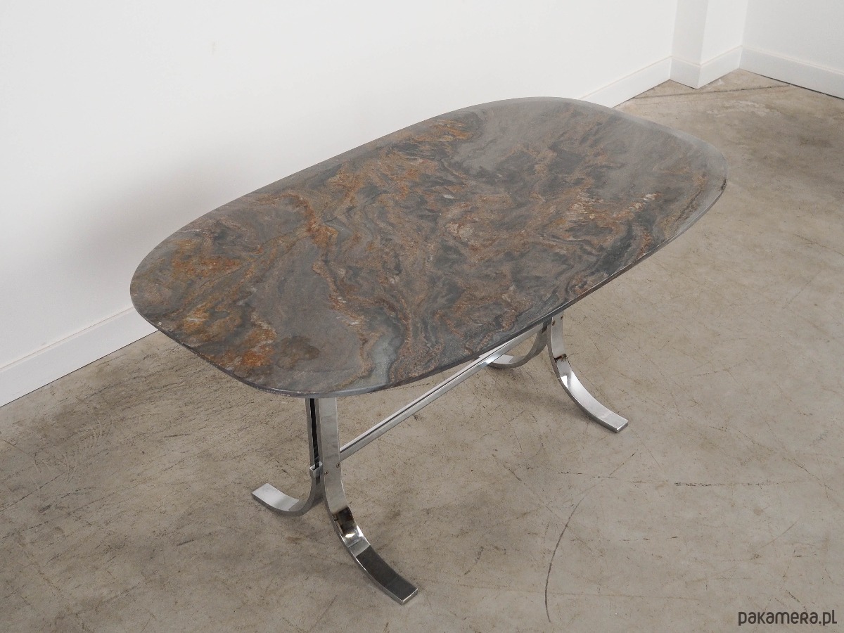 Blat stołu wykonany został z kamienia, nogi z metalu chromowanego. Powierzchnia po odświeżeniu.