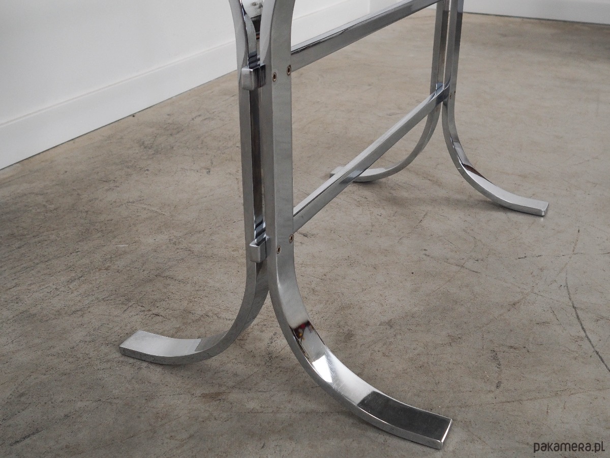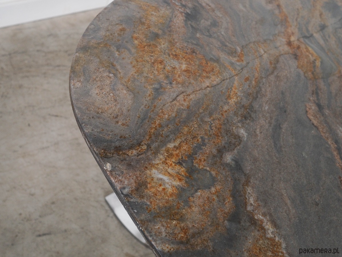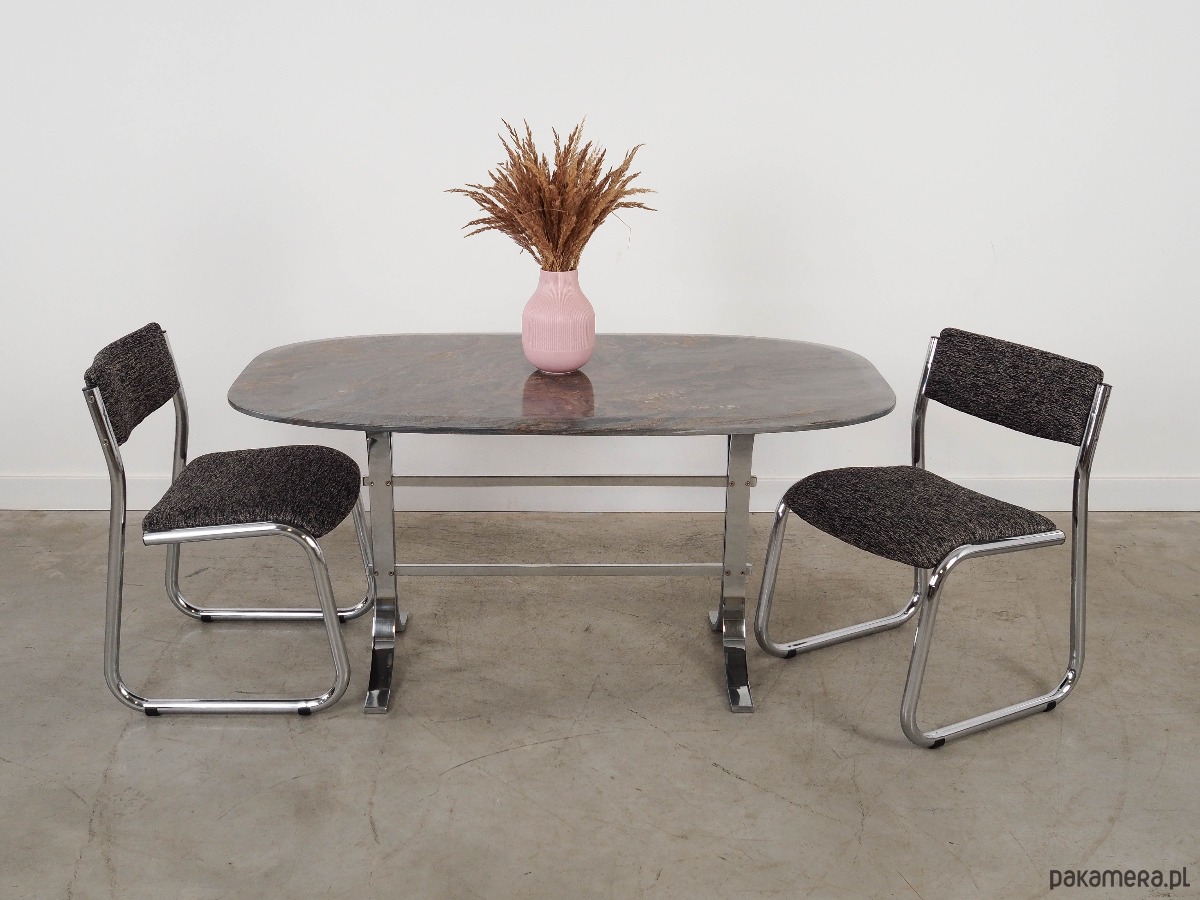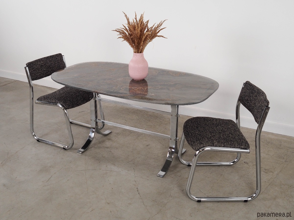 Blat stołu wykonany został z kamienia, nogi z metalu chromowanego. Powierzchnia po odświeżeniu.