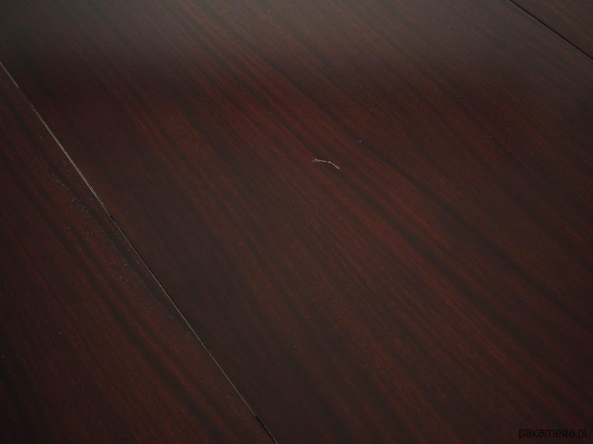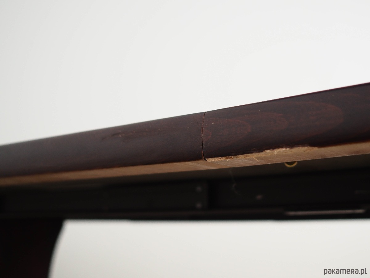 Blat stołu pokryty jest fornirem mahoniowym. Nogi zostały wykonane z litego drewna, perfekcyjnie wkomponowane w ramę stołu. Powierzchnia po odświeżeniu. Stół posiada opcję rozłożenia blatu. Konstrukcja stołu została zaprojektowana tak, aby dodatkowe wkładki były solidnym i stabilnym przedłużeniem blatu głównego. W komplecie cztery wkładki.