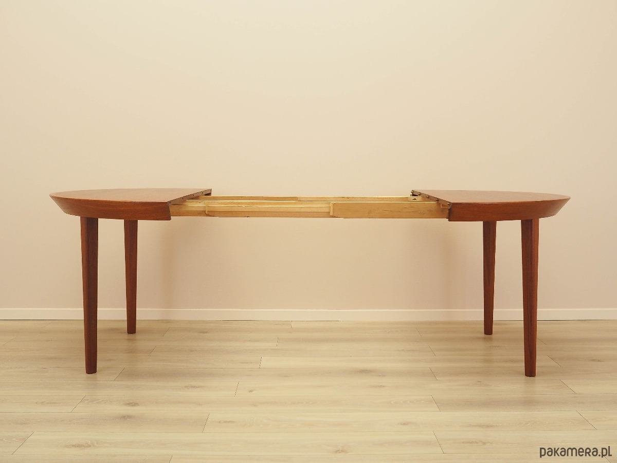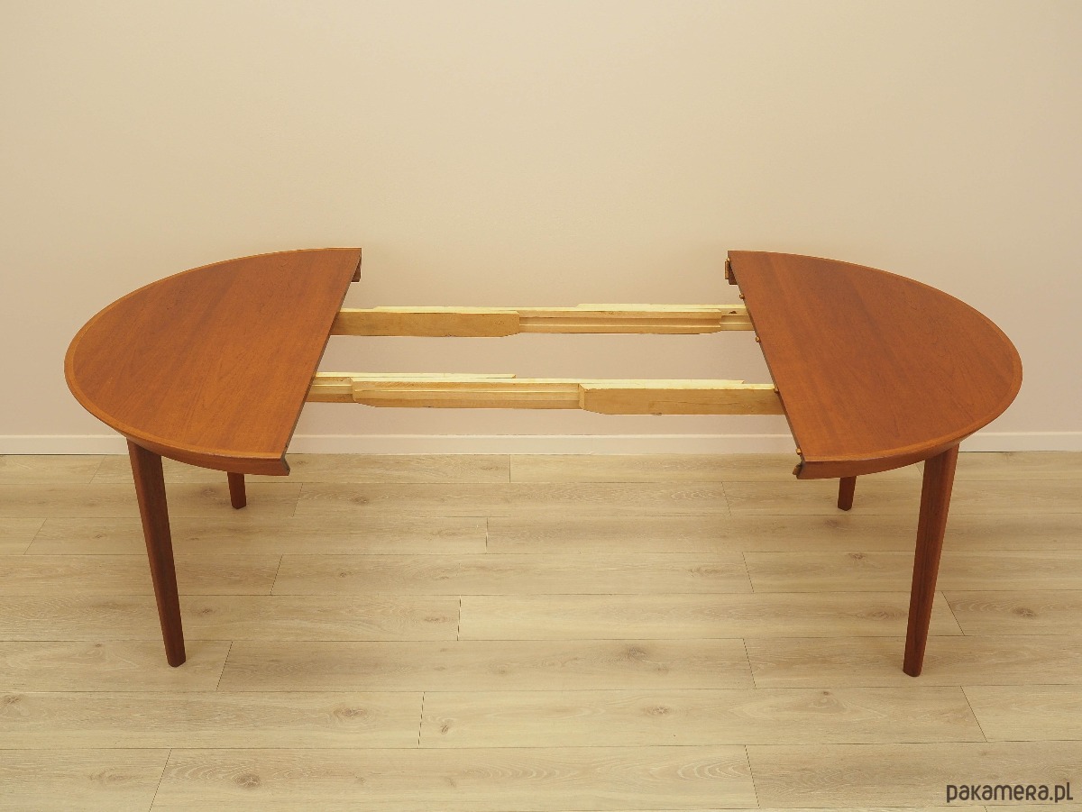 Blat stołu pokryty jest fornirem tekowym. Nogi zostały wykonane z litego drewna, perfekcyjnie wkomponowane w ramę stołu. Powierzchnia po odświeżeniu. Stół posiada opcję rozłożenia blatu. Brak wkładek w zestawie.