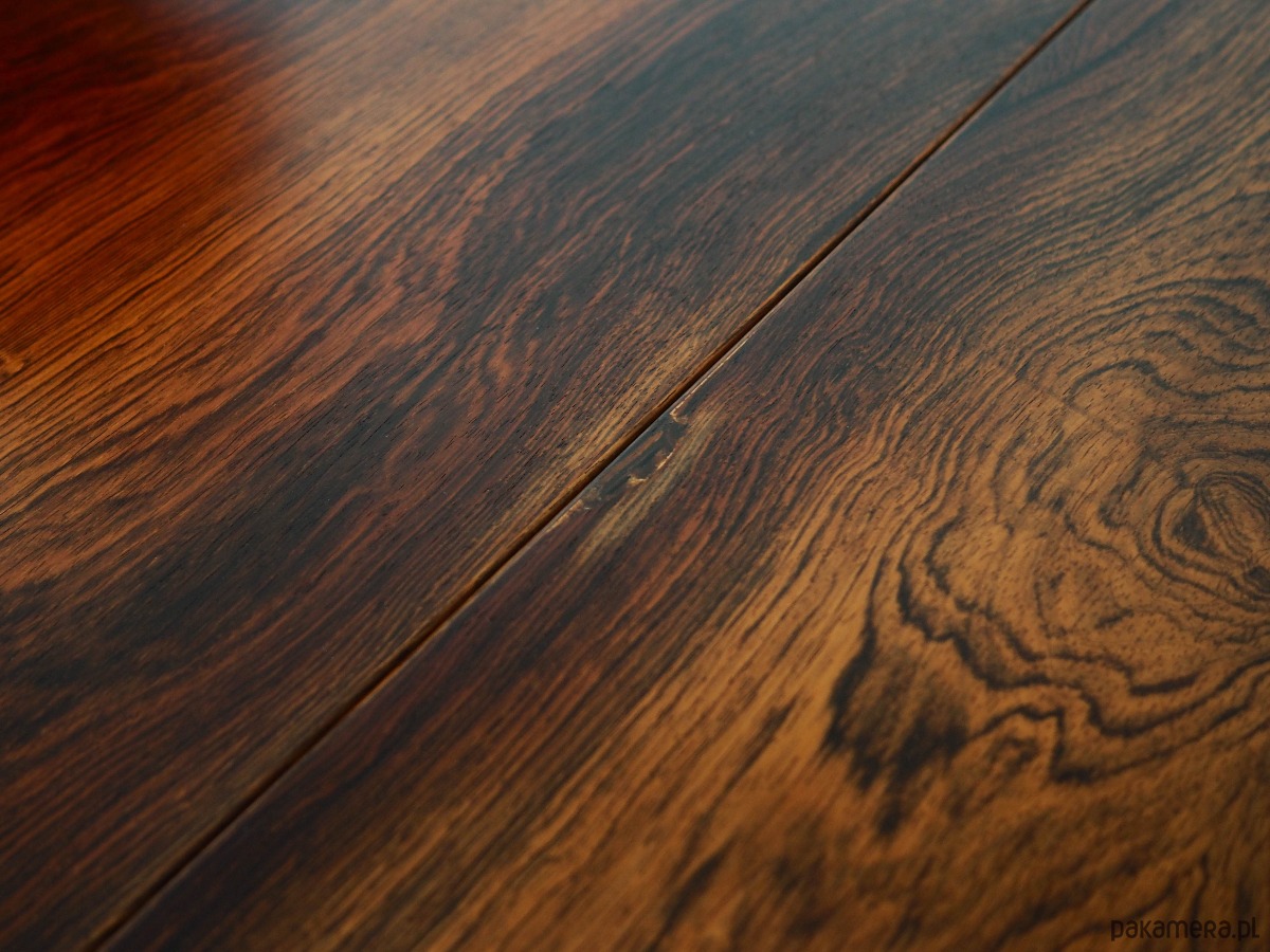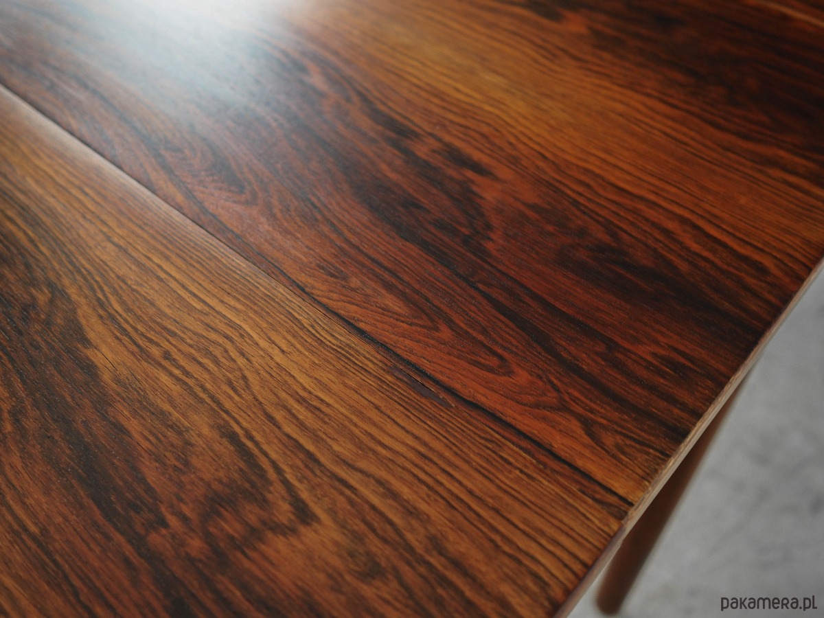 Konstrukcja i blat stołu pokryte zostały fornirem palisandrowym. Nogi wykonane z litego drewna palisandrowego. Powierzchnia po odświeżeniu. Stół posiada możliwość rozłożenia poprzez podniesienie jednej lub obu przedłużek. Konstrukcja stołu została zaprojektowana tak, aby rozkładane elementy były solidnym i stabilnym przedłużeniem blatu głównego. Ponadto stół posiada opcję wydłużenia blatu poprzez rozsunięcie. Jedna wkładka w zestawie.
