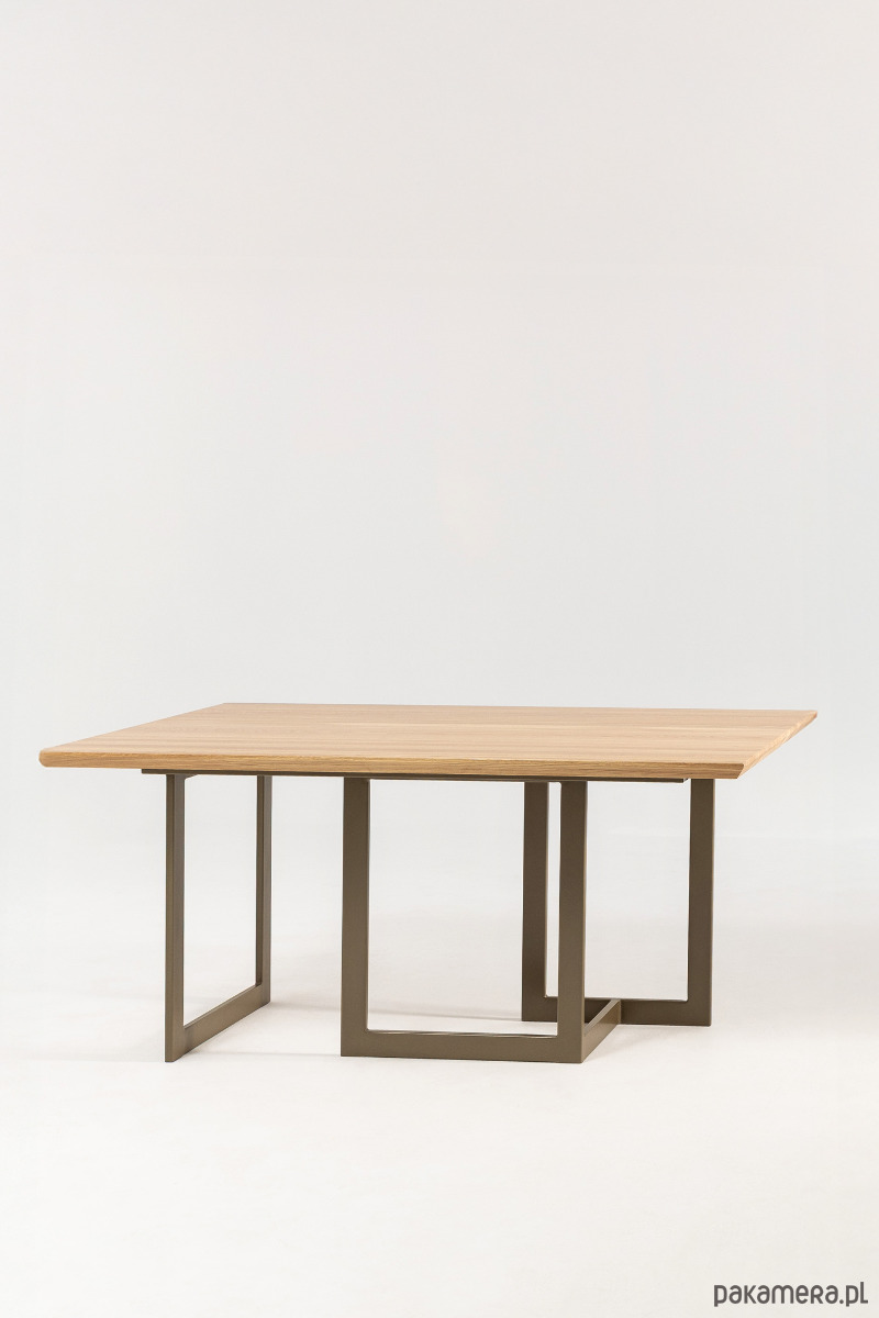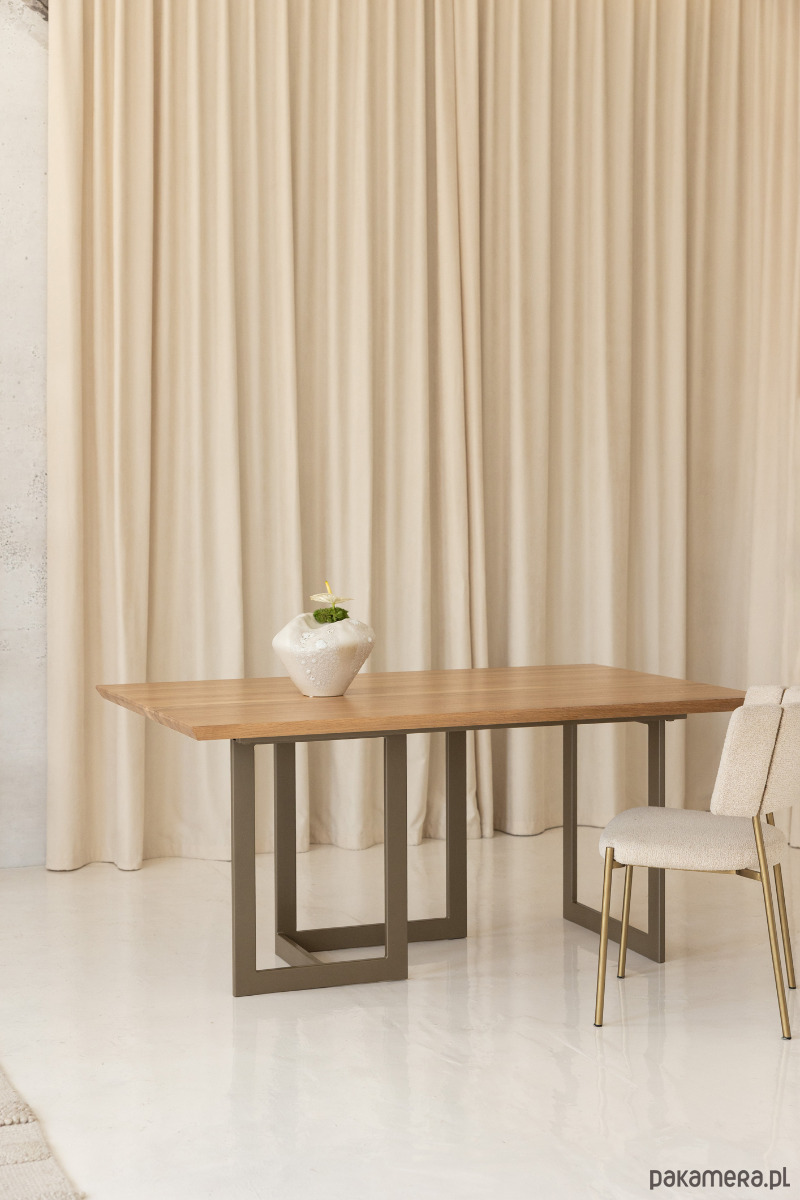 Podstawa wykonana z malowanej proszkowo stali, modnej kolorystyce do złudzenia przypominającej odcień skóry - to RAL 7006 - a jego konstrukcja jest przyjazna krzesłom.