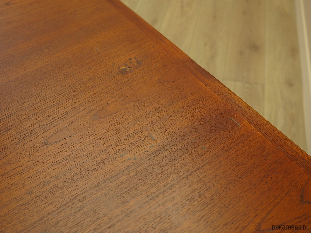 Konstrukcja oraz blat stołu pokryte są fornirem tekowym. Nogi, perfekcyjnie wkomponowane w ramę stołu, zostały wykonane z litego drewna. Powierzchnia po odświeżeniu. Stół posiada opcję rozłożenia blatu. Konstrukcja stołu została zaprojektowana tak, aby dodatkowe wkładki były solidnym i stabilnym przedłużeniem blatu głównego. W komplecie dwie wkładki.