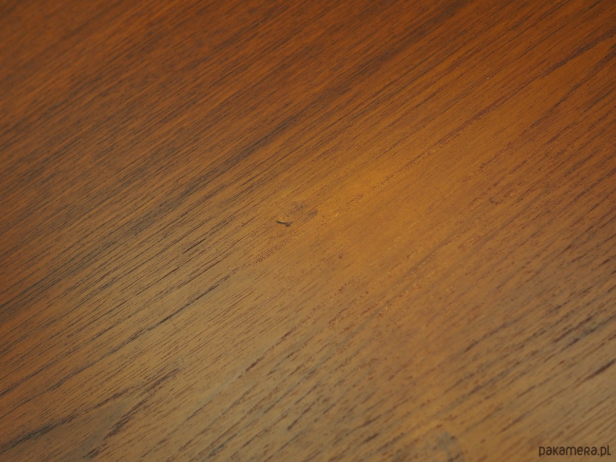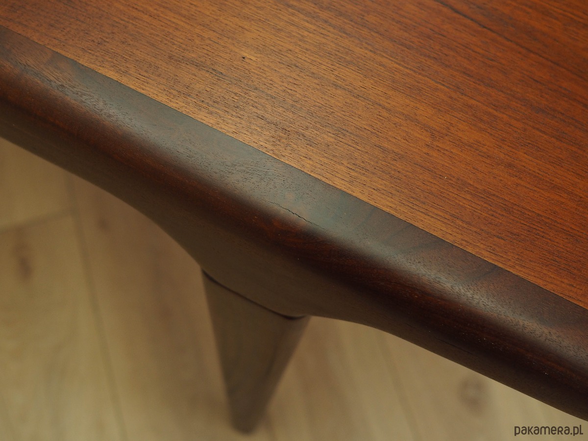 Konstrukcja i blat stołu pokryte są fornirem tekowym. Nogi wykonane z litego drewna. Powierzchnia po odświeżeniu. Stół posiada opcję rozłożenia blatu. Konstrukcja stołu została zaprojektowana tak, aby dodatkowa wkładka były solidnym i stabilnym przedłużeniem blatu głównego. Wkładka w komplecie.