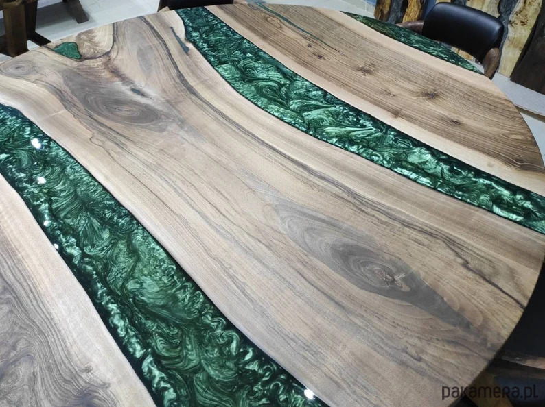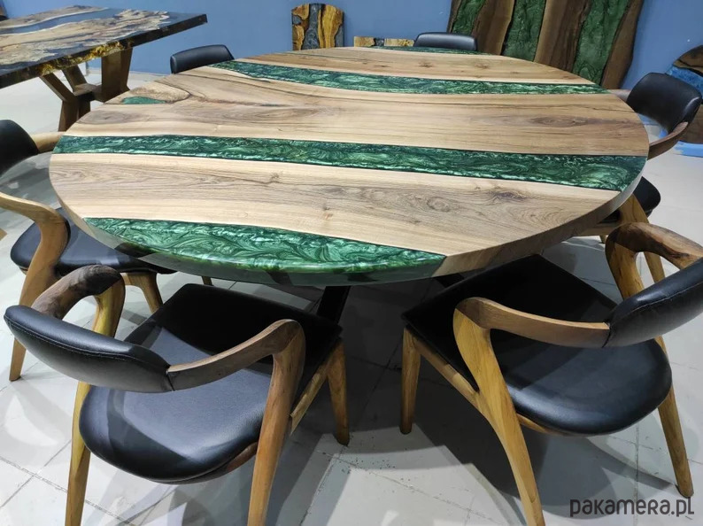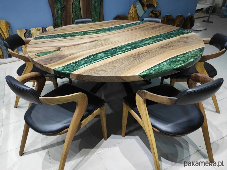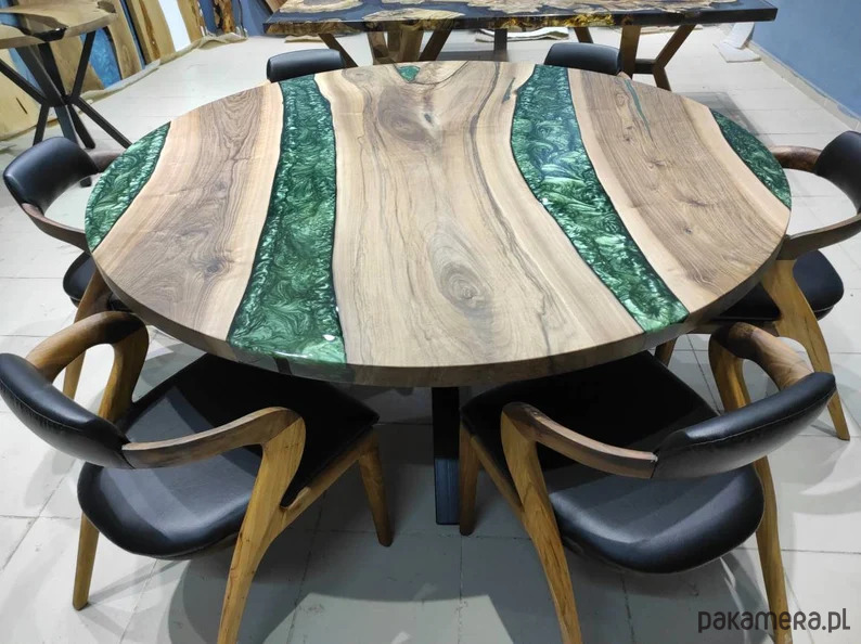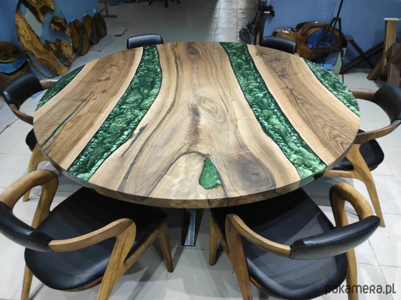 okrągły stół z żywicy epoksydowej, żywica koloru zielonego perłowego, drewno użyte do powyższego stołu to 80 - letni orzech włoski