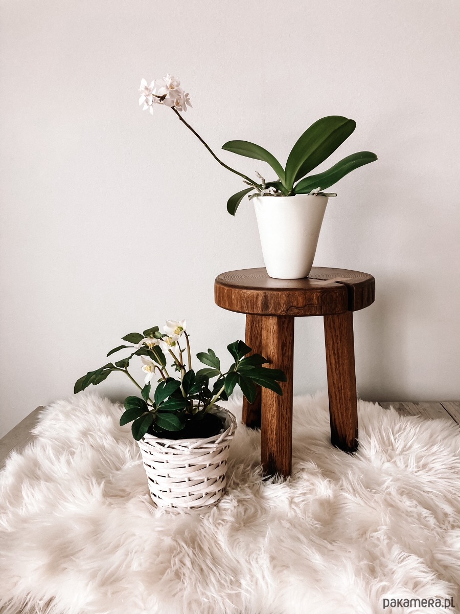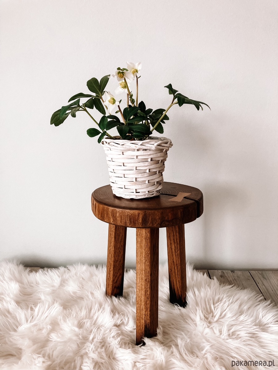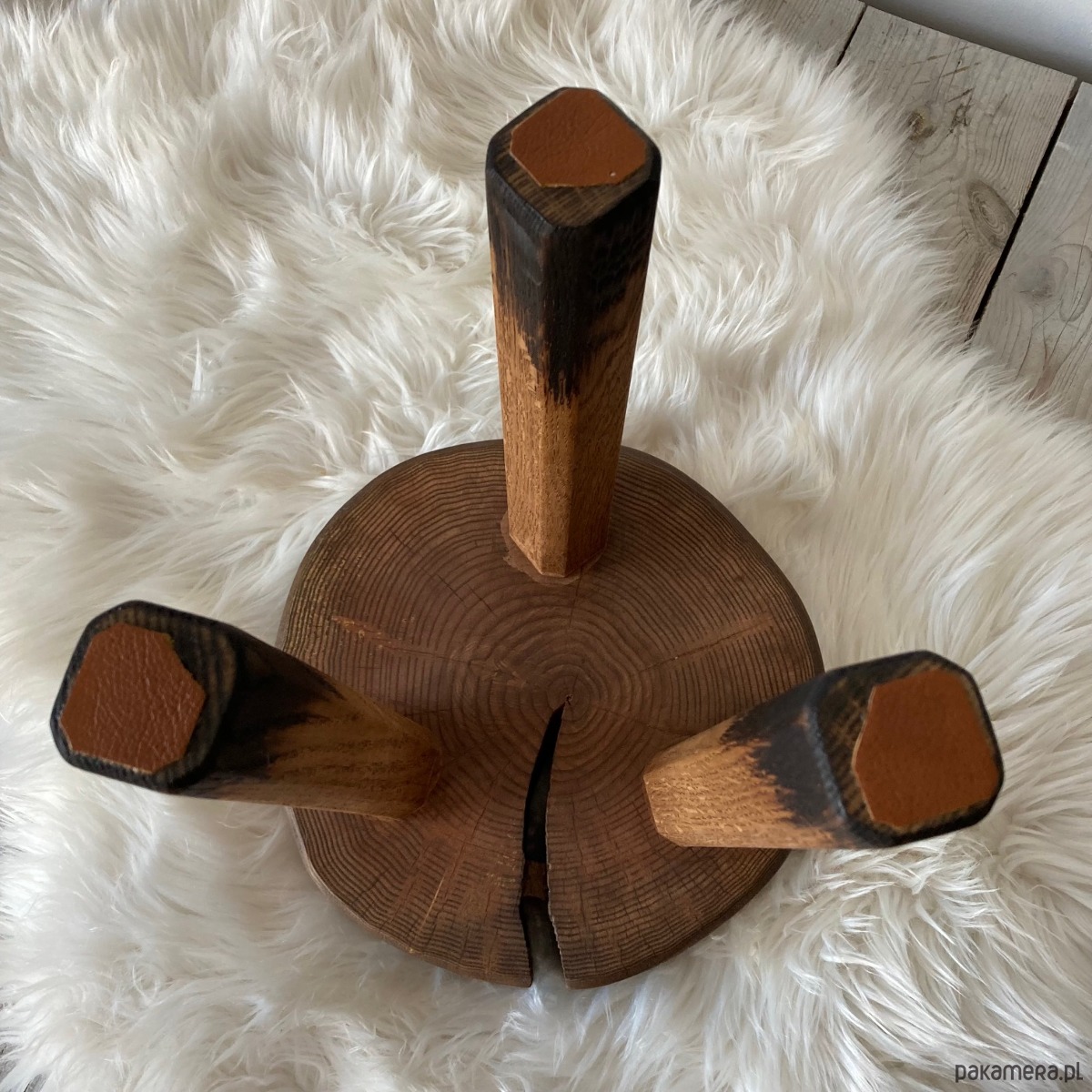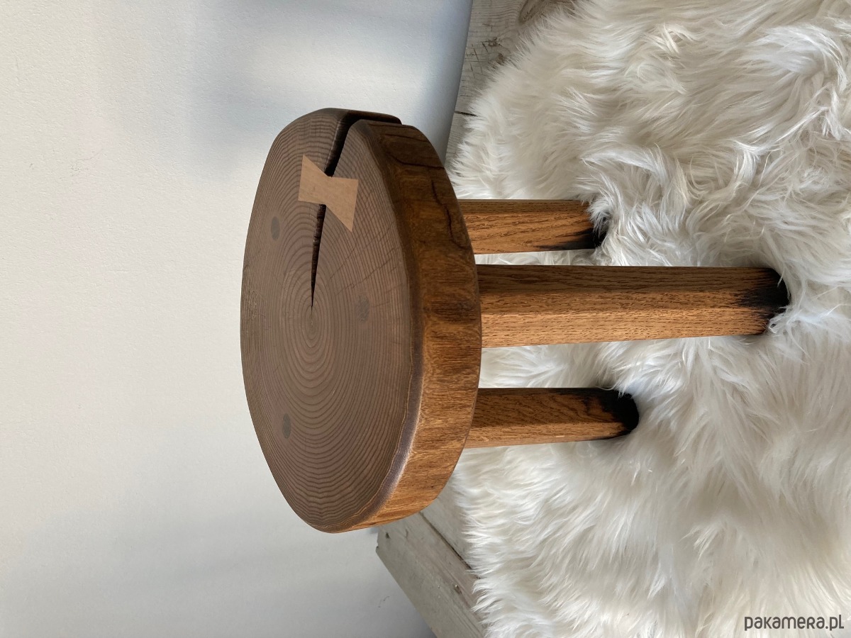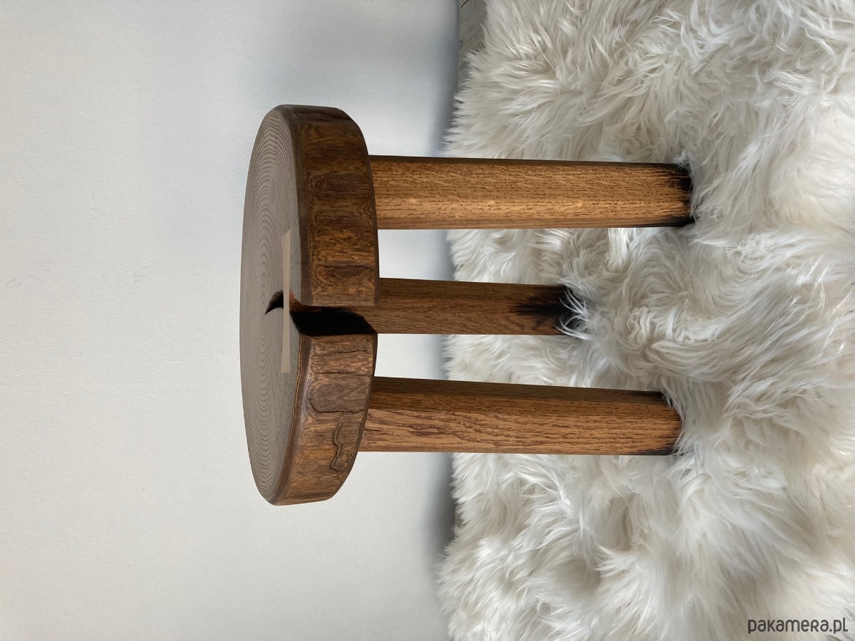 Stołek drewniany mały, trójnogi. Blat jest wykonany z drewna jesionowego a nóżki są dębowe. Charakterystyczne są w nim podpalenia nóżek oraz łączenie pęknięcia w blacie. Kolor ciemny. Nóżki zostały zabezpieczone skórą naturalną, żeby nie rysować powierzchni.