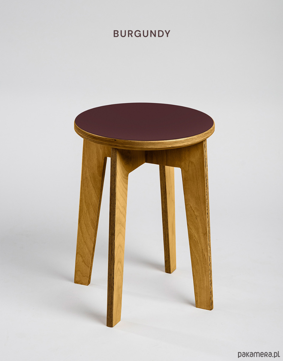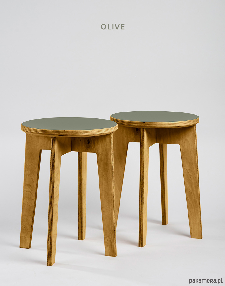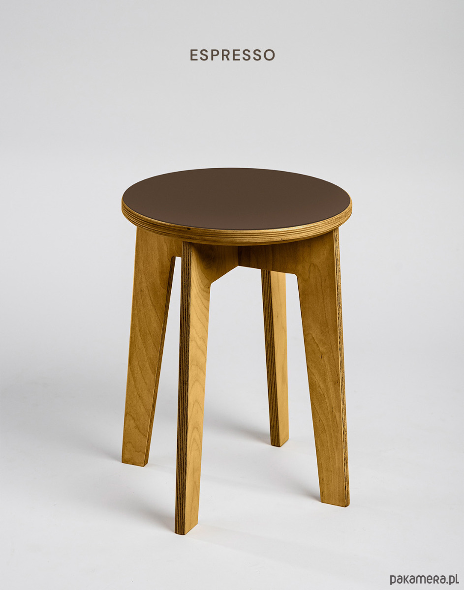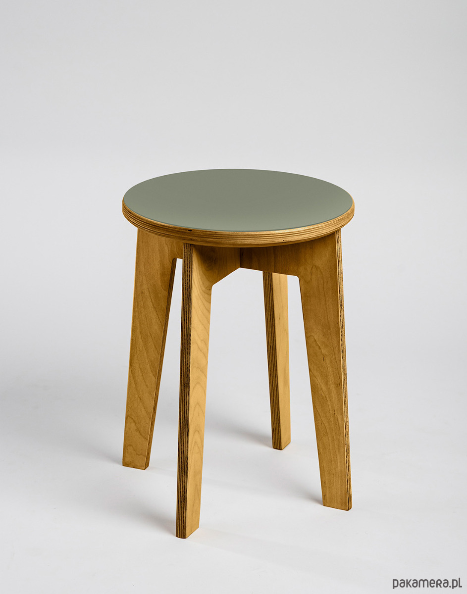Stołek jest w całości wykonany ze sklejki brzozowej, a wykończenie siedziska naturalnym linoleum meblowym niesie doznania zarówno estetyczne, jak i cielesne: poprawia komfort siedzenia. Albo przycupnięcia.