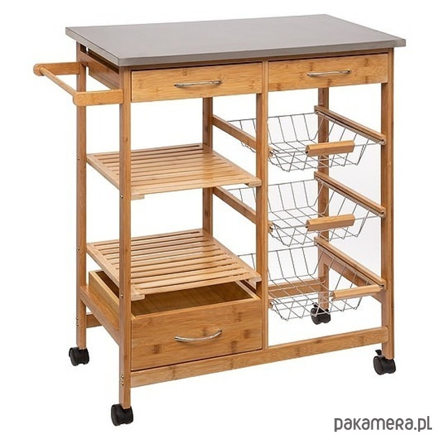 Przedmiotem oferty jest wózek kuchenny. Barek jest wykonany z drewna bambusowego, wysuwane koszyczki są metalowe. Idealny do kuchni, na taras czy balkon. Kółka w barku są plastikowe. Barek jest wysyłany w częściach do samodzielnego montażu.