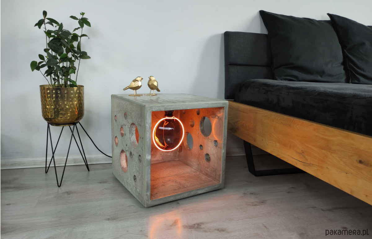 Crystal Shine to betonowy stolik o niezwykłej estetyce, który łączy w sobie nowoczesny design z subtelnym efektem świetlnym. Jego perforowane boki pozwalają na delikatne przenikanie światła, nadając wnętrzu charakteru .