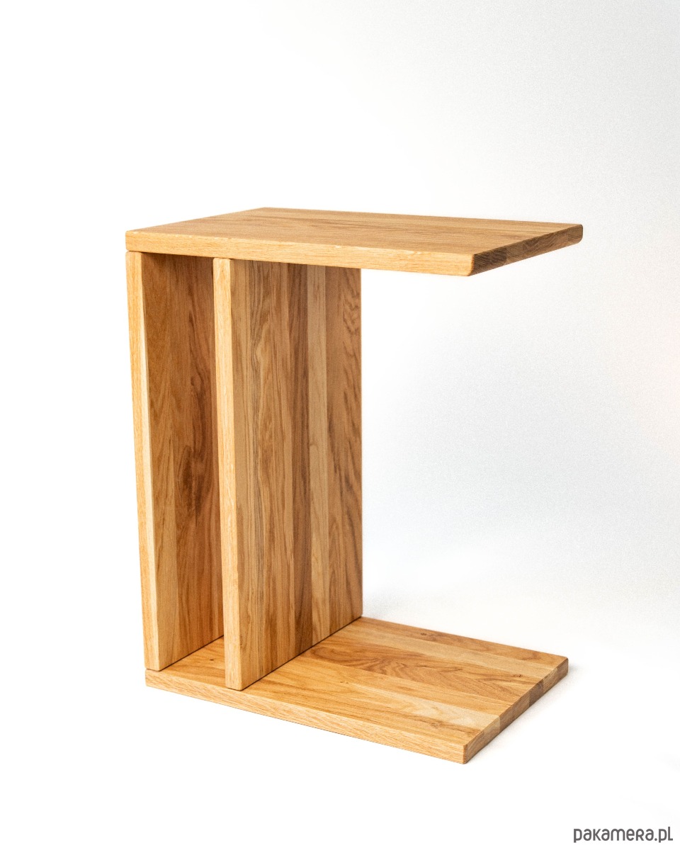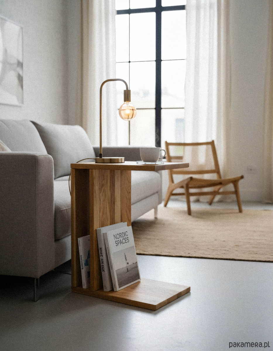 Minimalistyczny stolik boczny z litego drewna łączy praktyczny design, naturalne piękno drewna i subtelnie rzeźbiarską formę. Doskonale sprawdzi się jako stolik przy kanapie, fotelu lub łóżku, wprowadzając do wnętrza ciepło i harmonię.