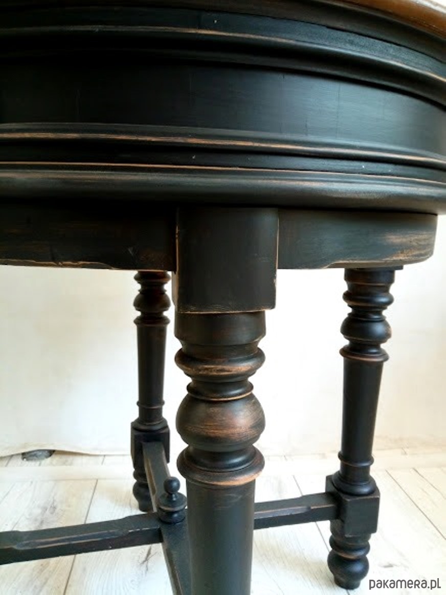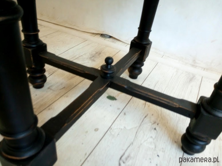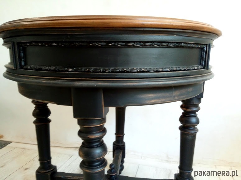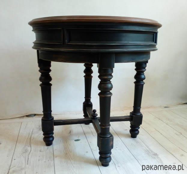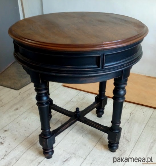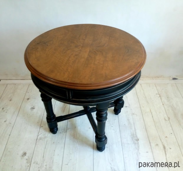 Stolik jest po renowacji, blat wykończony kilkoma warstwami lakieru satynowego, podstawa to piękna czerń z przecierkami do drewna orzechowego.