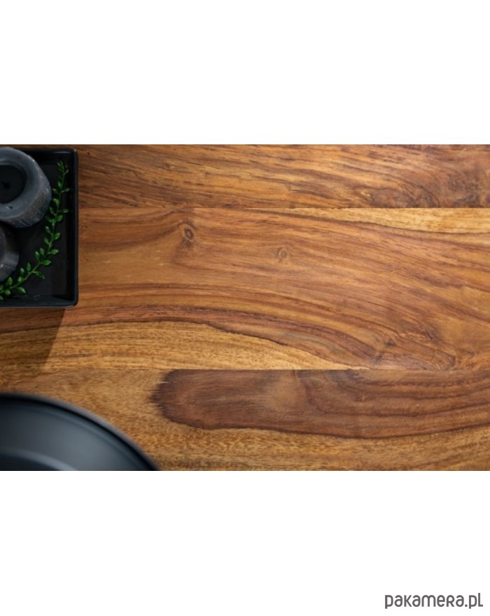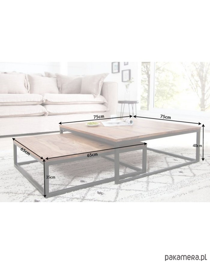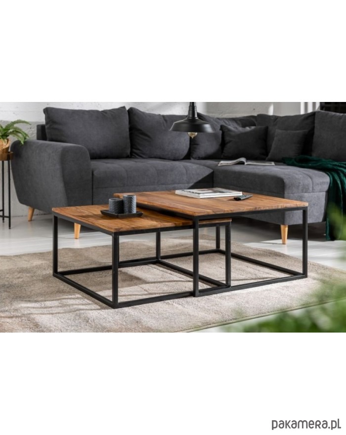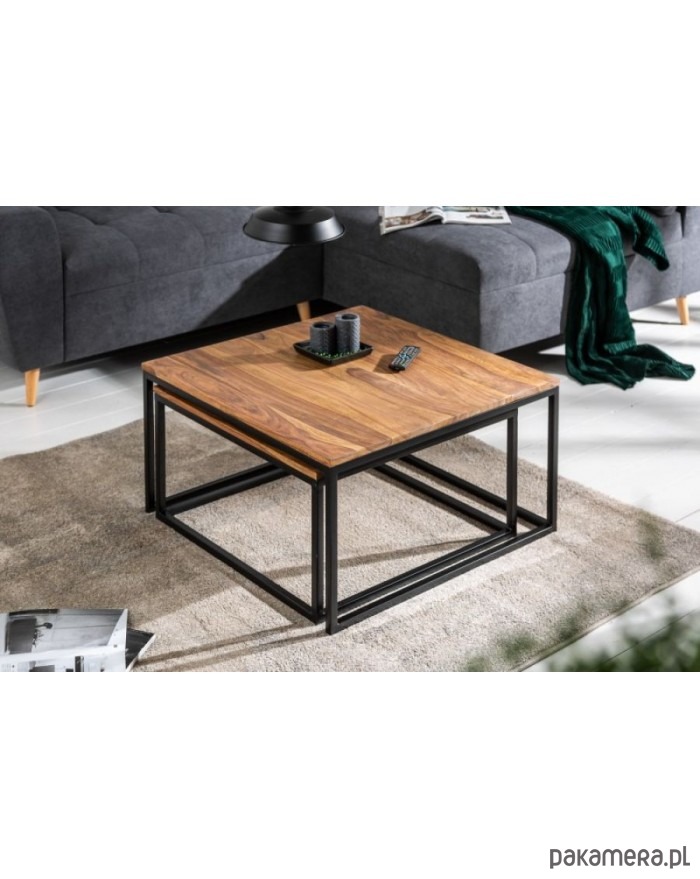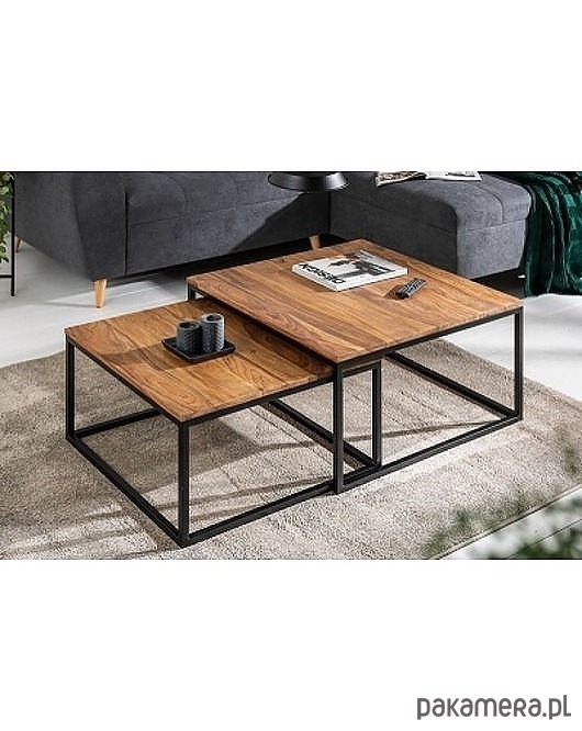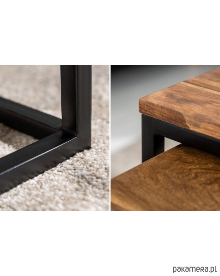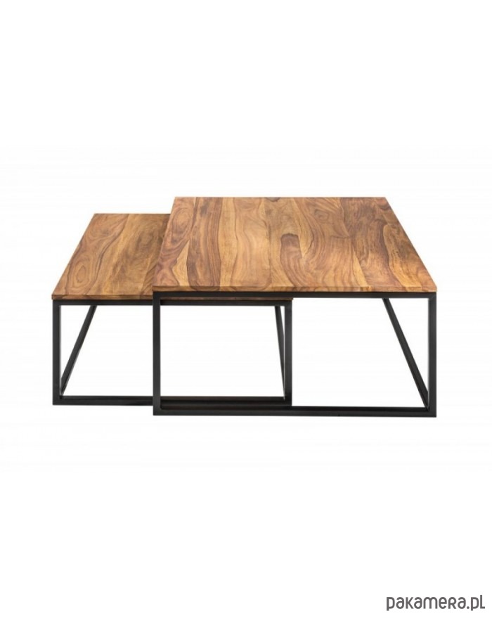 Zestaw dwóch stolików kawowych. Blat wykonany z drewna sheesham, mogą więc występować nierówności, rysy, drobne pęknięcia lub sęki charakterystyczne dla produktu z naturalnego drewna. Stelaż z metalu malowanego proszkowo na kolor czarny. Idealne do wnętrz w stylu industrialnym.