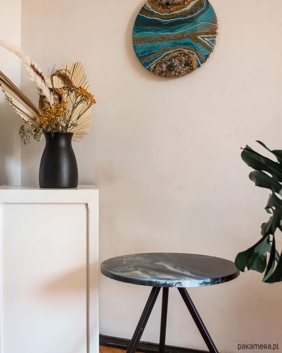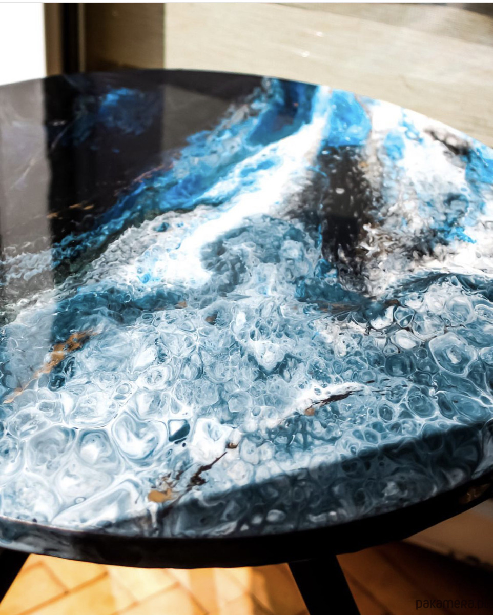 Stolik wykonany z żywicy, na metalowych nogach malowanych proszkowo, wysokość to około 45cm,