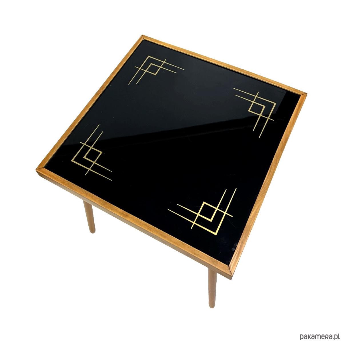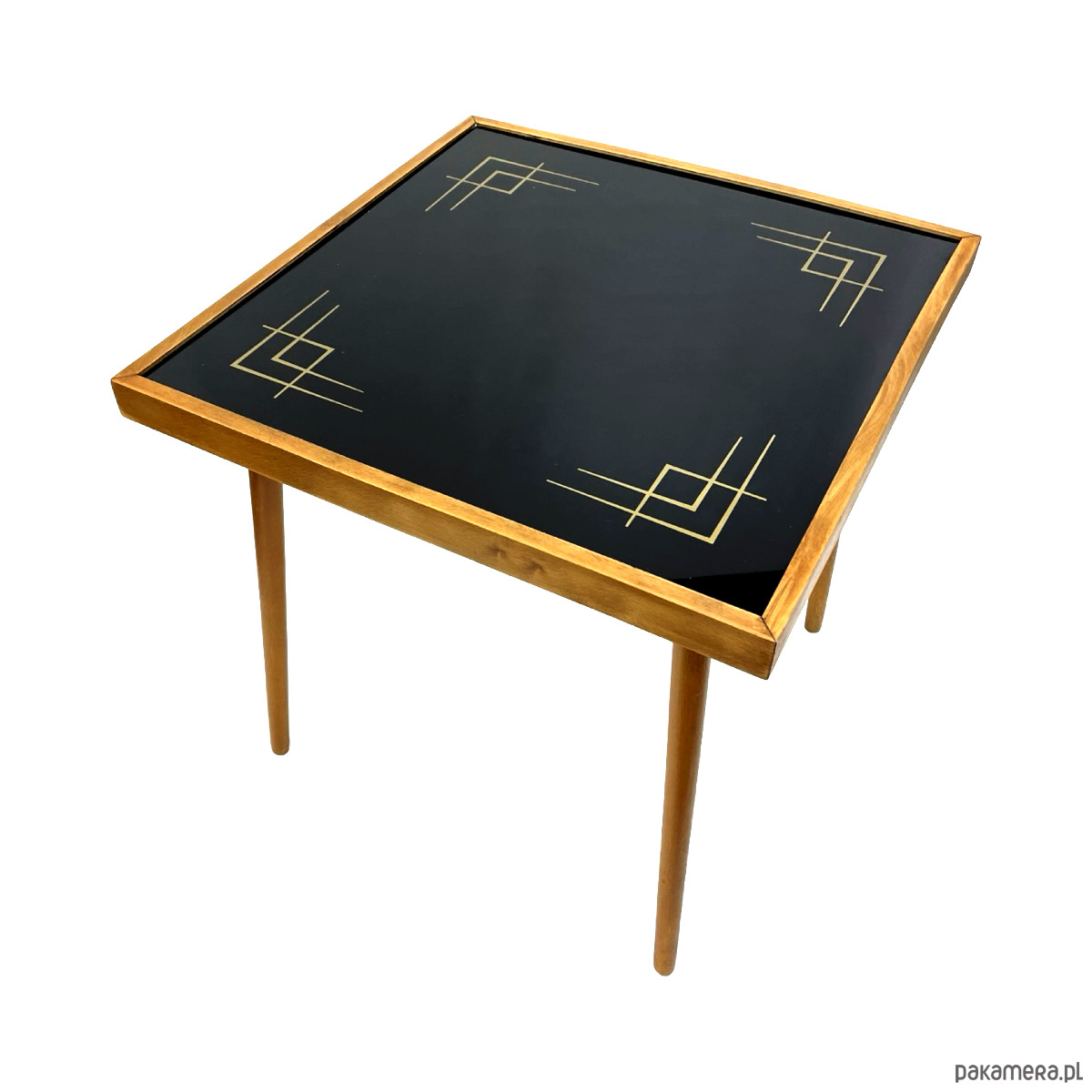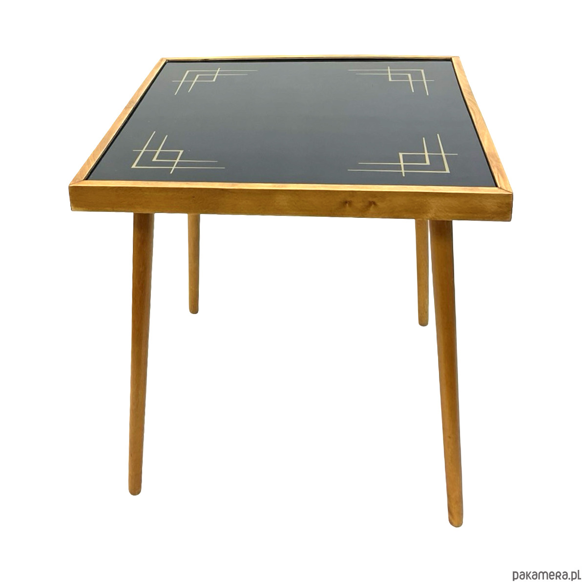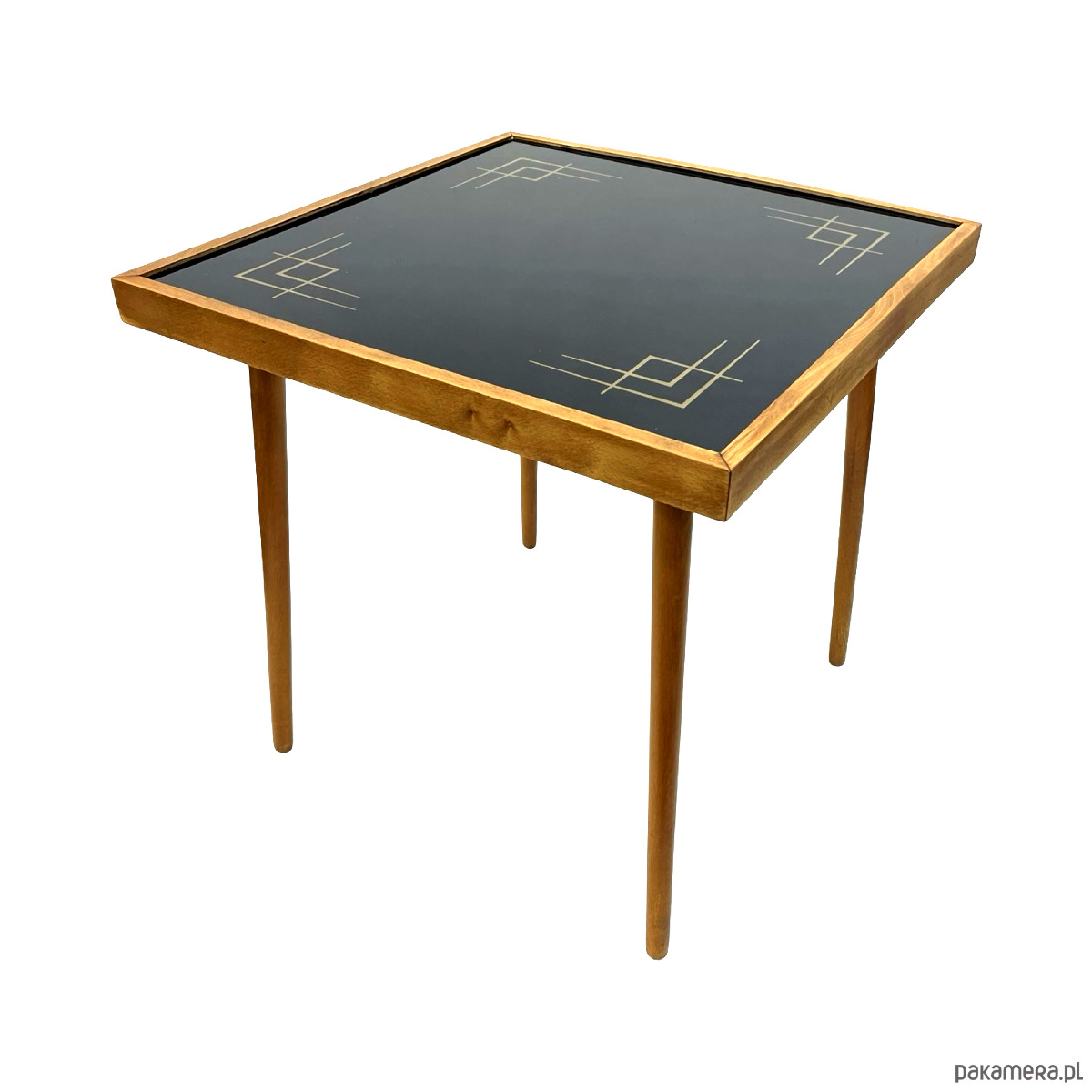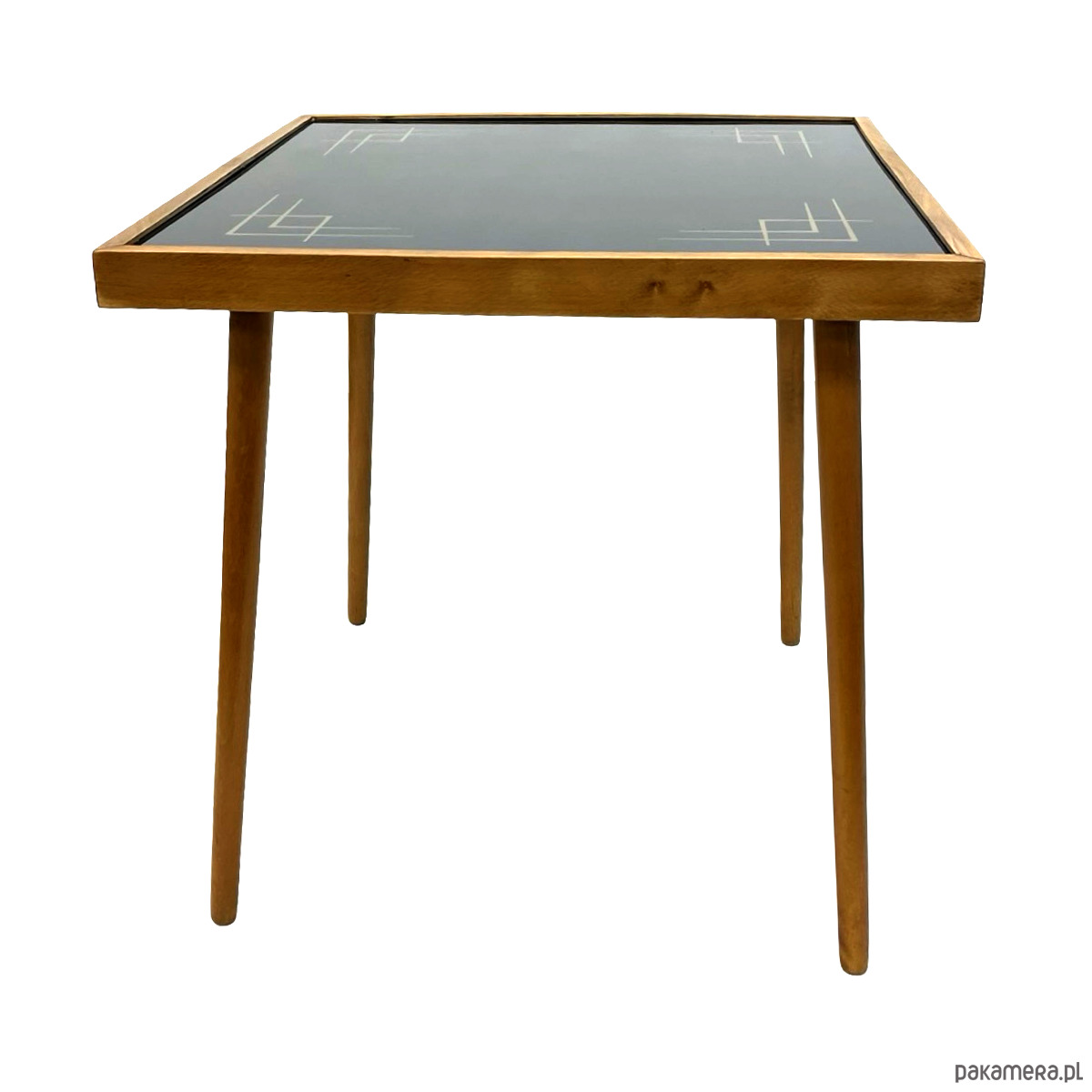 Stolik posiada szklany blat z dekoracyjnym, geometrycznym nadrukiem w stylu modernistycznym oraz smukłą, drewnianą konstrukcję typową dla niemieckiego wzornictwa powojennego. Połączenie ciepłego drewna z chłodnym szkłem tworzy bardzo elegancki, ponadczasowy efekt.