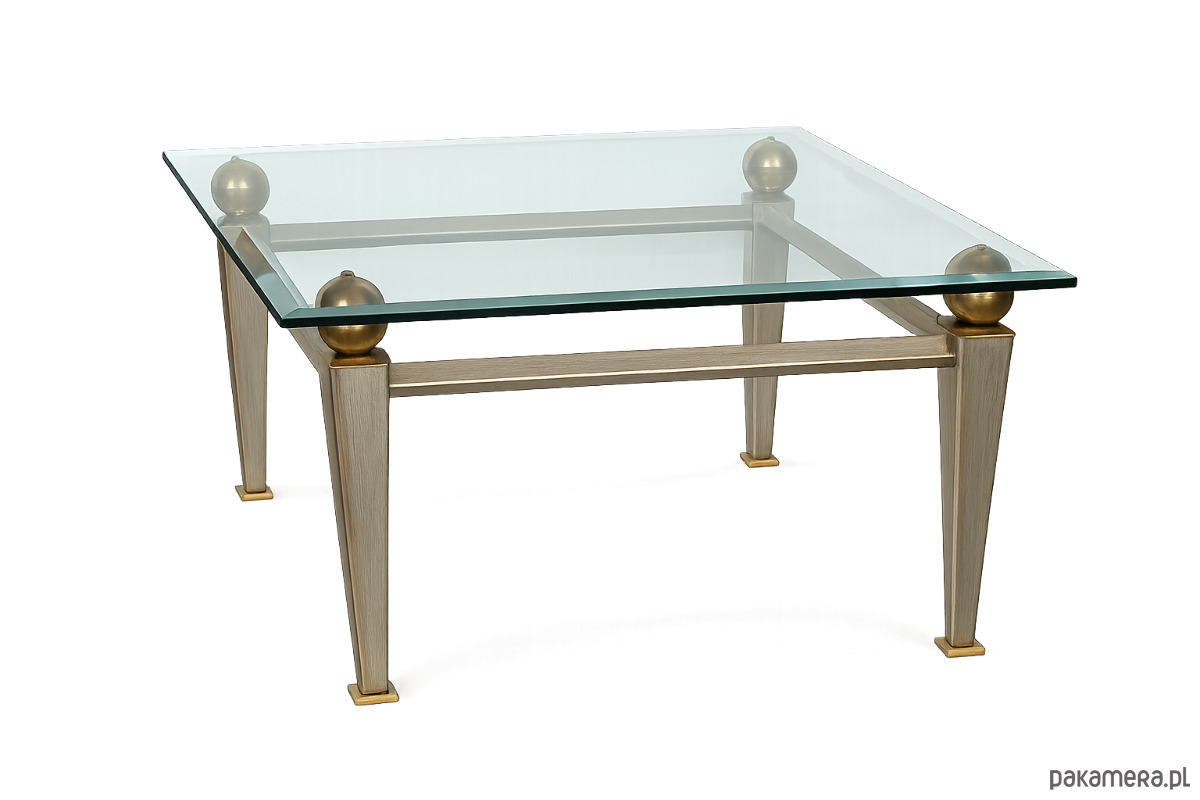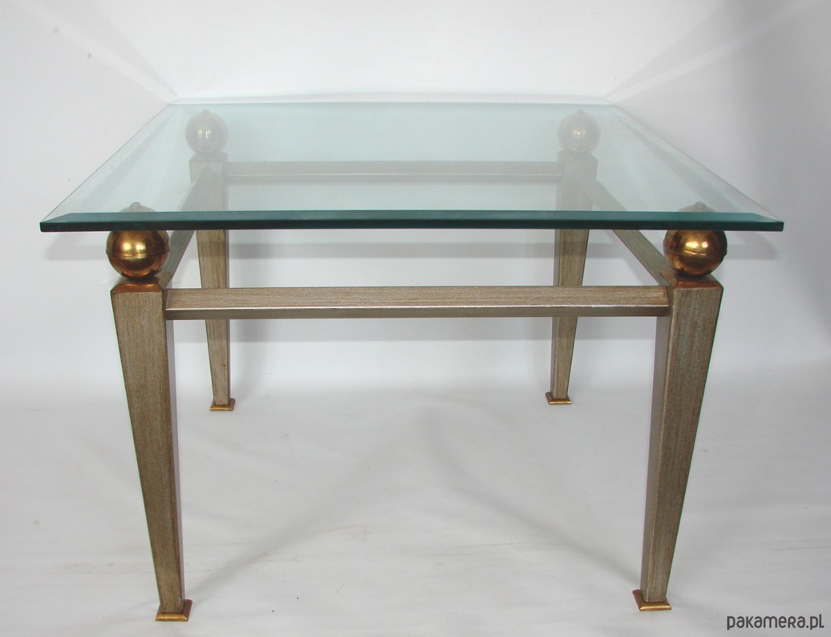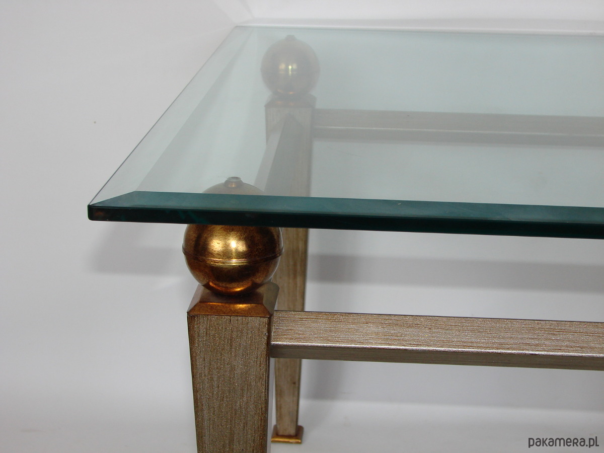 Elegancki stolik kawowy w stylu Art Deco, pochodzący z lat 80. XX wieku. Konstrukcja z metalu z elementami mosiężnymi oraz blat z grubego, szlifowanego szkła o grubości 10–12 mm. Mebel zachowany w bardzo dobrym stanie, stabilny i dekoracyjny. Idealny do salonu, wnętrz vintage, loftowych i modern classic.