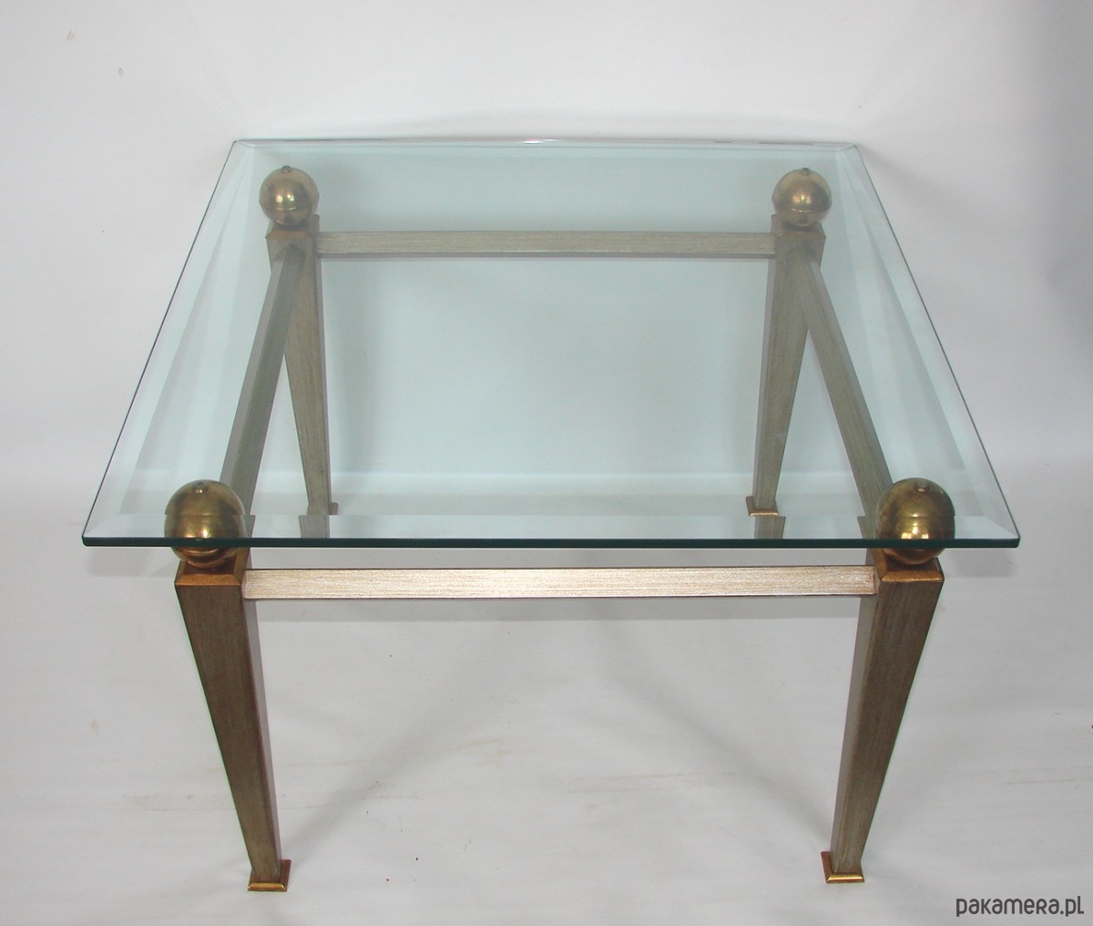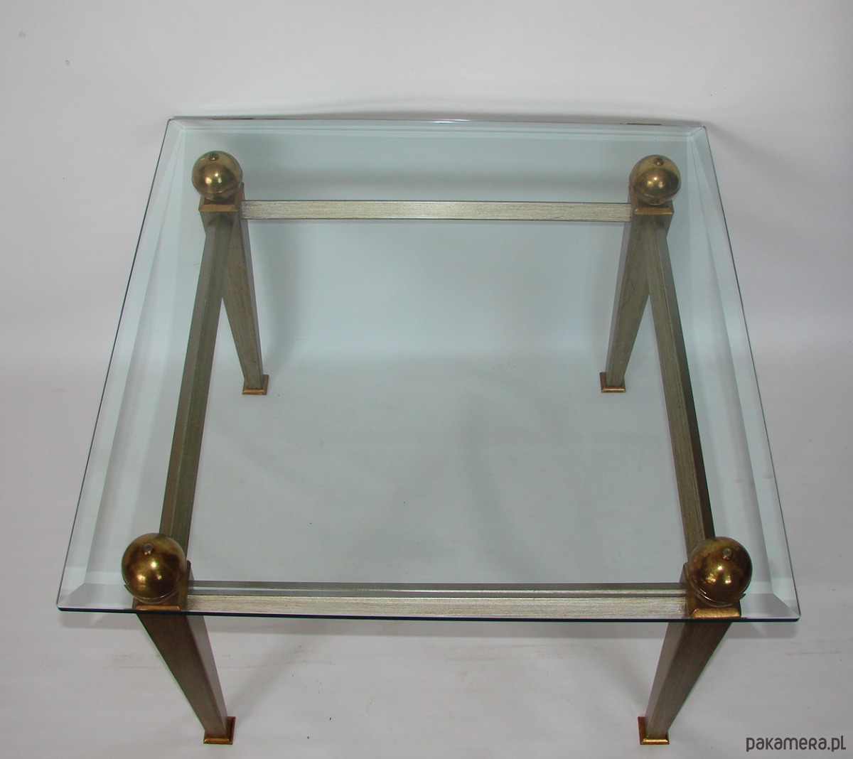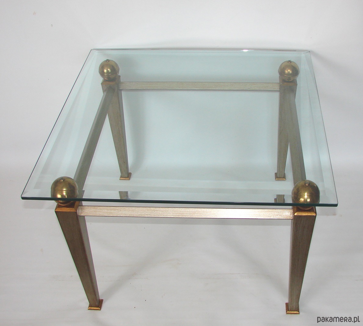 Elegancki stolik kawowy w stylu Art Deco, pochodzący z lat 80. XX wieku. Konstrukcja z metalu z elementami mosiężnymi oraz blat z grubego, szlifowanego szkła o grubości 10–12 mm. Mebel zachowany w bardzo dobrym stanie, stabilny i dekoracyjny. Idealny do salonu, wnętrz vintage, loftowych i modern classic.