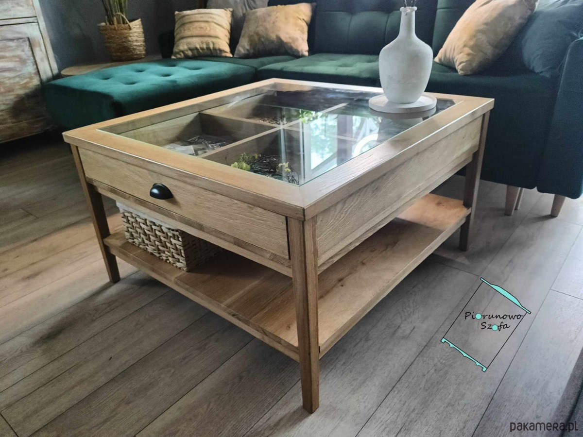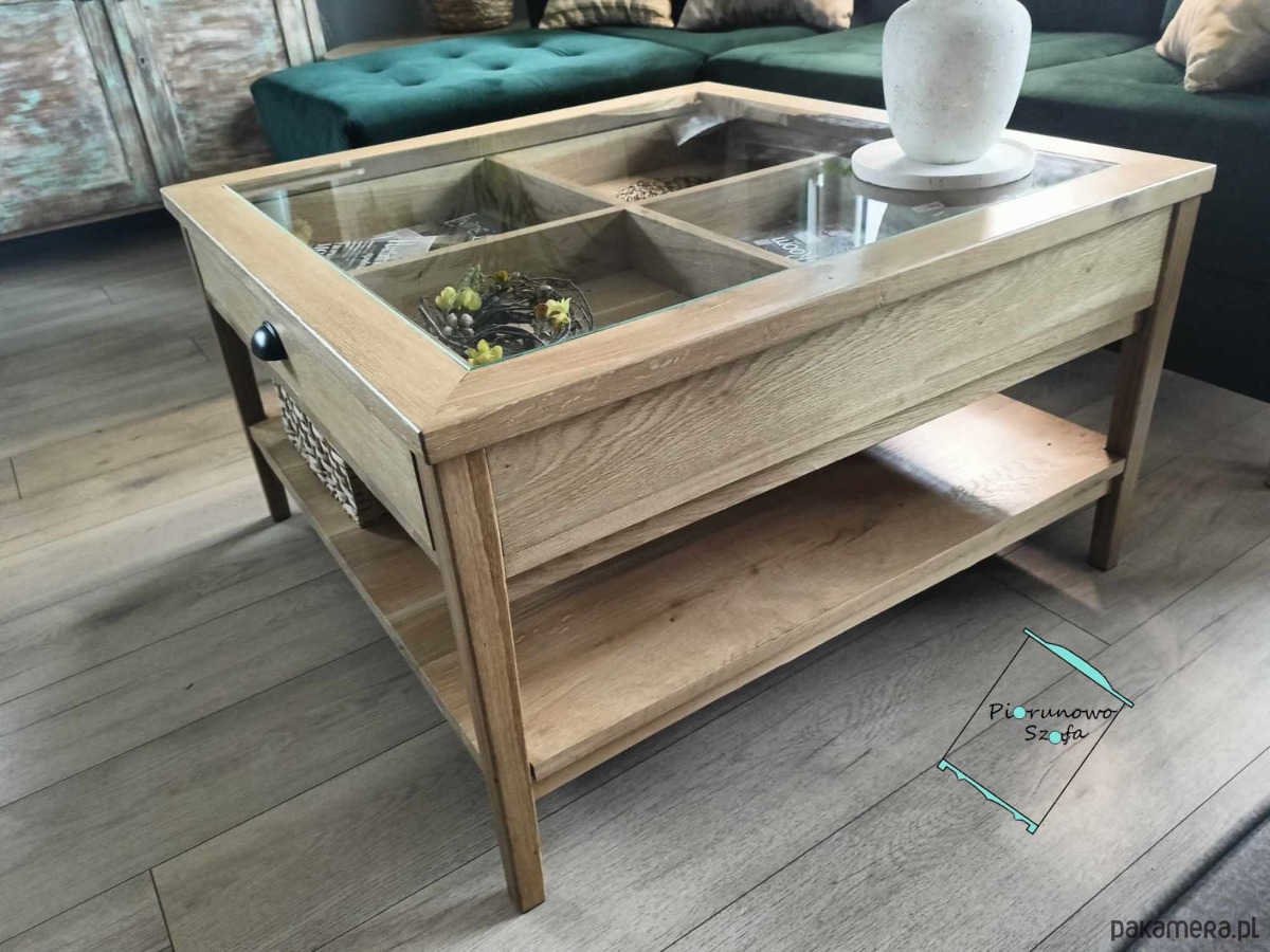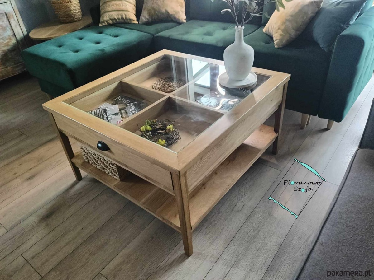 Salon, jako najbardziej reprezentatywne pomieszczenie w domu, musi pełnić nie tylko funkcję dekoracyjną, ale też odpowiadać na potrzeby domowników. Podczas seansu ulubionego serialu albo goszcząc przyjaciół, musimy mieć na czym postawić szklanki z napojami czy przekąski. Nie bez powodu niemal w każdym domu przy kanapie znajduje się niski stolik kawowy — to prawdziwa esencja funkcjonalności, którą dodatkowo zwiększają pewne udogodnienia. Dostępny w naszym sklepie kwadratowy, dębowy stolik ma: