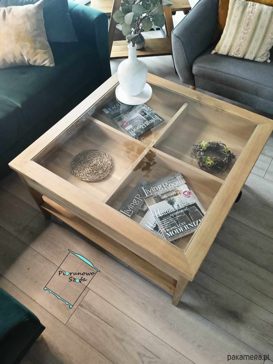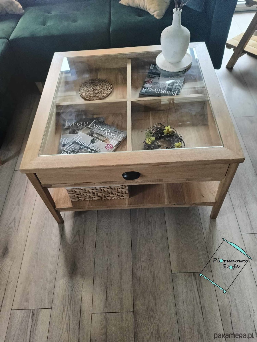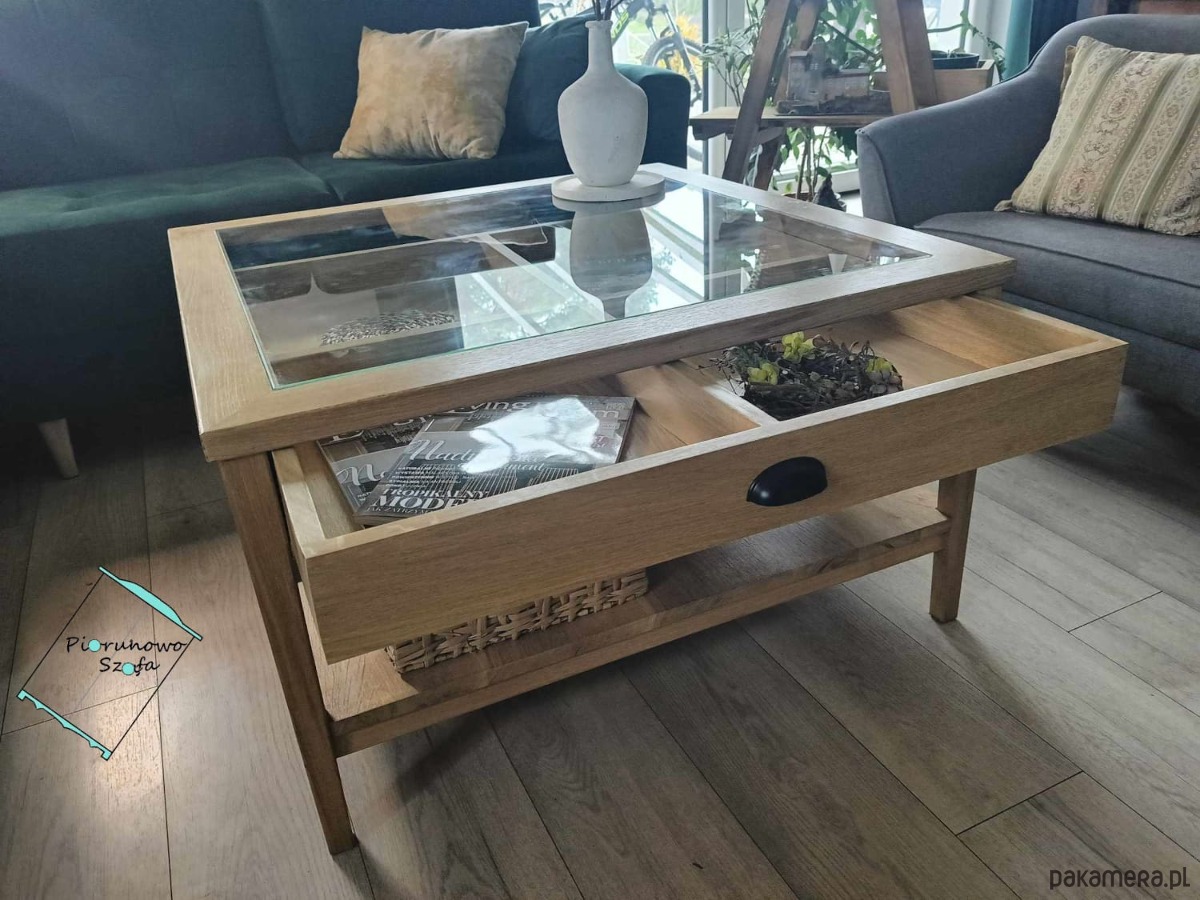 szufladę podzieloną na cztery przegródki, w których przechowasz piloty do RTV, gazety, serwetki, podkładki pod szklanki, pady do konsoli itp. Zawartość szuflady jest widoczna dzięki szybie wbudowanej w blat stolika;