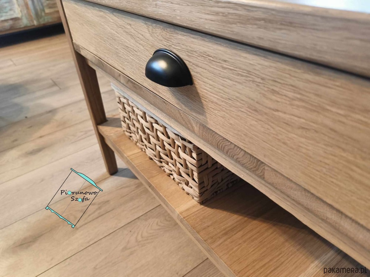 dodatkową półkę umieszczoną pod szufladą, którą wykorzystasz na przechowywanie większych rzeczy, niekoniecznie tych, które chcesz eksponować w salonie. Z łatwością zmieścisz tutaj praktyczne pojemniki albo koszyki, do których schowasz na przykład ładowarki do telefonów domowników, zapasowe baterie do pilotów, słuchawki, okulary oraz mnóstwo innych przedmiotów, które lubisz mieć pod ręką.