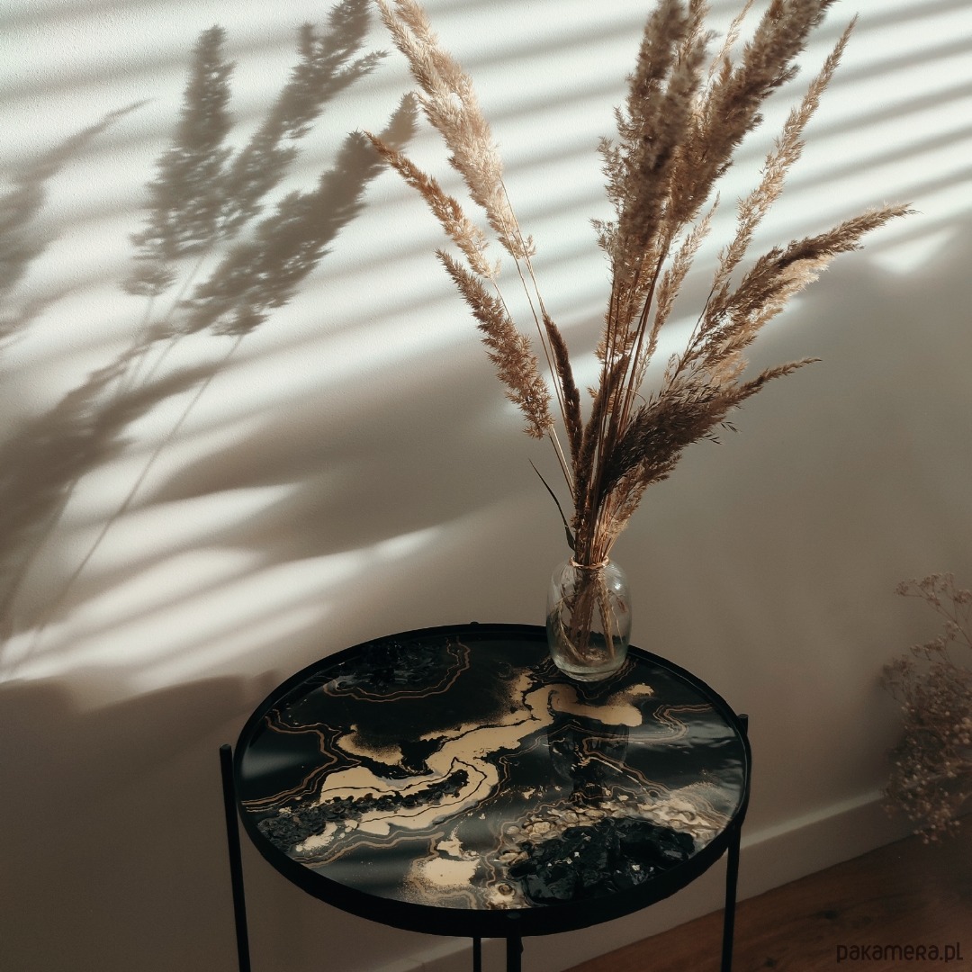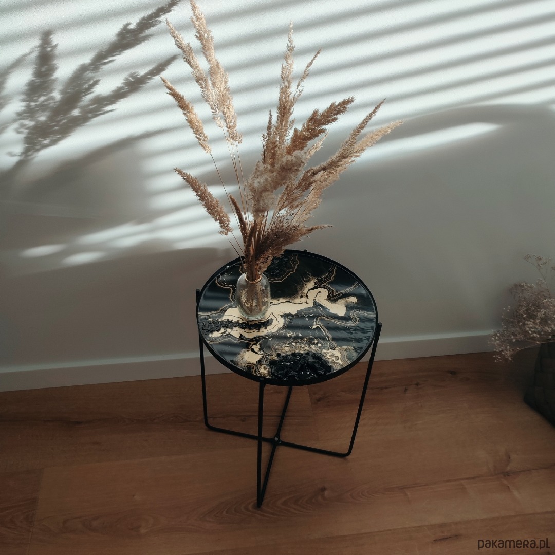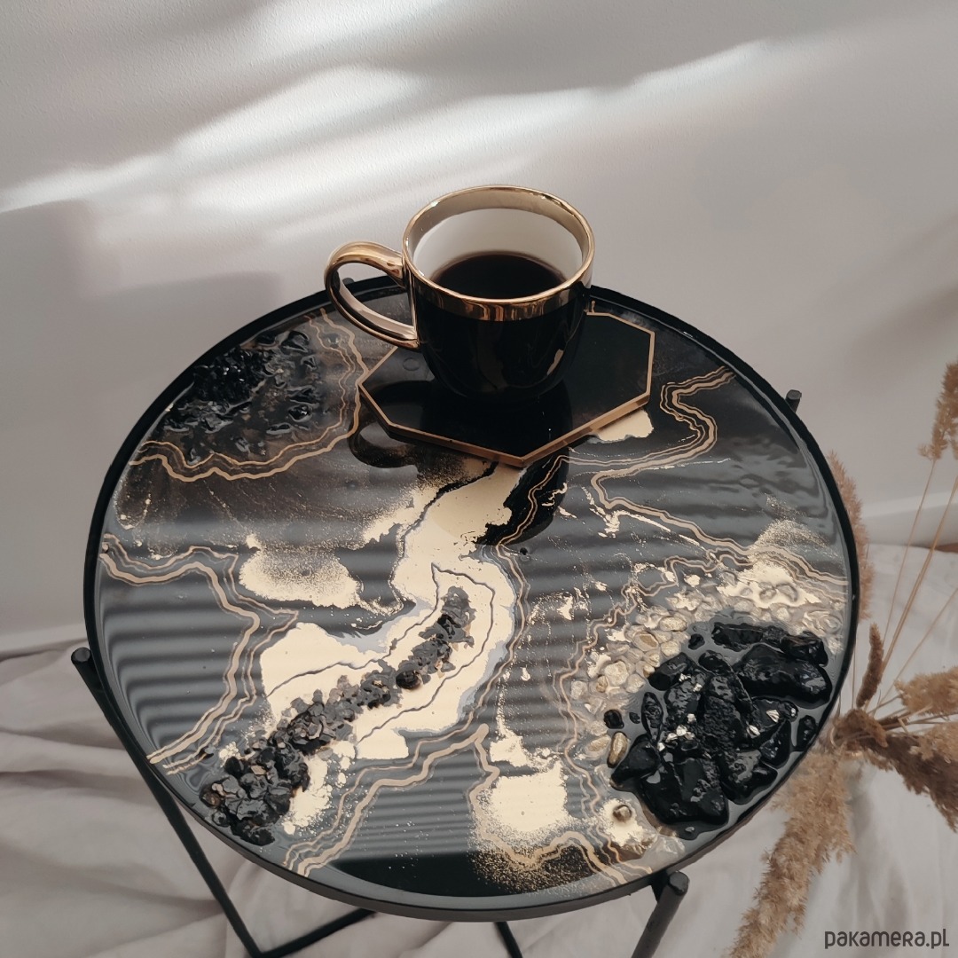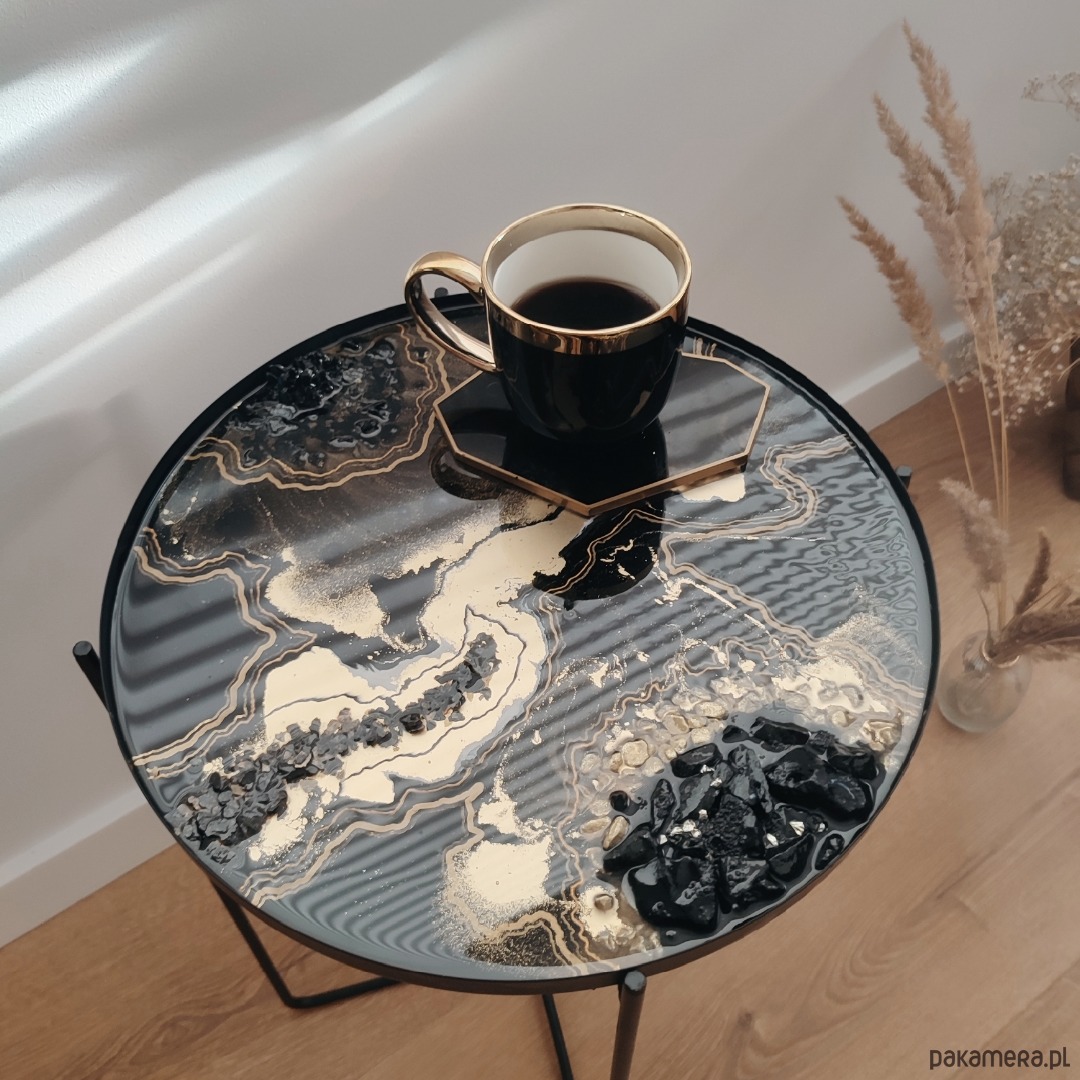 Piękny stolik kawowy z zatopionymi kamieniami w żywicy epoksydowej.