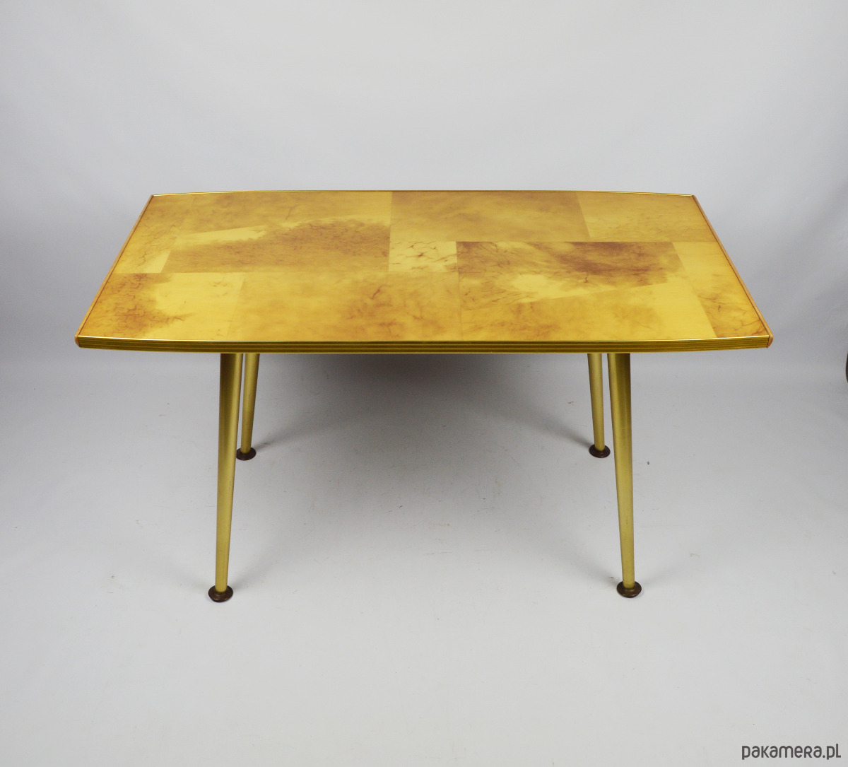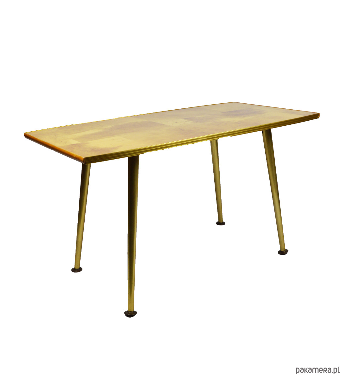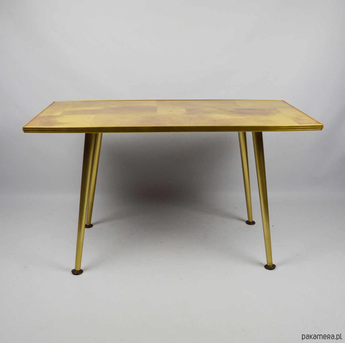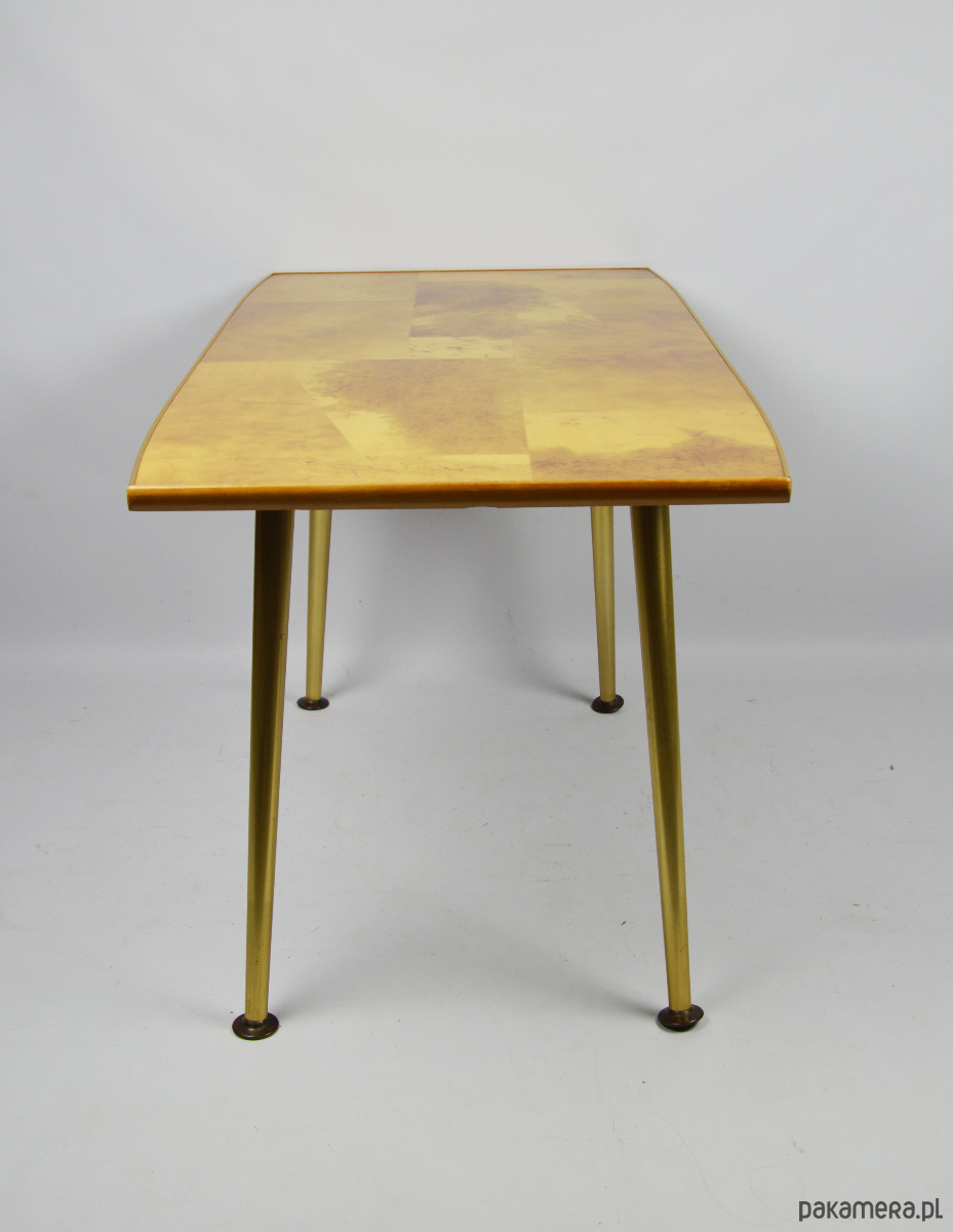 Stolik kawowy z lat 80, blat wykonany z mniejszych elementów jasnego czeczota, całość zabezpieczona politurą z drewnianymi i metalowymi elementami. Nogi w całości metalowe w kolorze złota. Stan zachowania dobry, widoczne rysy i przetarcia oraz jedno pęknięcie politury.