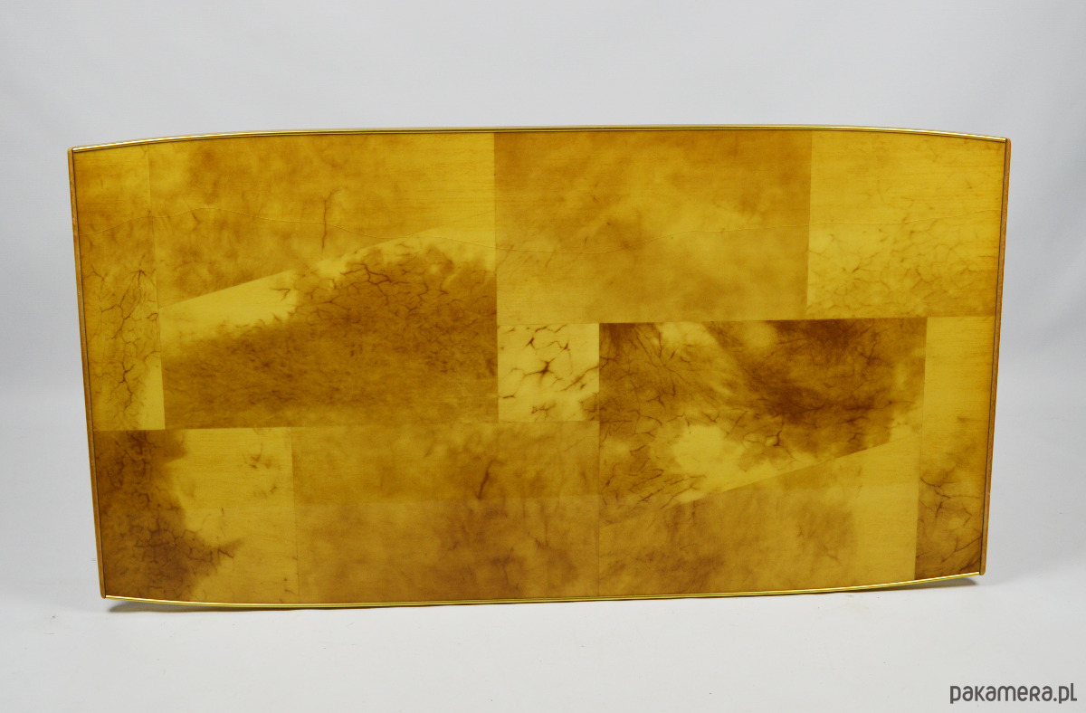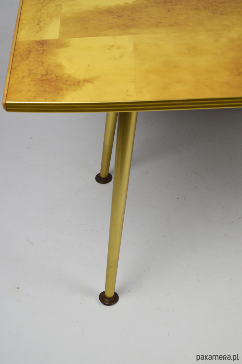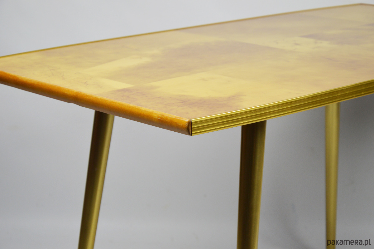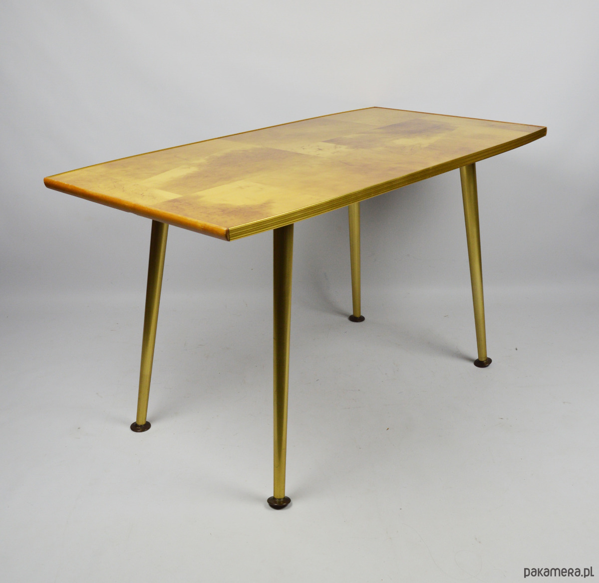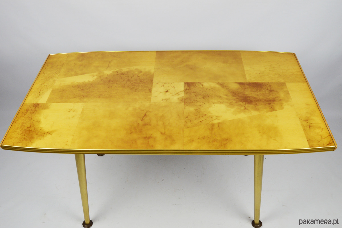 Stolik kawowy z lat 80, blat wykonany z mniejszych elementów jasnego czeczota, całość zabezpieczona politurą z drewnianymi i metalowymi elementami. Nogi w całości metalowe w kolorze złota. Stan zachowania dobry, widoczne rysy i przetarcia oraz jedno pęknięcie politury.