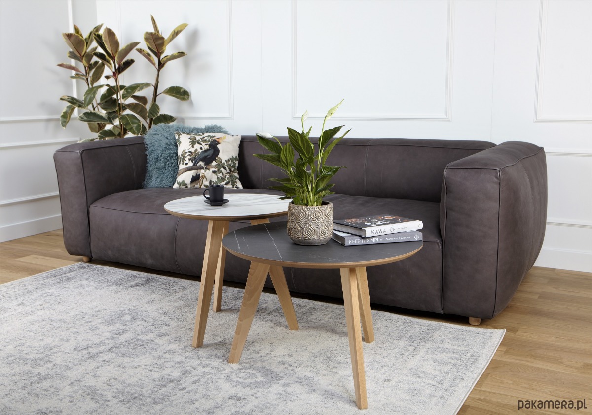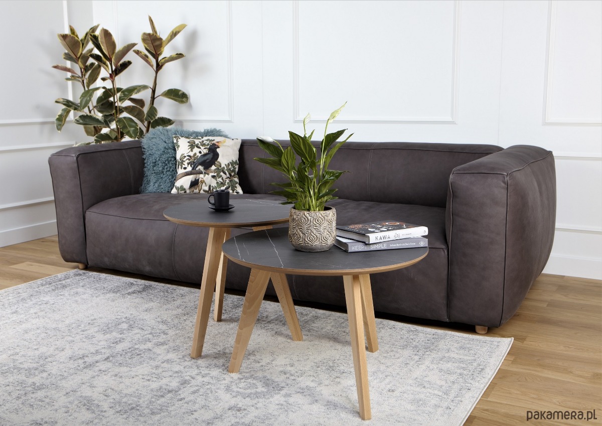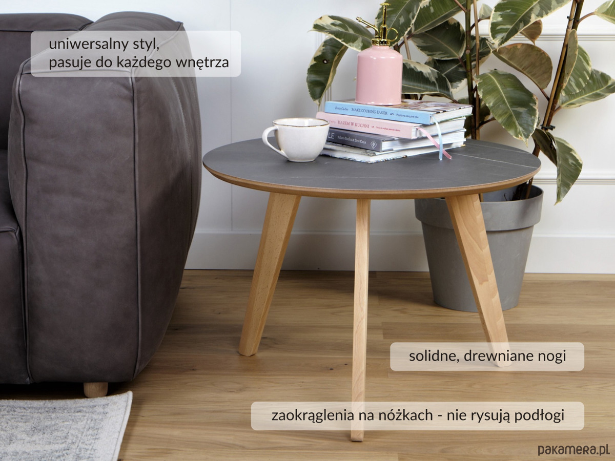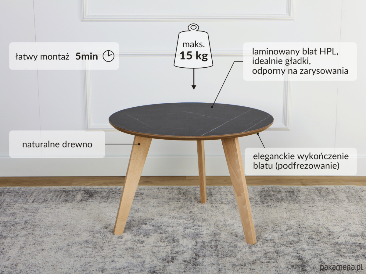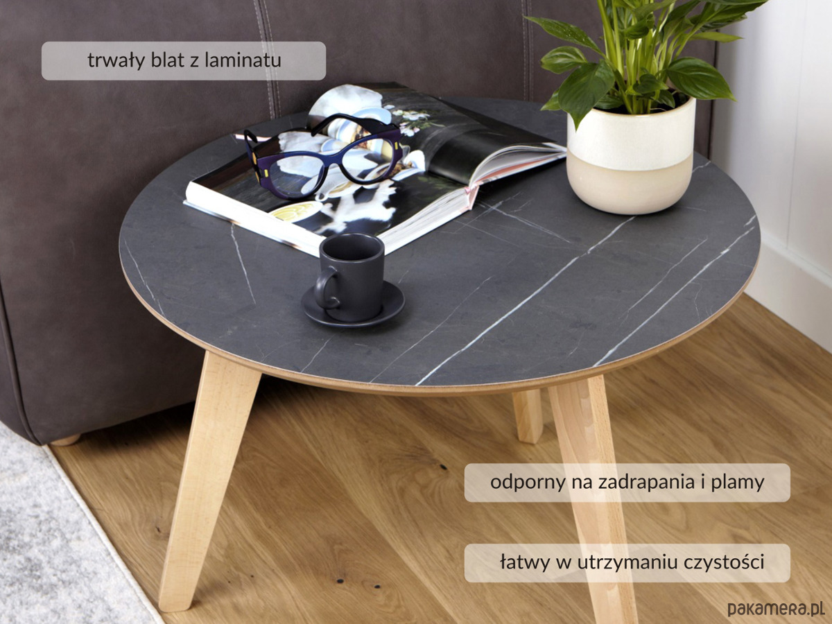 Wysokiej jakości stolik kawowy, z blatem laminowanym płytą HPL o bardzo dużej odporności na zarysowania, nogi wykonane z naturalnego drewna bukowego, pokryte bezbarwnym lakierem.