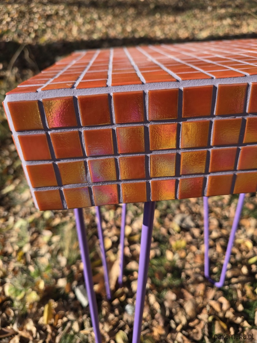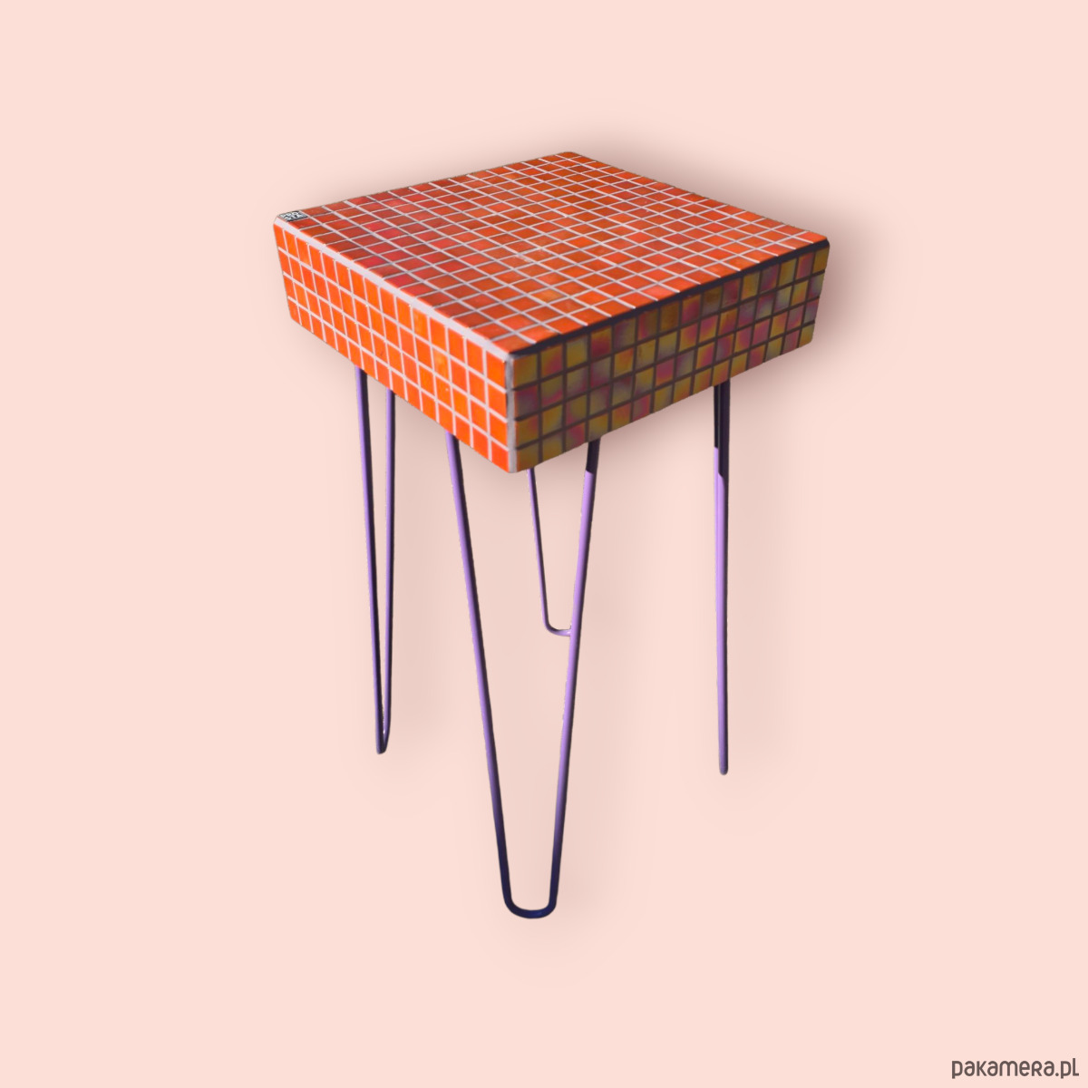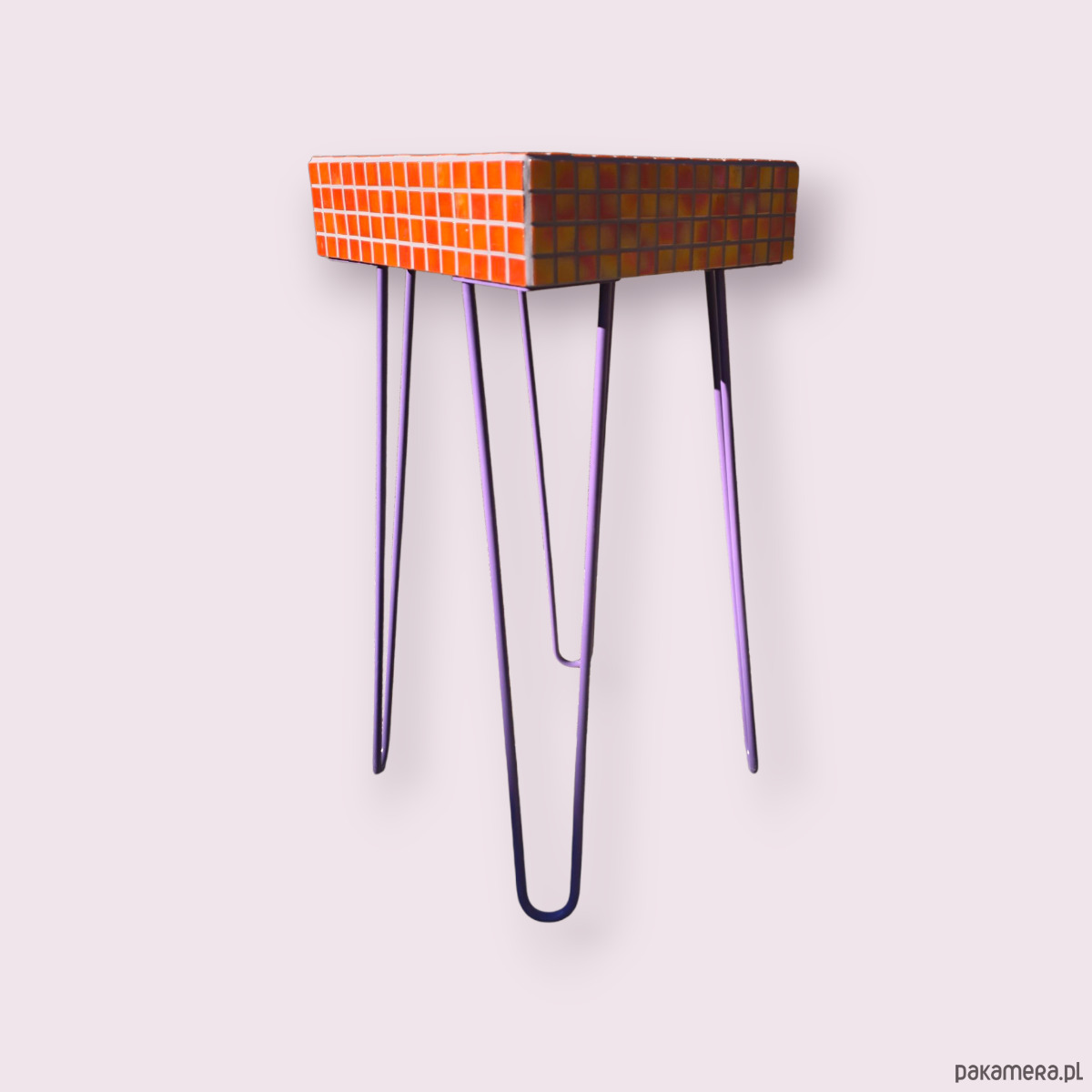 Pomarańczowy ceramiczny stolik z mozaiką z czarną fugą i fioletowymi metalowymi nogami to wyrazisty, artystyczny element, który wnosi wyrazisty kolor i rękodzielniczą jakość do każdego wnętrza. Każdy stolik, wykonany w 100% w Polsce w pracowni MrCube.studio, jest ręcznie tworzony z wyjątkową dbałością o detale. Blat stolika posiada trwałą podstawę pokrytą ręcznie układaną ceramiczną mozaiką w pomarańczowym odcieniu, podkreśloną kontrastującą czarną fugą, która dodaje projektowi energii i nowoczesnego charakteru.