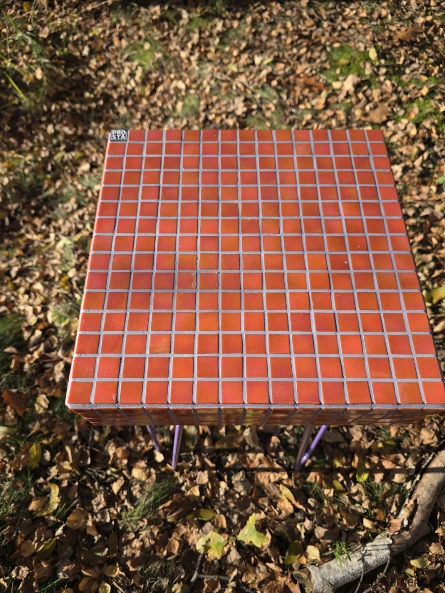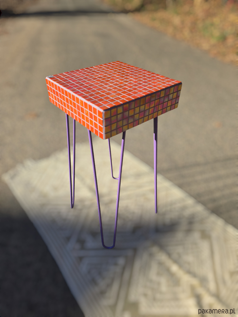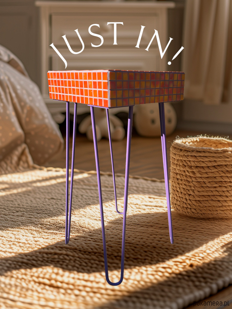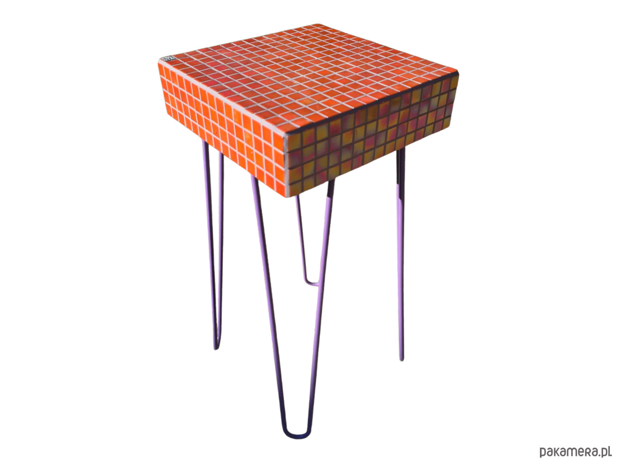 Pomarańczowy ceramiczny stolik z mozaiką z czarną fugą i fioletowymi metalowymi nogami to wyrazisty, artystyczny element, który wnosi wyrazisty kolor i rękodzielniczą jakość do każdego wnętrza. Każdy stolik, wykonany w 100% w Polsce w pracowni MrCube.studio, jest ręcznie tworzony z wyjątkową dbałością o detale. Blat stolika posiada trwałą podstawę pokrytą ręcznie układaną ceramiczną mozaiką w pomarańczowym odcieniu, podkreśloną kontrastującą czarną fugą, która dodaje projektowi energii i nowoczesnego charakteru.