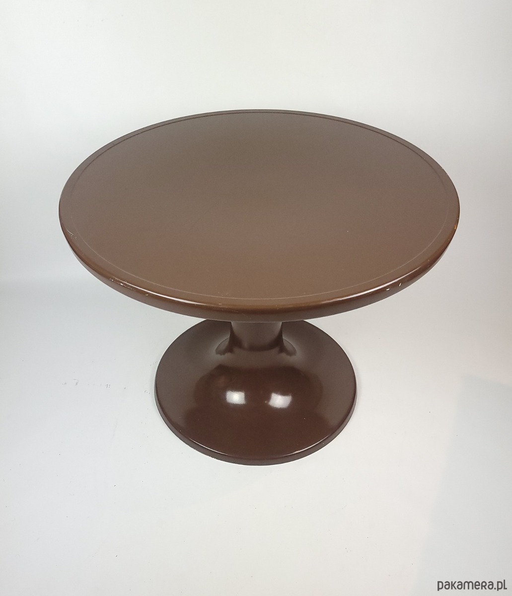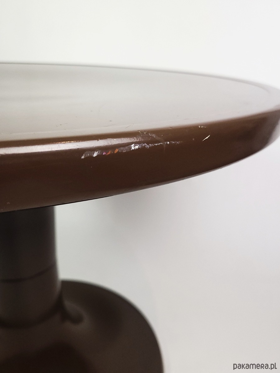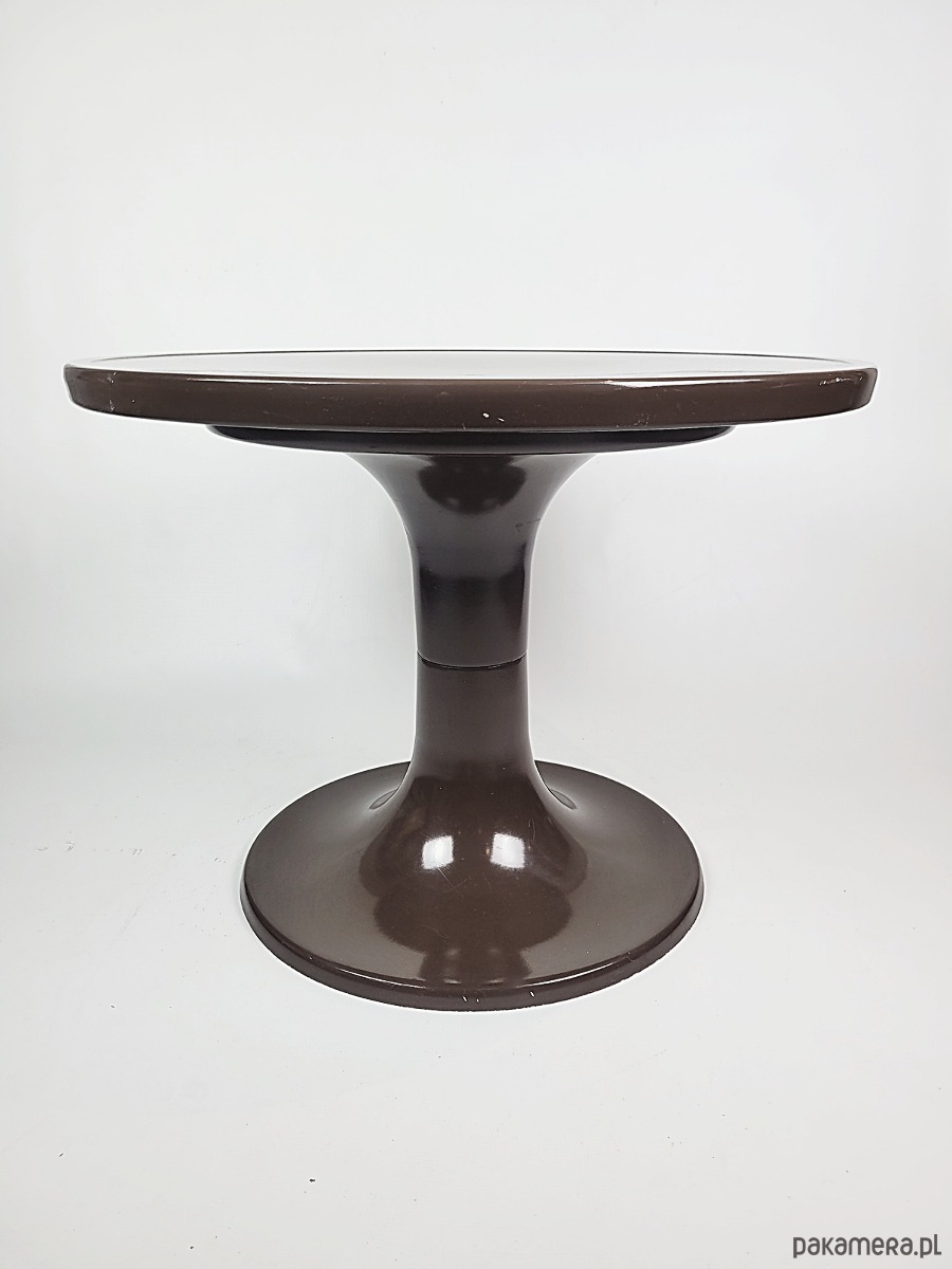 Ten wyjątkowy stolik projektu Ernsta Moeckla to ikona designu w stylu Space Age, inspirowana kultowymi projektami z lat 70. XX wieku. Charakteryzuje się płynną, organiczną linią o formie tulipana oraz głębokim, czekoladowym kolorem z eleganckim wykończeniem o wysokim połysku. Wykonany z trwałego tworzywa, łączy w sobie futurystyczną estetykę retro z praktyczną funkcjonalnością, doskonale sprawdzając się jako rzeźbiarski akcent w salonie, sypialni lub nowoczesnym biurze. To idealny wybór dla miłośników nurtu Mid-Century Modern, którzy szukają mebla o unikalnym charakterze i ponadczasowej formie. Stolik posiada delikatne ubytki w lakierze widoczne na zdjęciach.