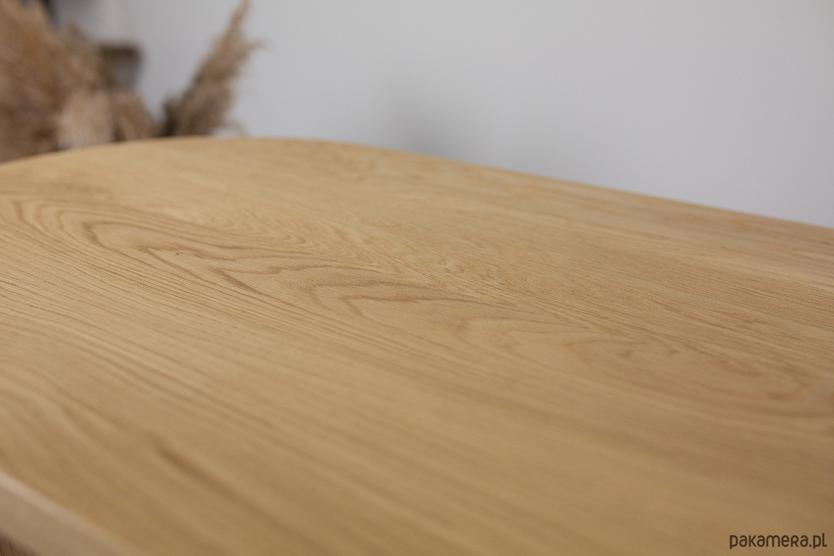 Kolejny stolik zainspirowany japońskim stylem "japandi". Na uwagę zasługują ciekawe elementy dekoracyjne, jak porzeczna belka oraz zaokrąglone nogi. Zmontowany bez widocznych elementów montażowych. Naturalne materiały i niepowtarzalny projekt sprawią, że stolik może być ciekawym dodatkiem do Twojego wnętrza.