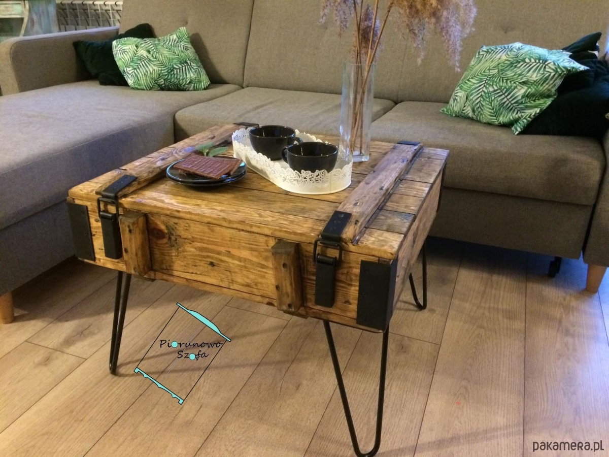 Stolik kawowy ze skrzyni z metalowymi okuciami, odrestaurowany, co daje meblom drugie życie. Oczyszczony, odmalowany, zabezpieczony lakierem, na metalowych nogach…Idealny do każdego salonu dużego czy małego. Stolik jest otwierany dzięki czemu w środku można przechowywać różne „przydasie” książki i co tylko się podoba. Poprzez stalowe okucia, Klamry oraz zawiasy metalowe, każdy stolik jest unikatowy .