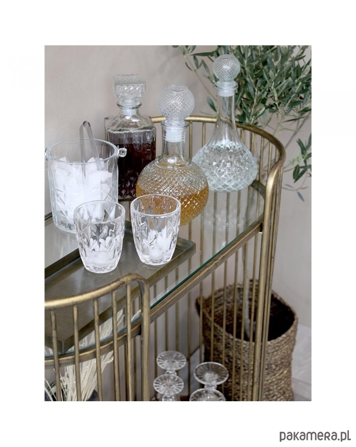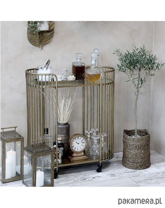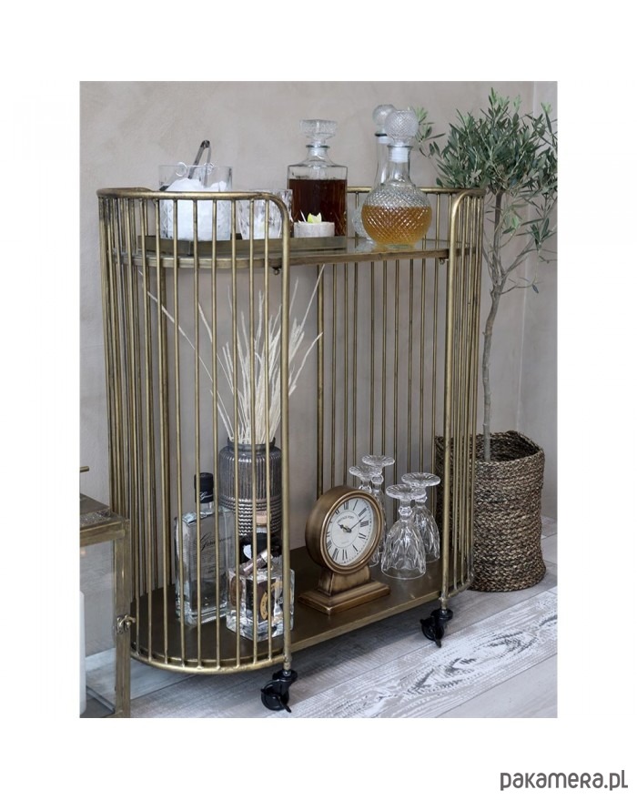 Wózek-barek na kółkach. W całości wykonany z metalu. W kolorze antycznego złota. Posiada kółka. Całość celowo nieidealna.