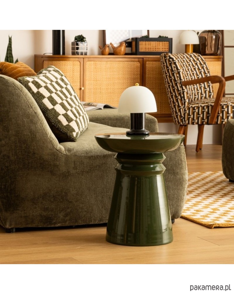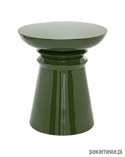 Metalowy stolik pomocniczy w kolorze butelkowej zieleni. Lakierowany na wysoki połysk. Idealny jako stolik boczny przy sofie.