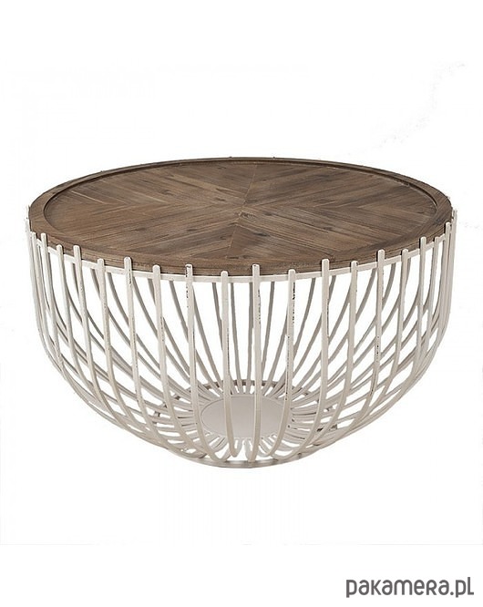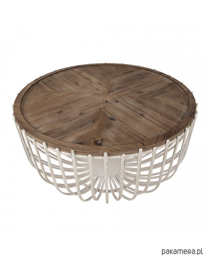 Bardzo ciekawy stolik - kosz wykonany z metalu. W kolorze antycznej bieli. Celowo postarzany. Blat wykonany z łączonych elementów drewnianych. Jest bielony. Całość celowo nieidealna.