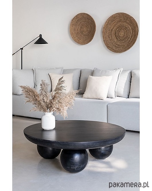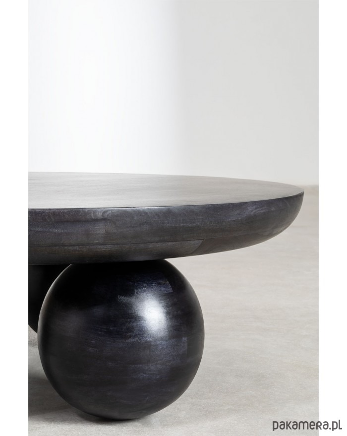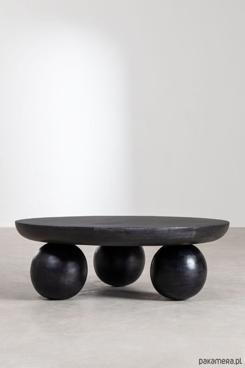 Designerski stolik kawowy. Blat opiera się na trzech kulach. Wykonany w całości z solidnego drewna mango.