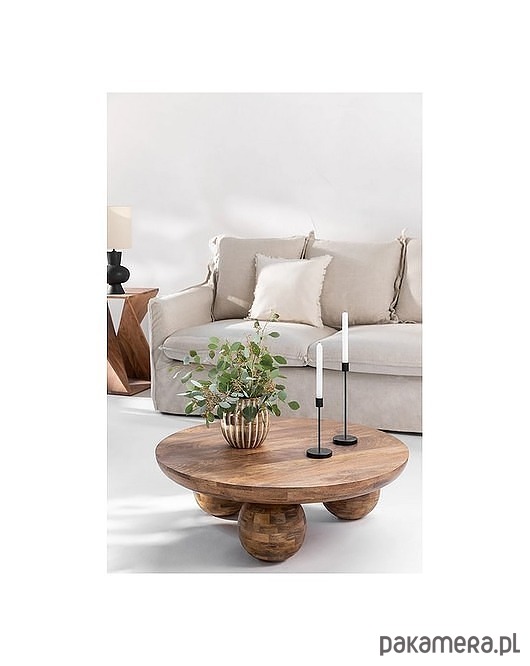 Designerski stolik kawowy. Blat opiera się na trzech kulach. Wykonany w całości z solidnego drewna mango.