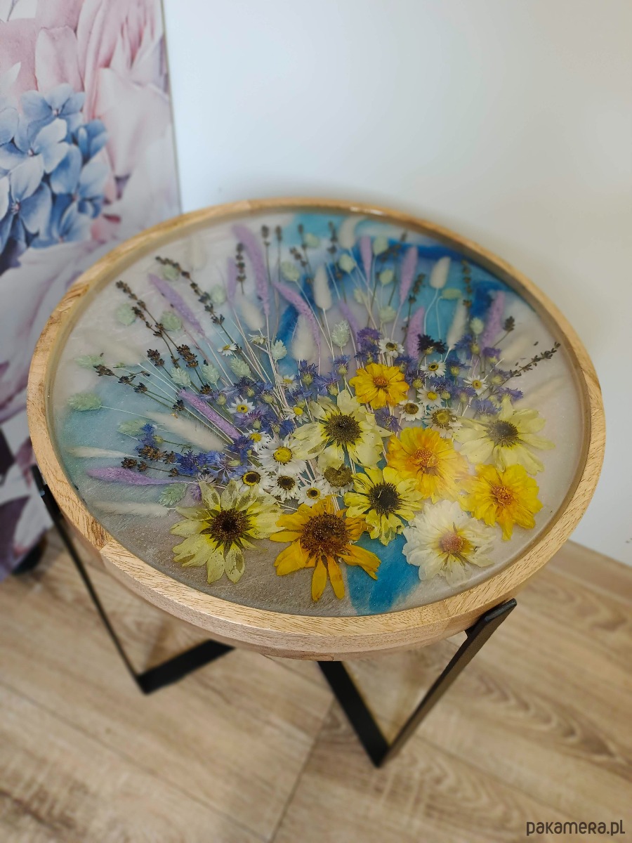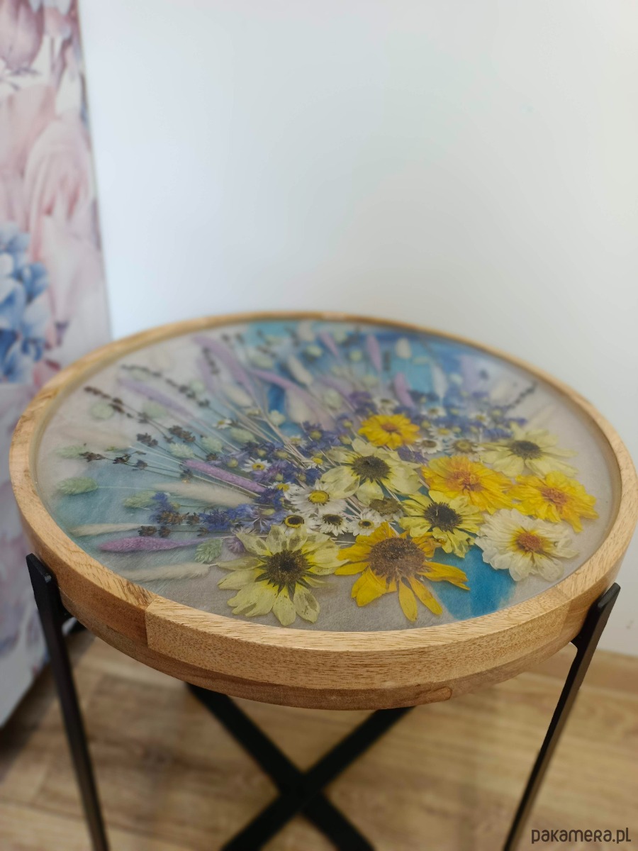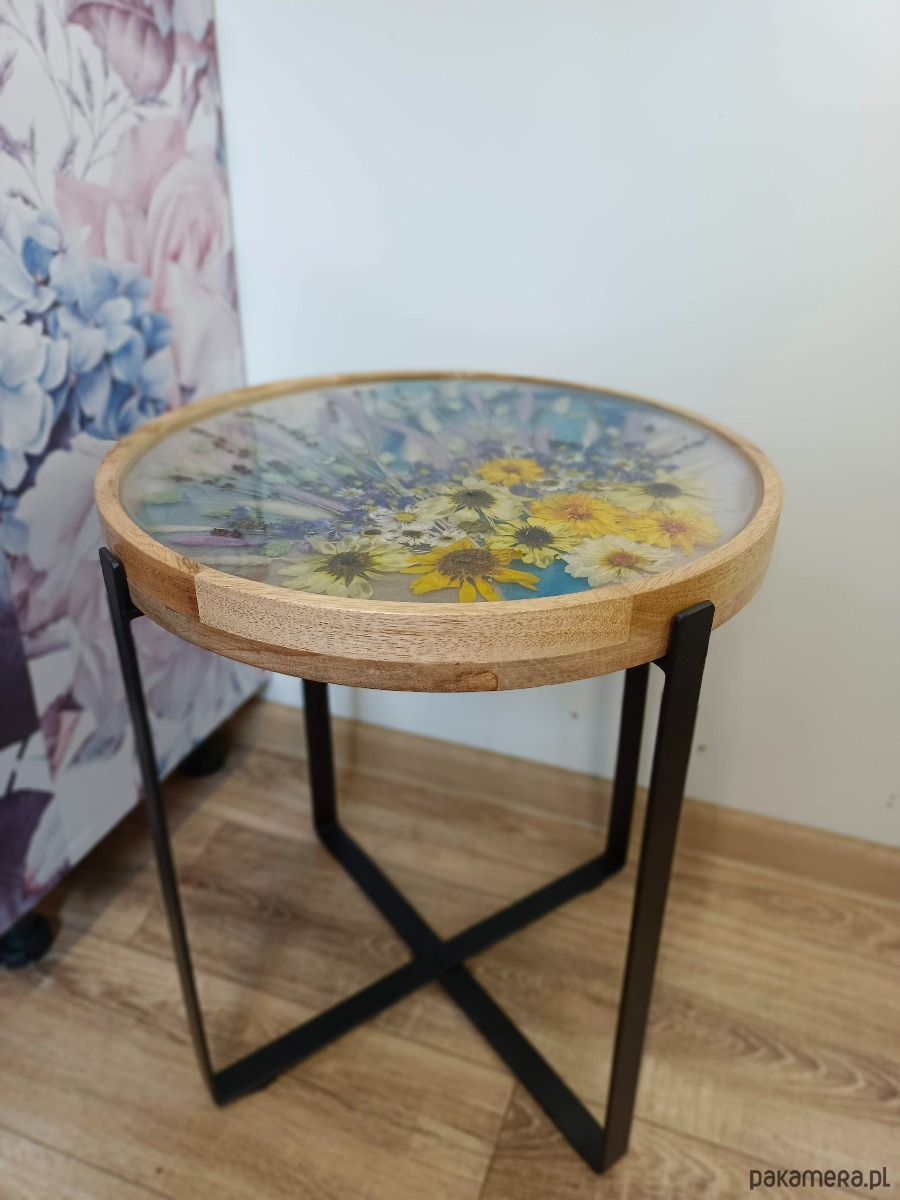 💠 Elegancki stolik kawowy z drewnem i elementami metalowymi z kompozycją kwiatową zamkniętą w żywicy epoksydowej. Jego klimat przenosi nas do letniego ogrodu. Stolik jest niewielkich rozmiarów, ale swoim wyglądem przyciąga wzrok i może być doskonałą ozdobą domu lub prezentem. Stolik posiada czarny metalowy stelaż, który można złożyć po zdjęciu blatu. Dzięki temu mebel po złożeniu zajmuje mało miejsca.