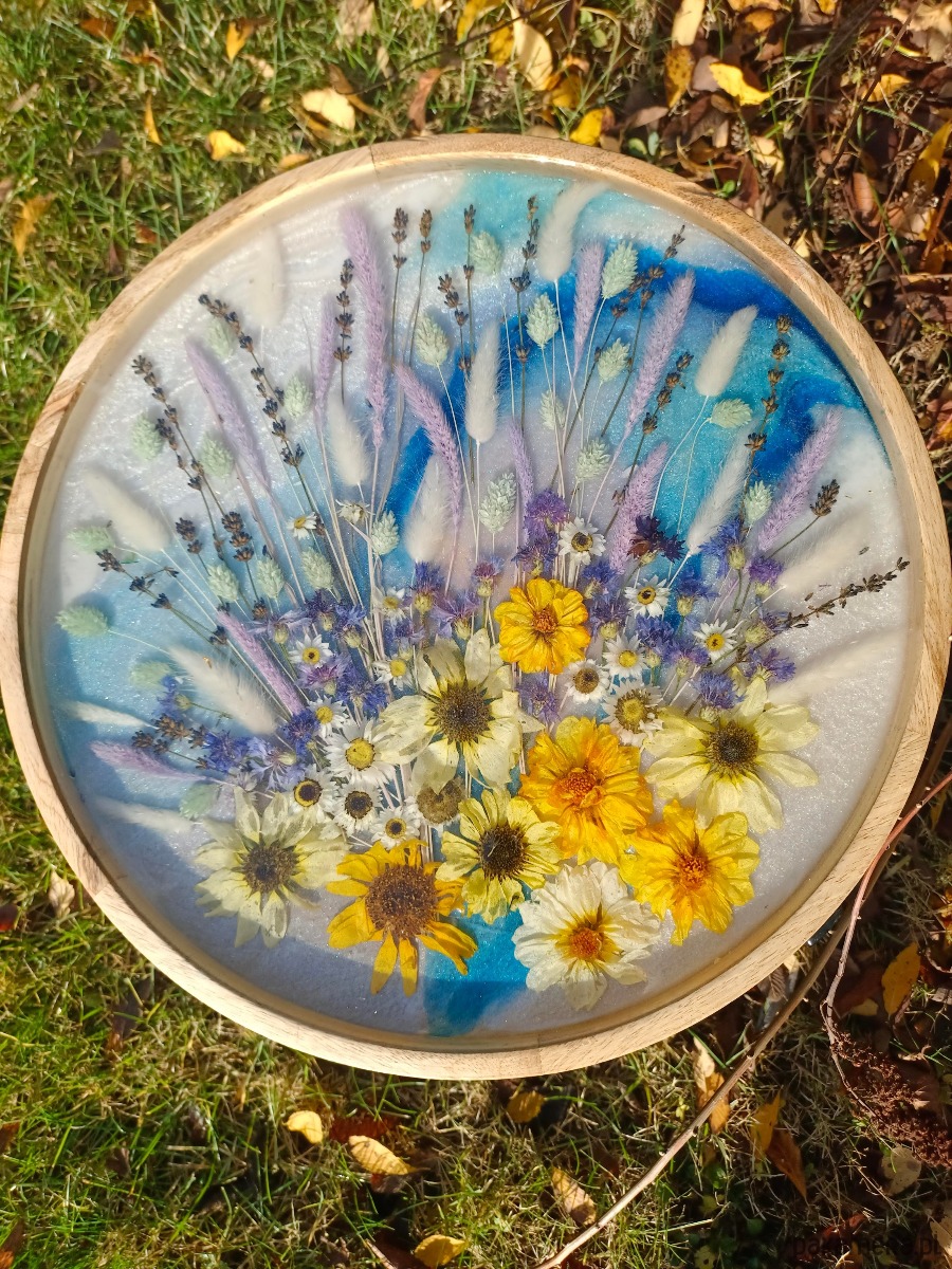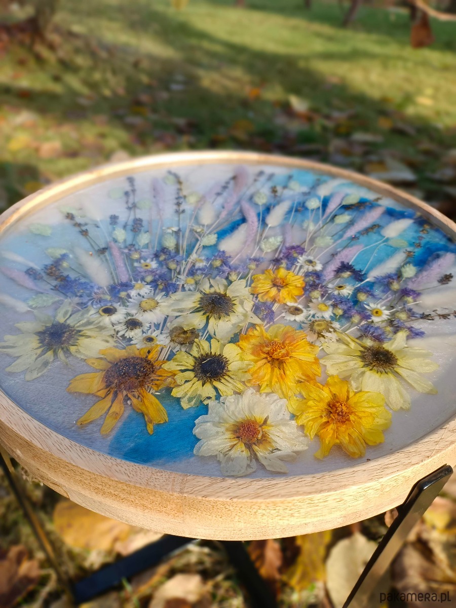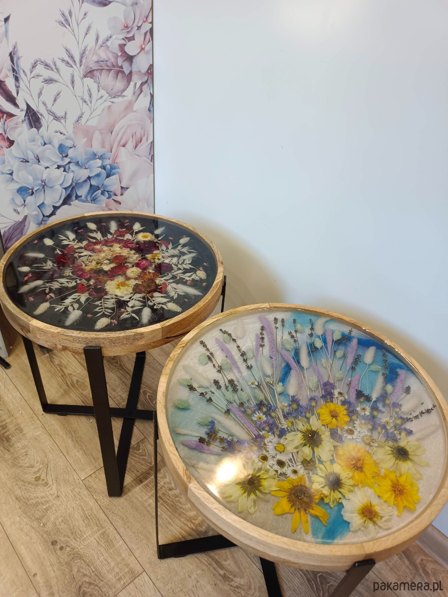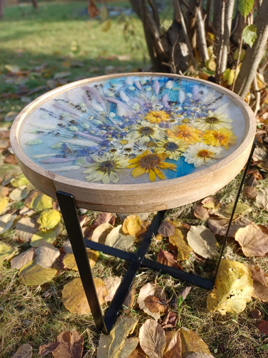 💠 Elegancki stolik kawowy z drewnem i elementami metalowymi z kompozycją kwiatową zamkniętą w żywicy epoksydowej. Jego klimat przenosi nas do letniego ogrodu. Stolik jest niewielkich rozmiarów, ale swoim wyglądem przyciąga wzrok i może być doskonałą ozdobą domu lub prezentem. Stolik posiada czarny metalowy stelaż, który można złożyć po zdjęciu blatu. Dzięki temu mebel po złożeniu zajmuje mało miejsca.