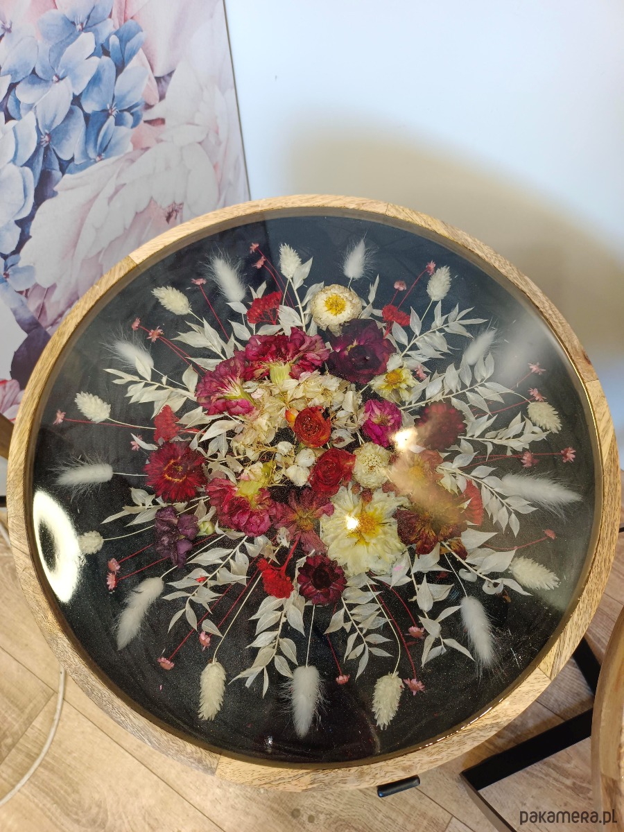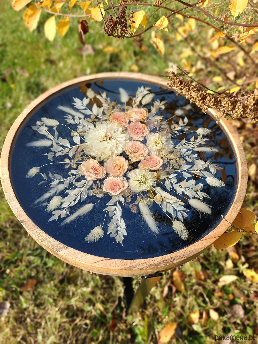💠 Elegancki stolik kawowy z drewnem i elementami metalowymi z kompozycją kwiatową zamkniętą w żywicy epoksydowej. Regularny wzór kwiatowy przypominający mandalę na czarnym tle z delikatnymi refleksami w drewnianej ramie vintage. Jego klimat przenosi nas do letniego ogrodu. Stolik jest niewielkich rozmiarów, ale swoim wyglądem przyciąga wzrok i może być doskonałą ozdobą domu lub prezentem. Stolik posiada czarny metalowy stelaż, który można złożyć po zdjęciu blatu. Dzięki temu mebel po złożeniu zajmuje mało miejsca.