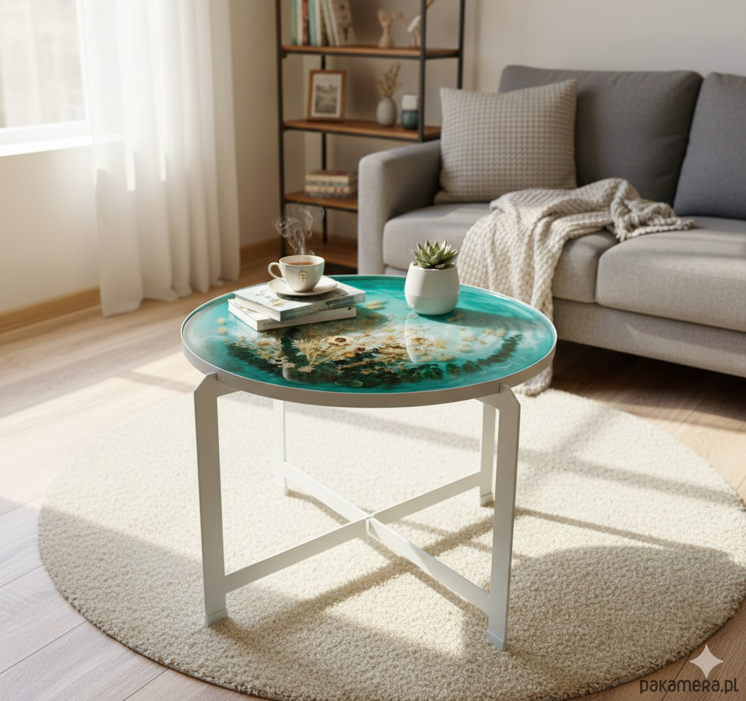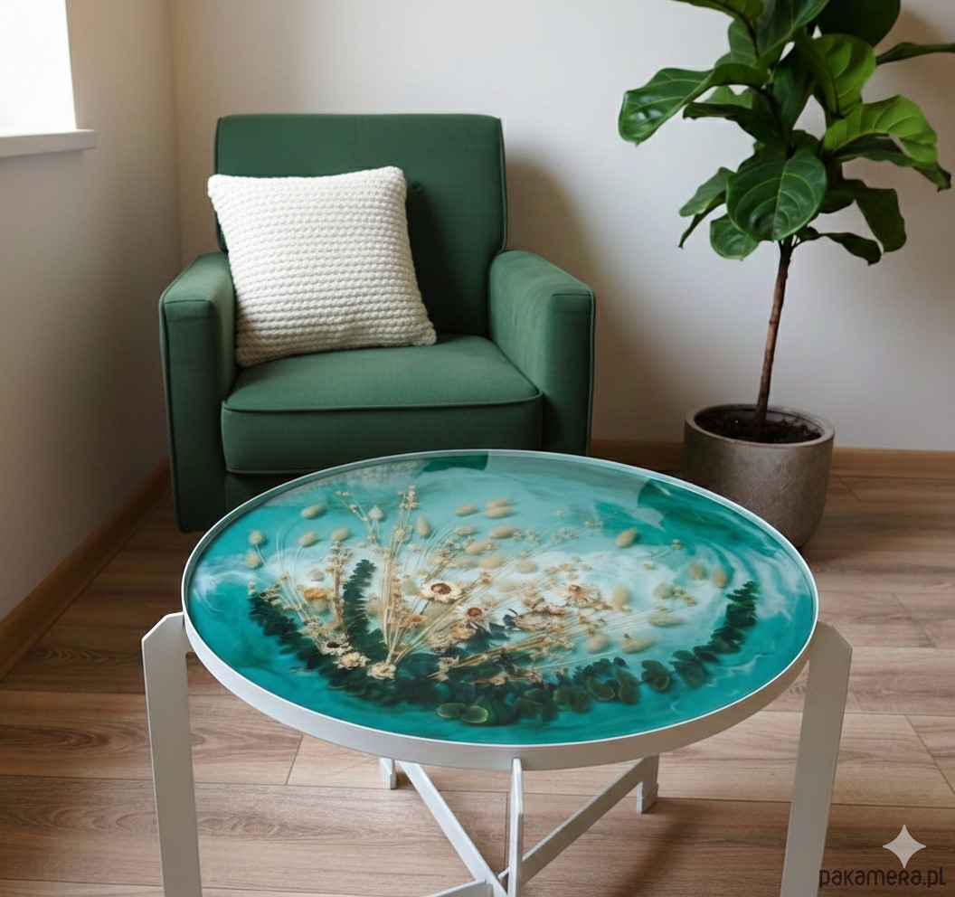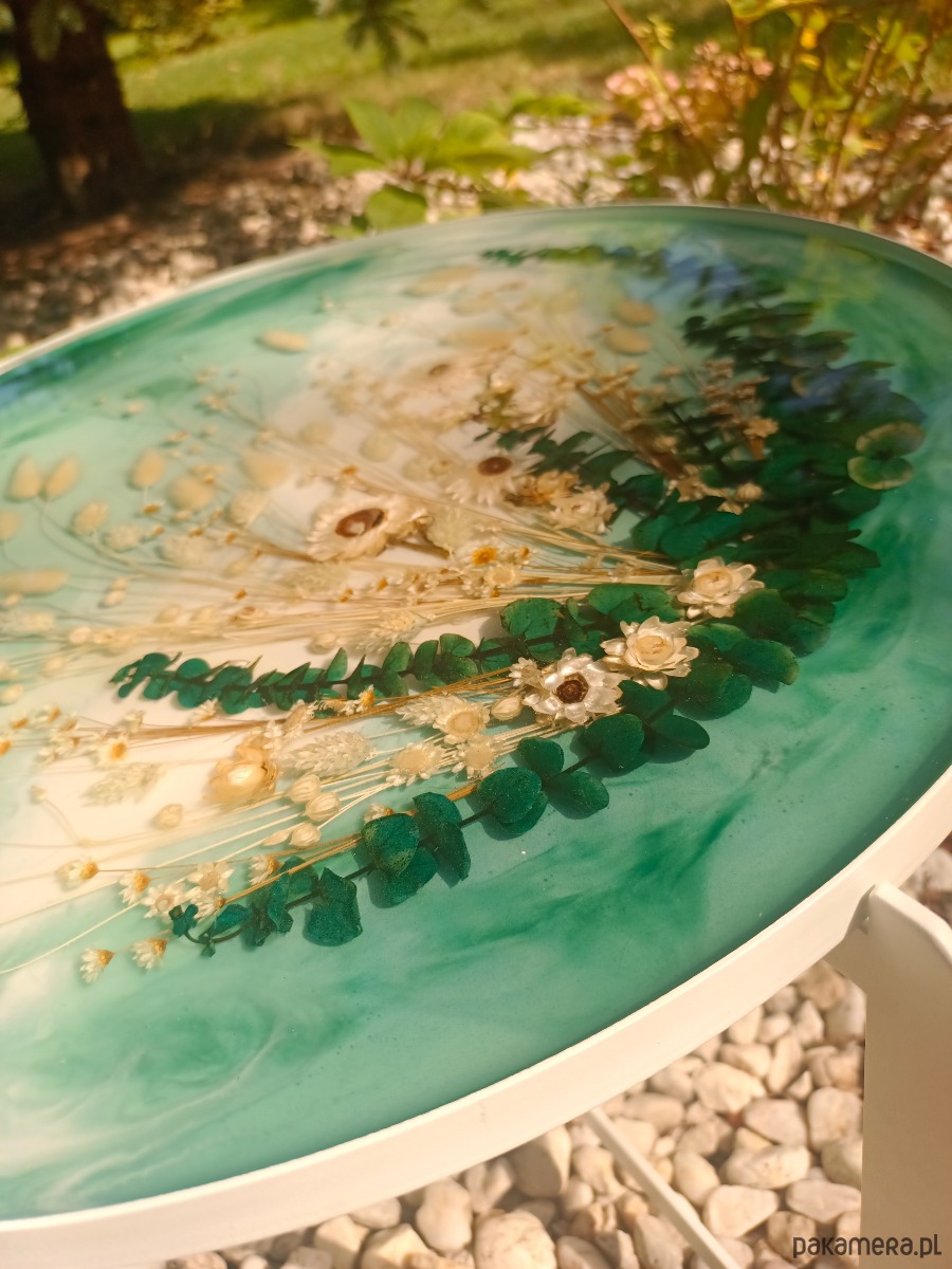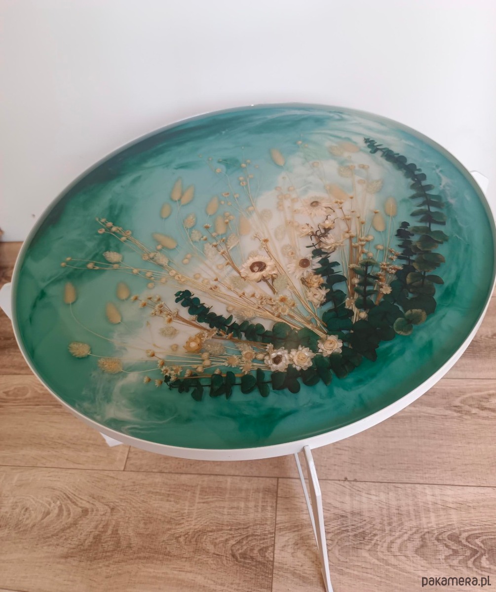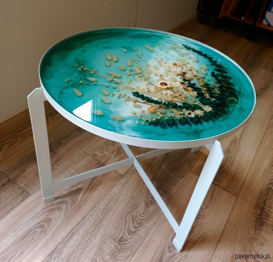 💠 Elegancki stolik kawowy z białymi elementami metalowymi z kompozycją kwiatową zamkniętą w żywicy epoksydowej. Jego klimat przenosi nas do letniego ogrodu. Stolik swoim wyglądem przyciąga wzrok i może być doskonałą ozdobą domu lub prezentem.