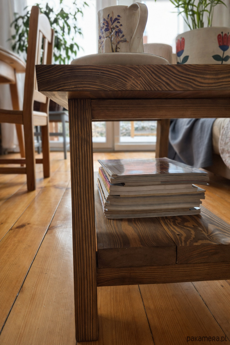 Ten stolik kawowy to potężny kawał drewna, który realnie zmienia charakter wnętrza. Wykonany z grubych, solidnych belek, w całości z litego drewna, przyciąga wzrok naturalną strukturą i wyrazistym usłojeniem.