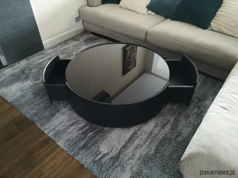 Elegancki stolik kawowy z giętego drewna z dwiema pojemnymi szufladami. Funkcję blatu pełni tutaj tafla ze szkła barwionego w masie tzw. antisol. Użycie litego drewna gwarantuje długoletnie użytkowanie i możliwość renowacji, dzięki czemu nawet po wielu latach stolik będzie wyglądał jak nowy.