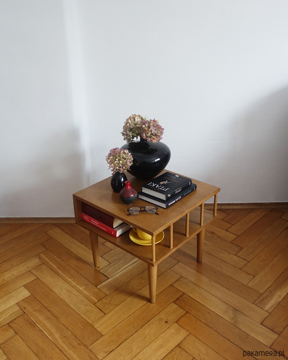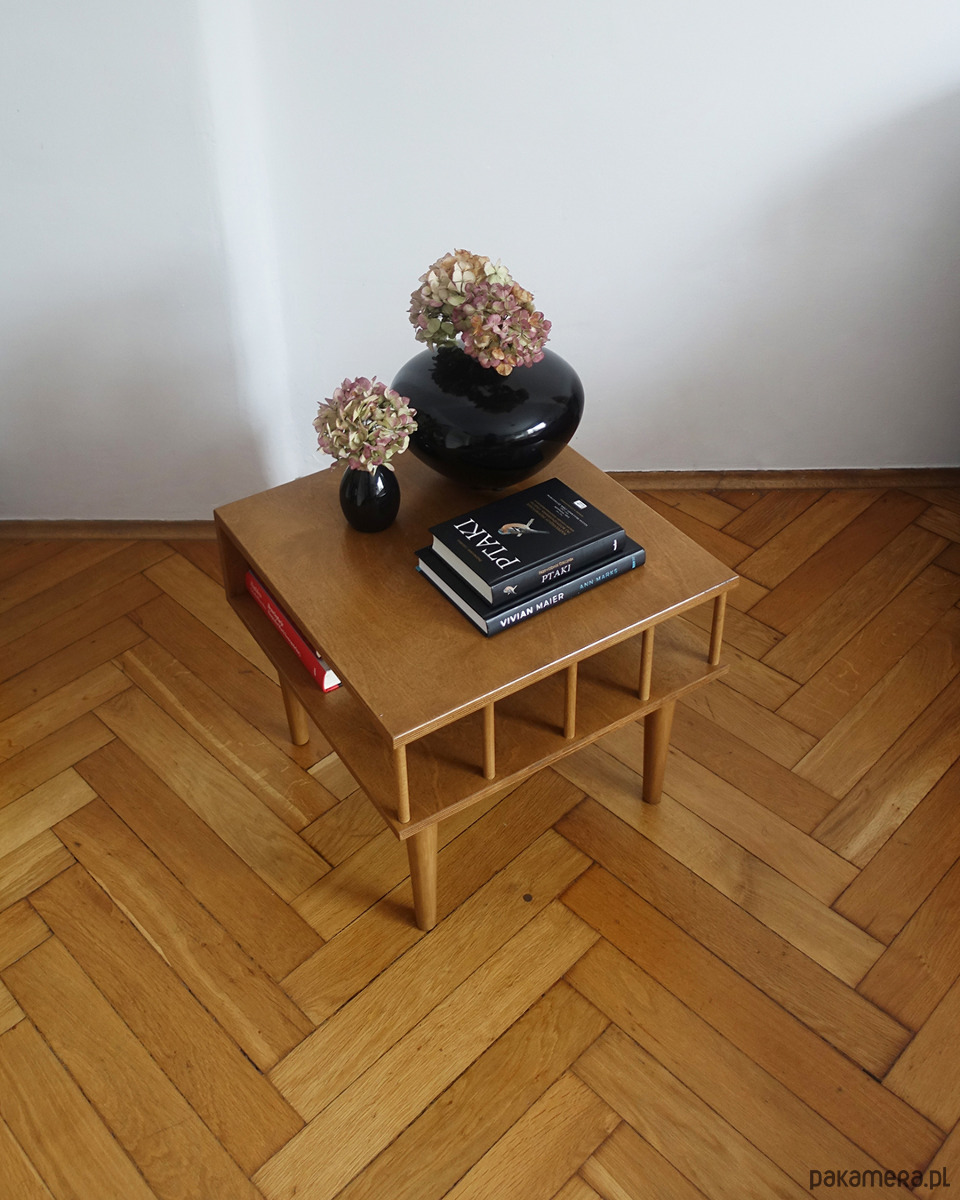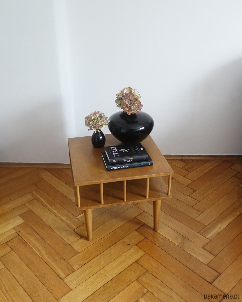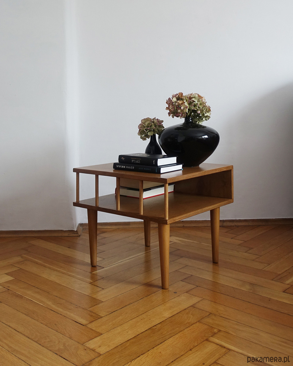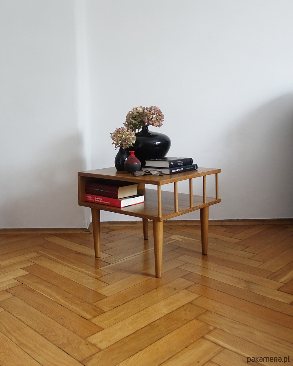 Stolik został kilkukrotnie polakierowany ekologicznym lakierem wodnym w odcieniu dębu.