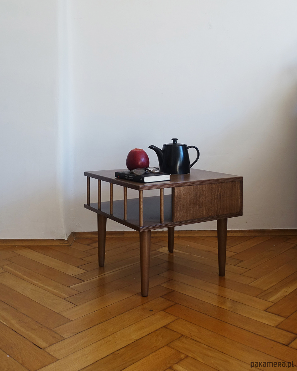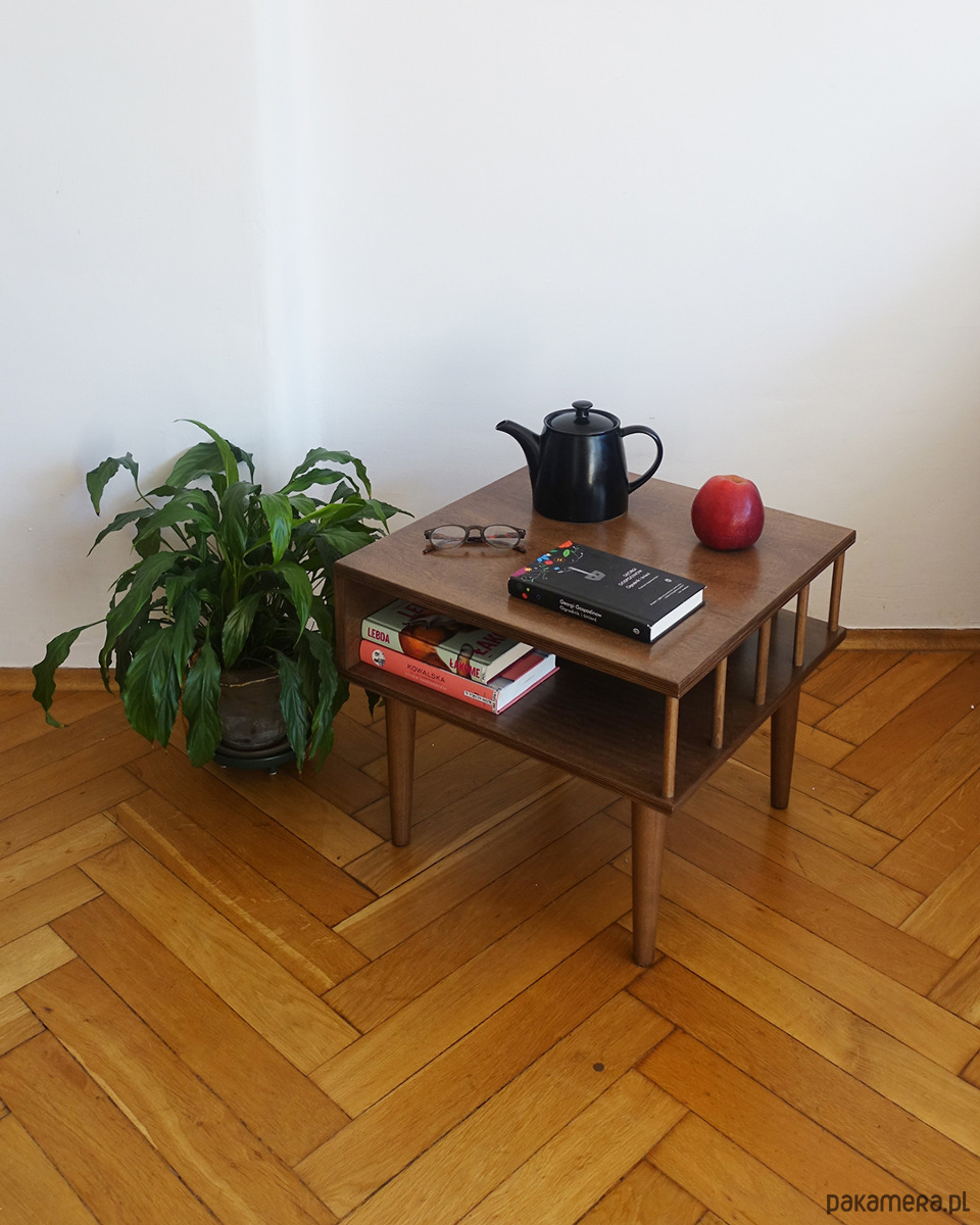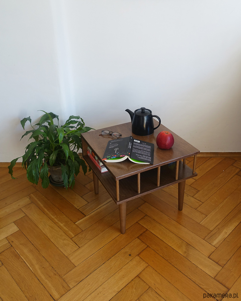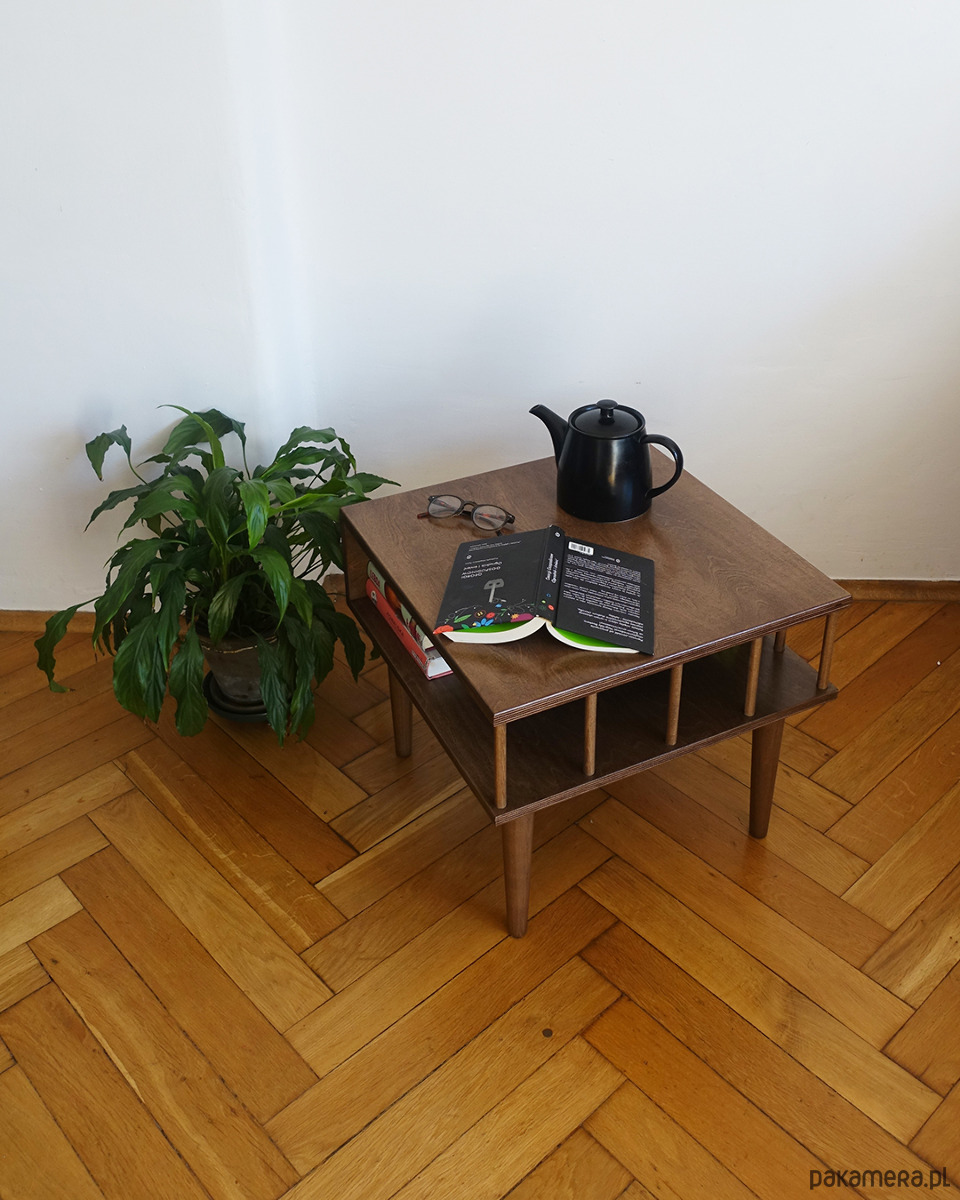Stolik został kilkukrotnie polakierowany ekologicznym lakierem wodnym w odcieniu ciemnego dębu